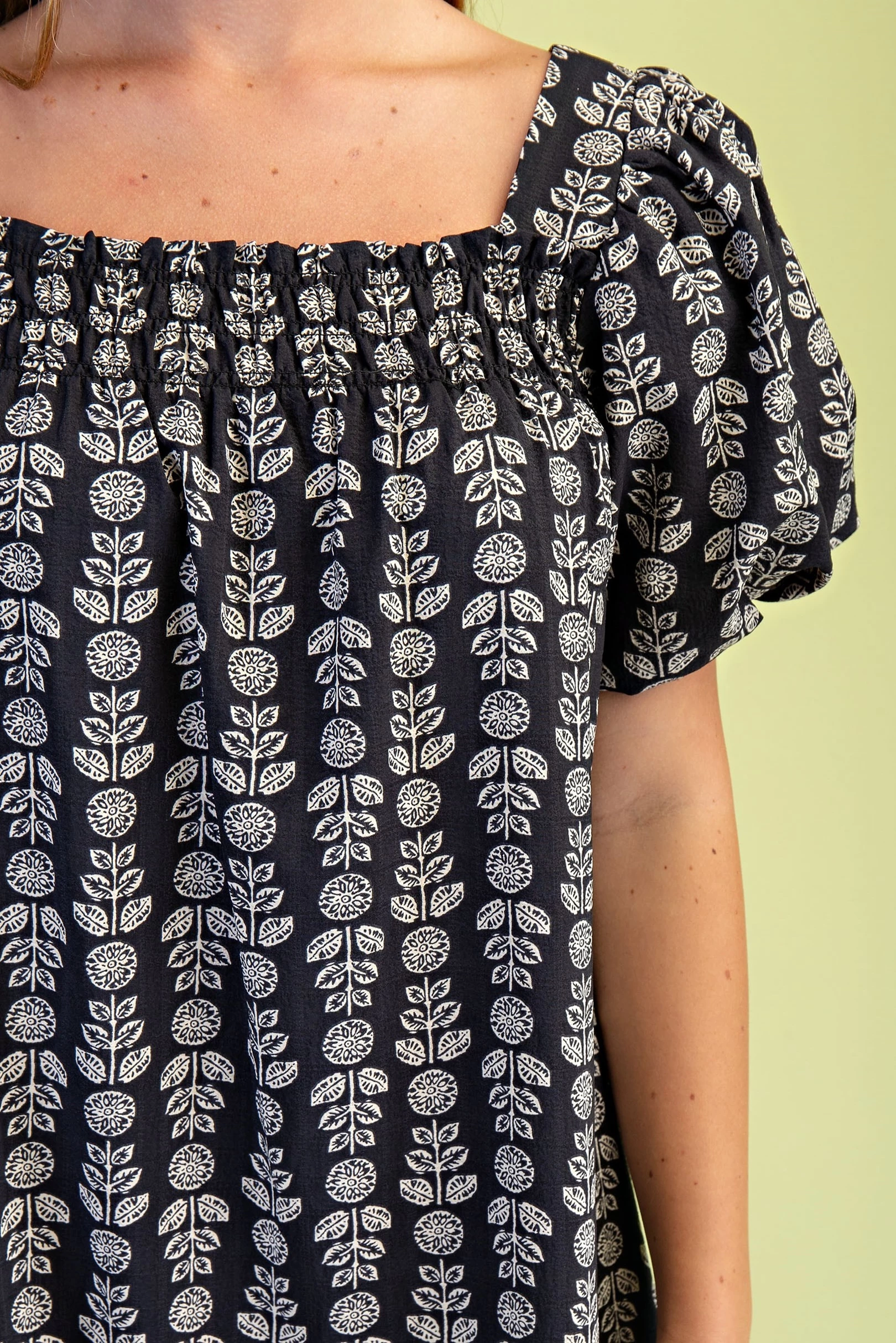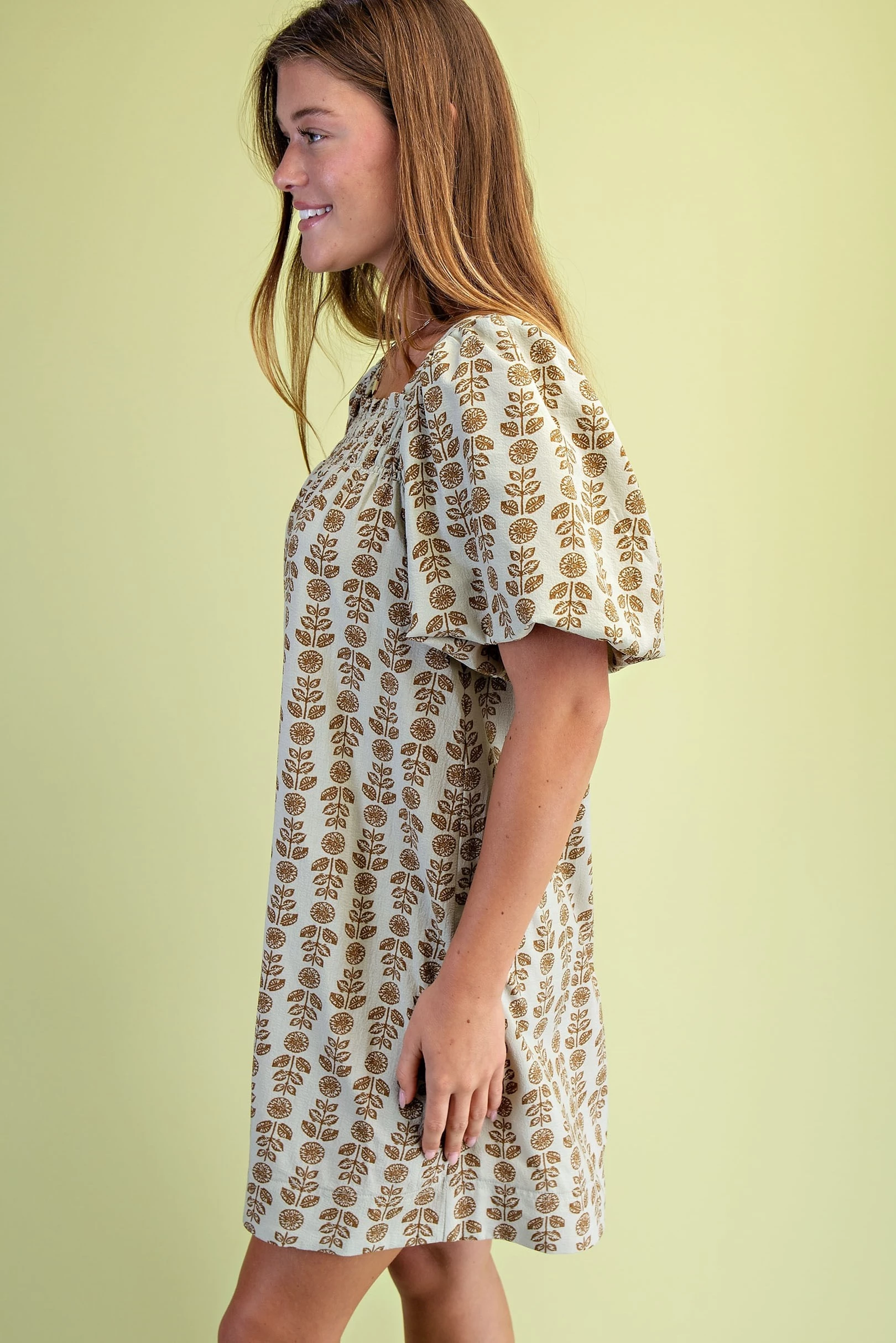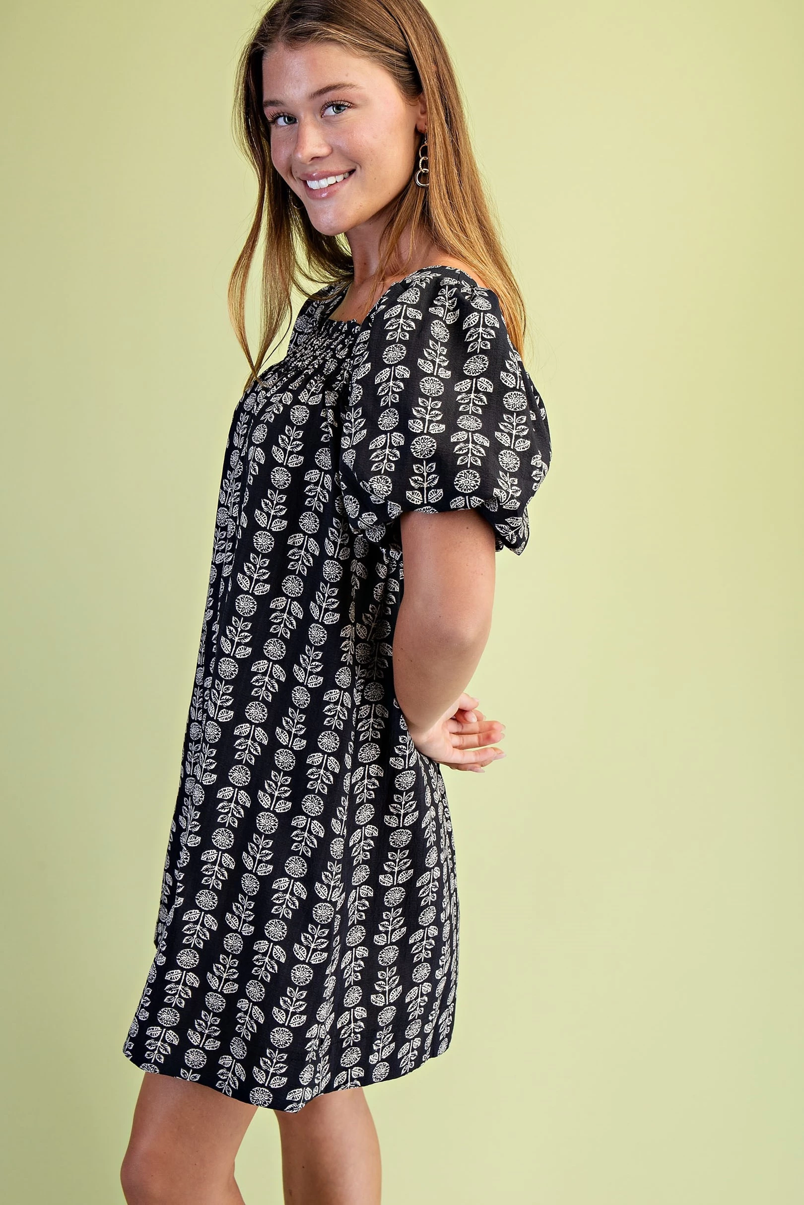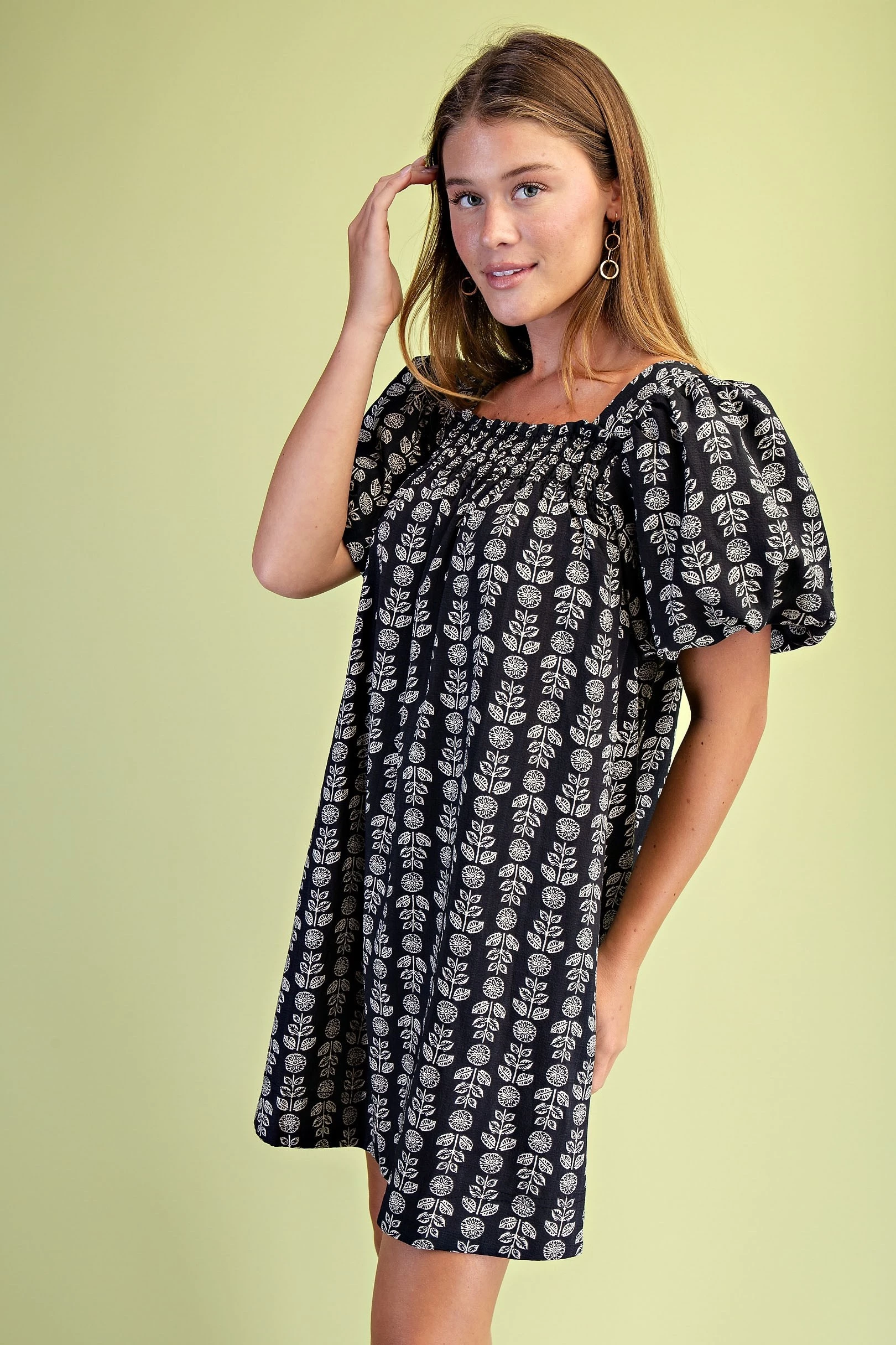Palm and Hibiscus Print Half Button Dress with Short Puff Sleeves and a Ruffled Neck. The Dress is Lined