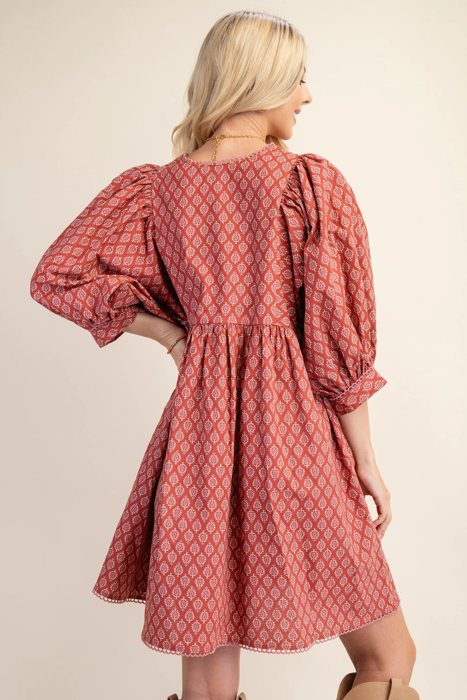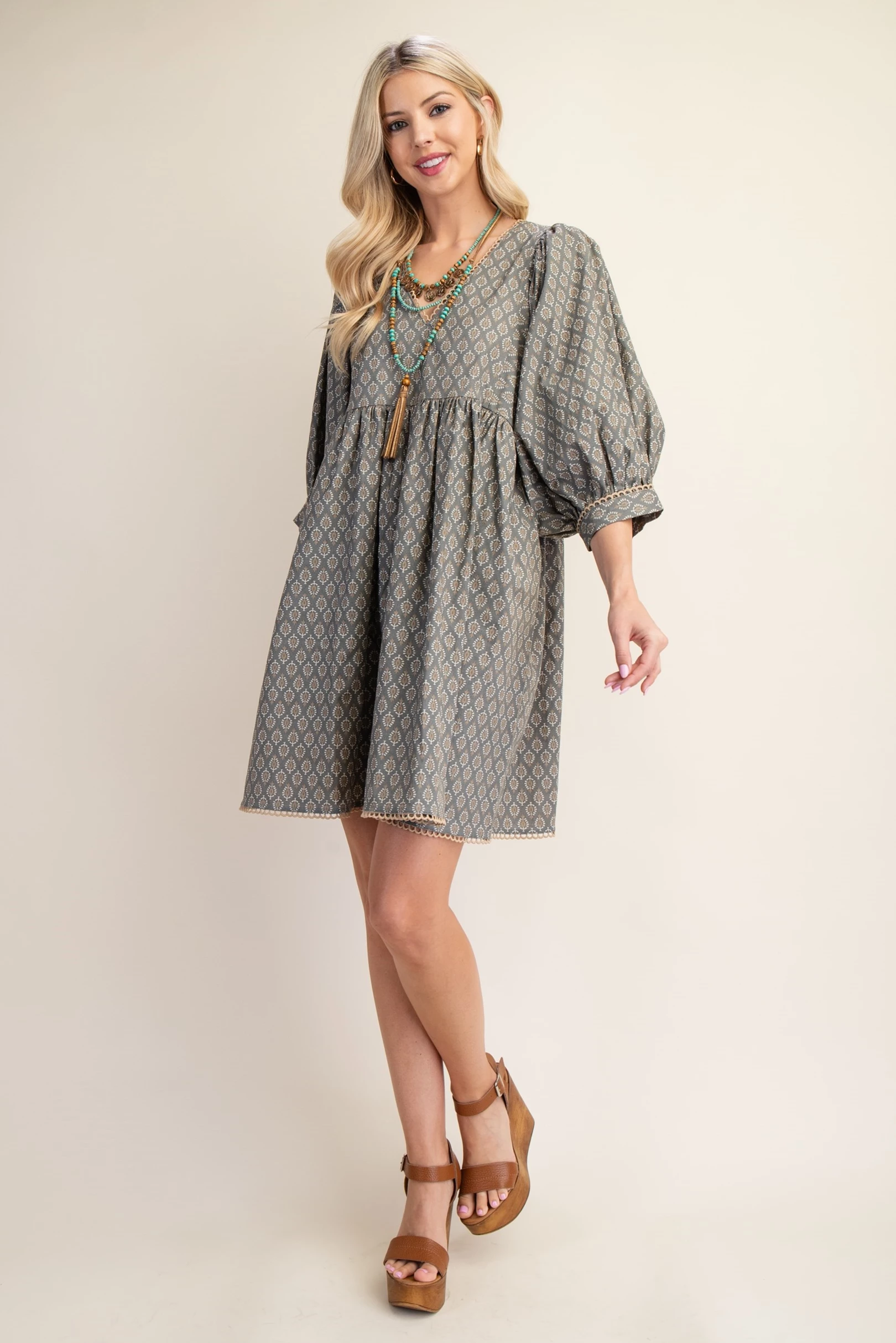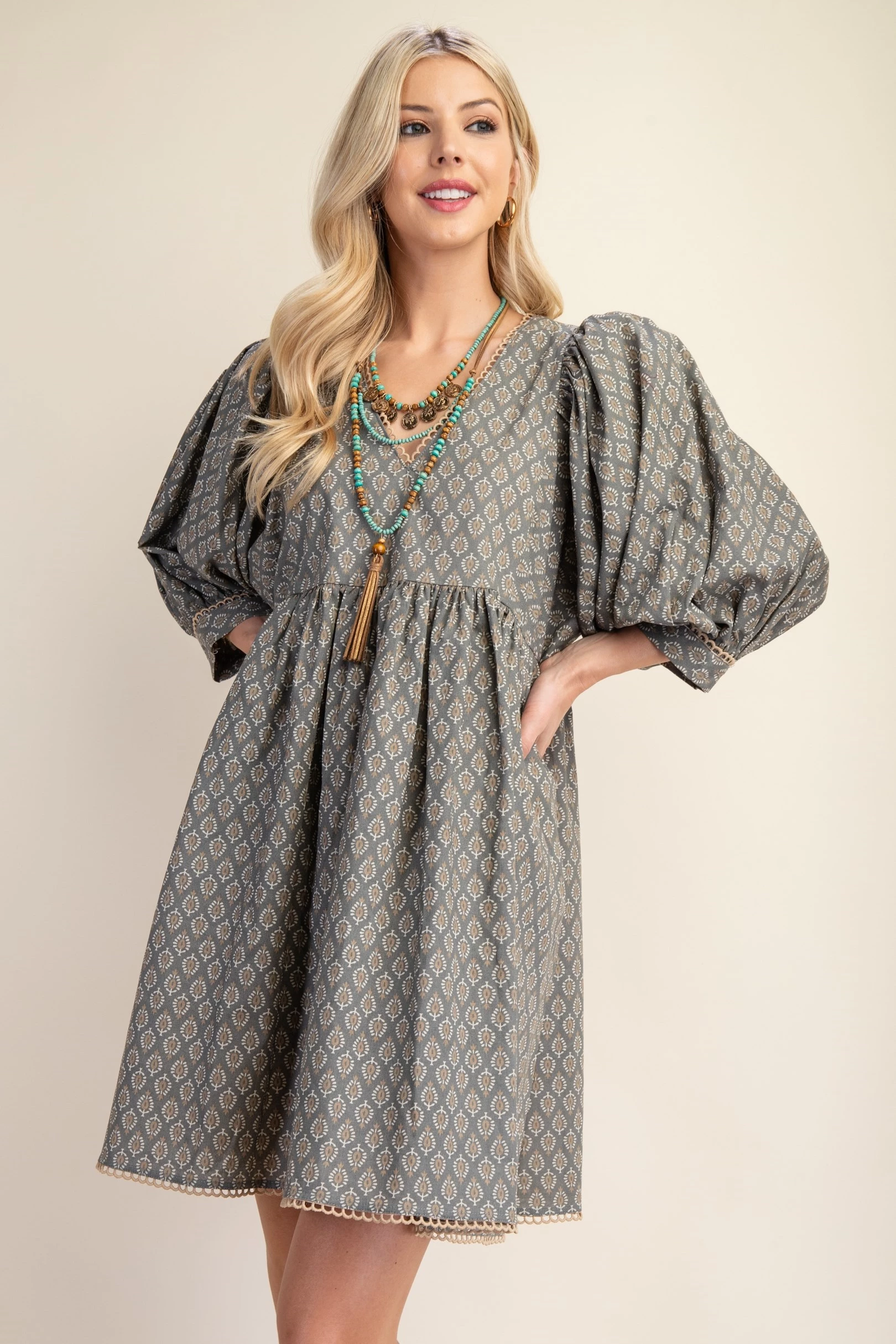 Printed Mini Babydoll Dress with Puff Sleeves and a Lace Trim