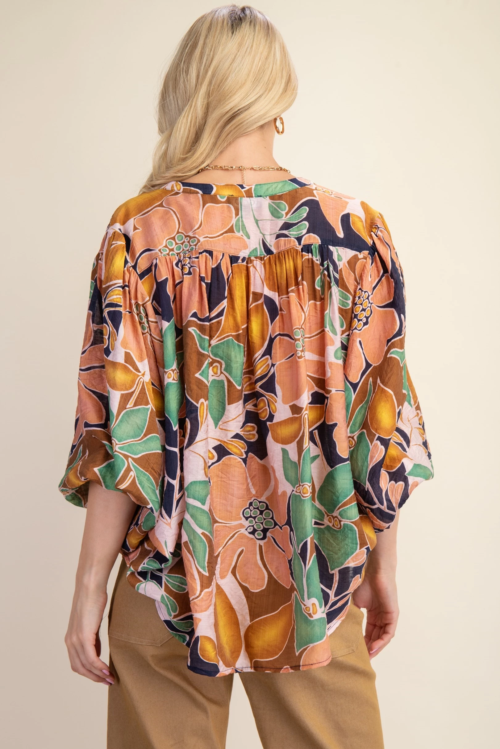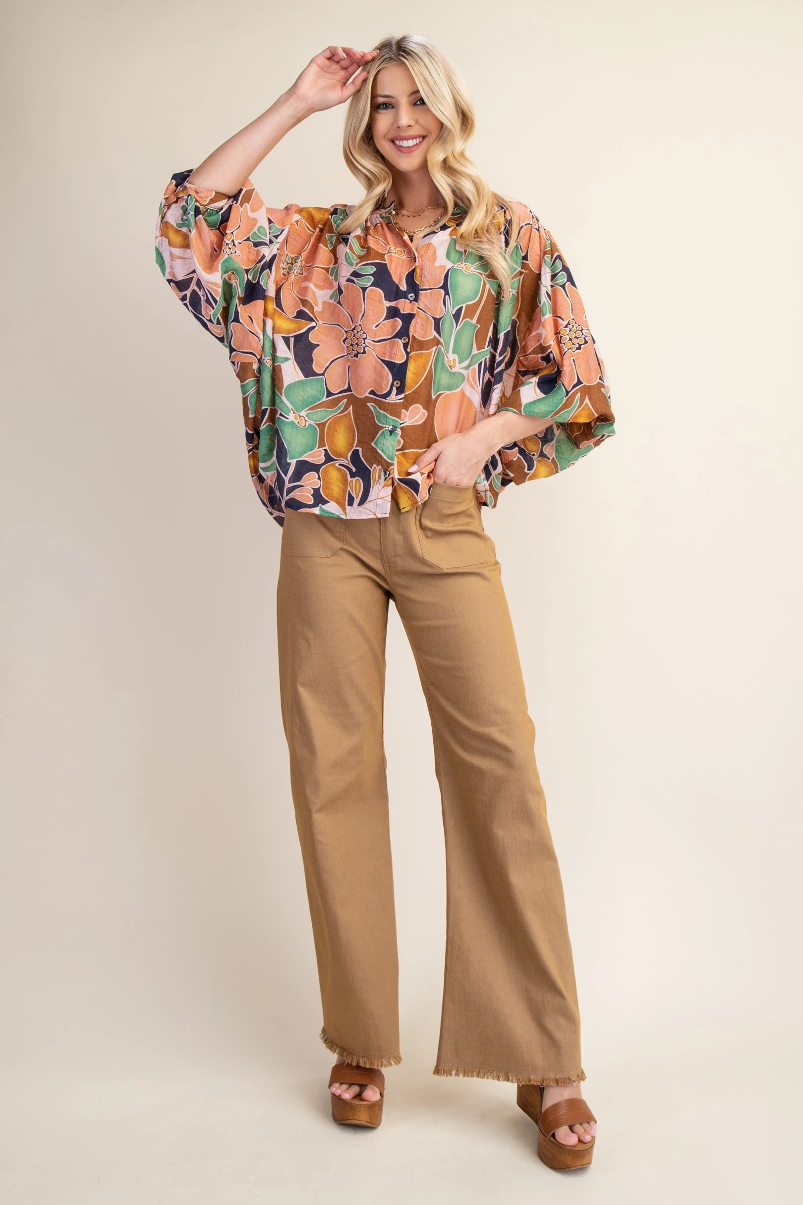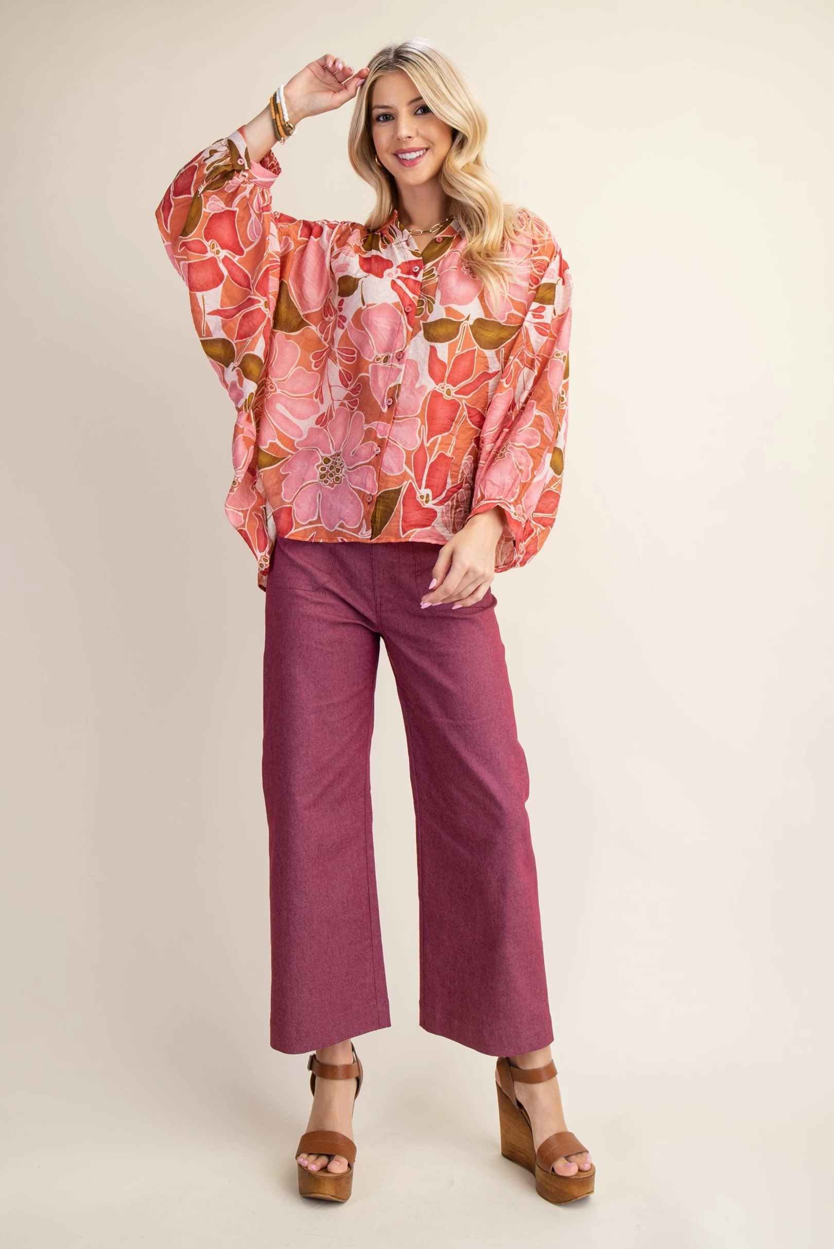 Batwing Blouse with Mandarin Collar and Fabric Covered Buttons