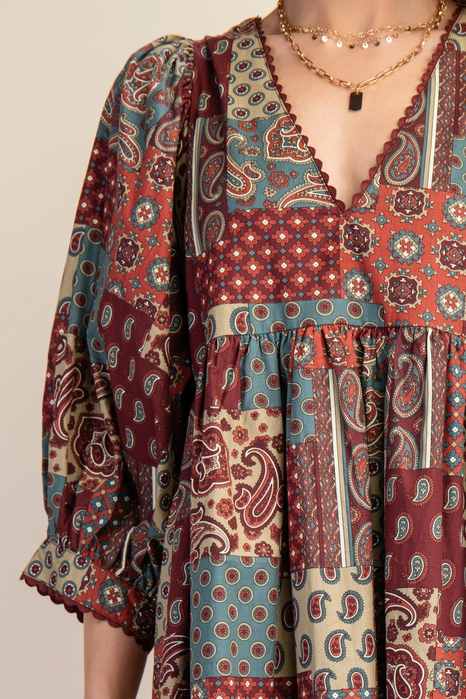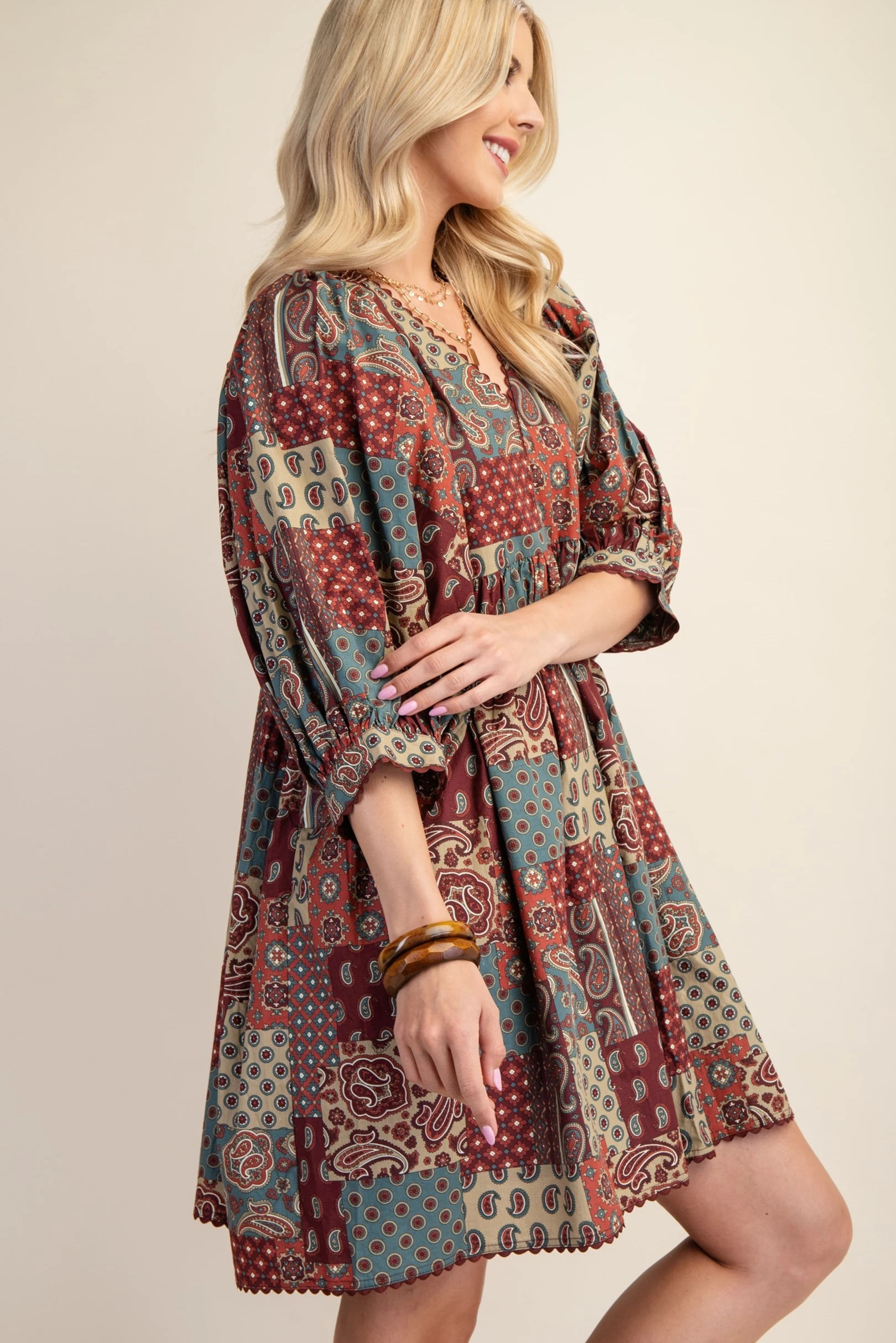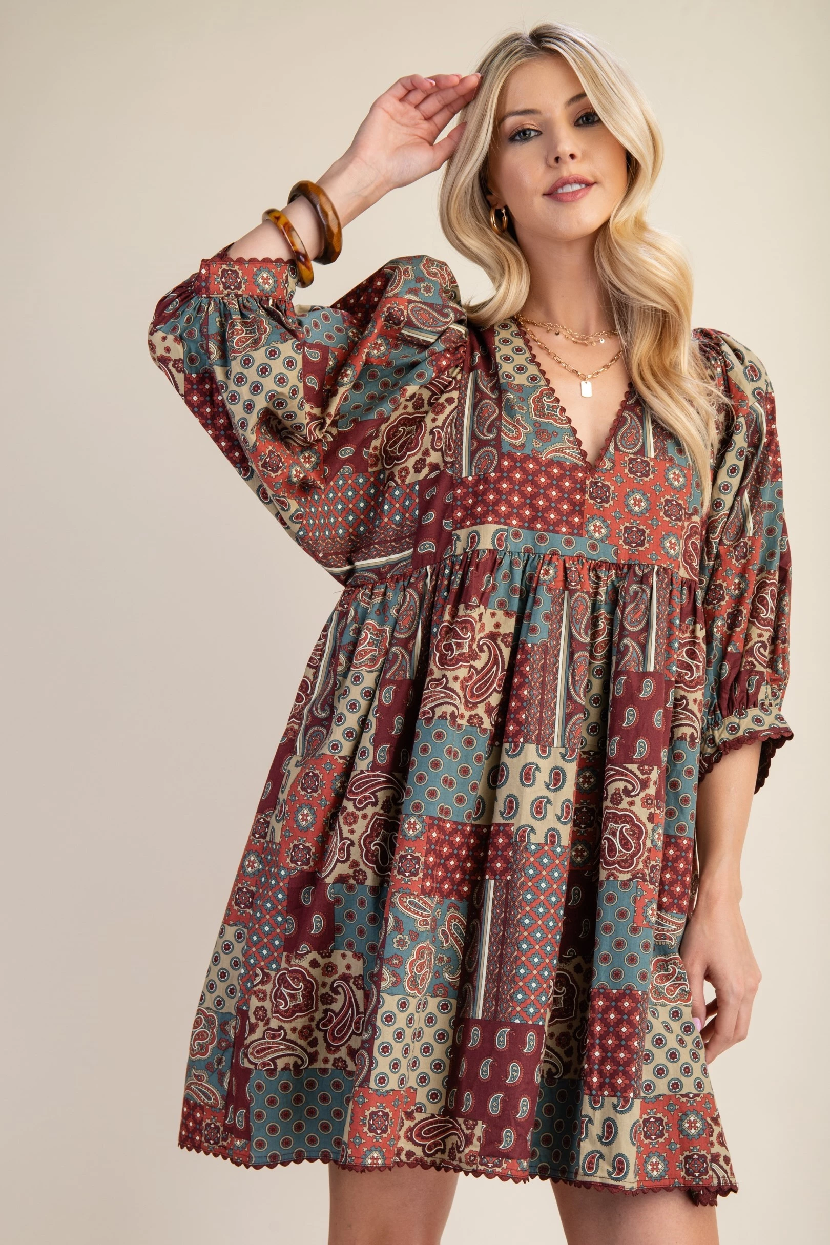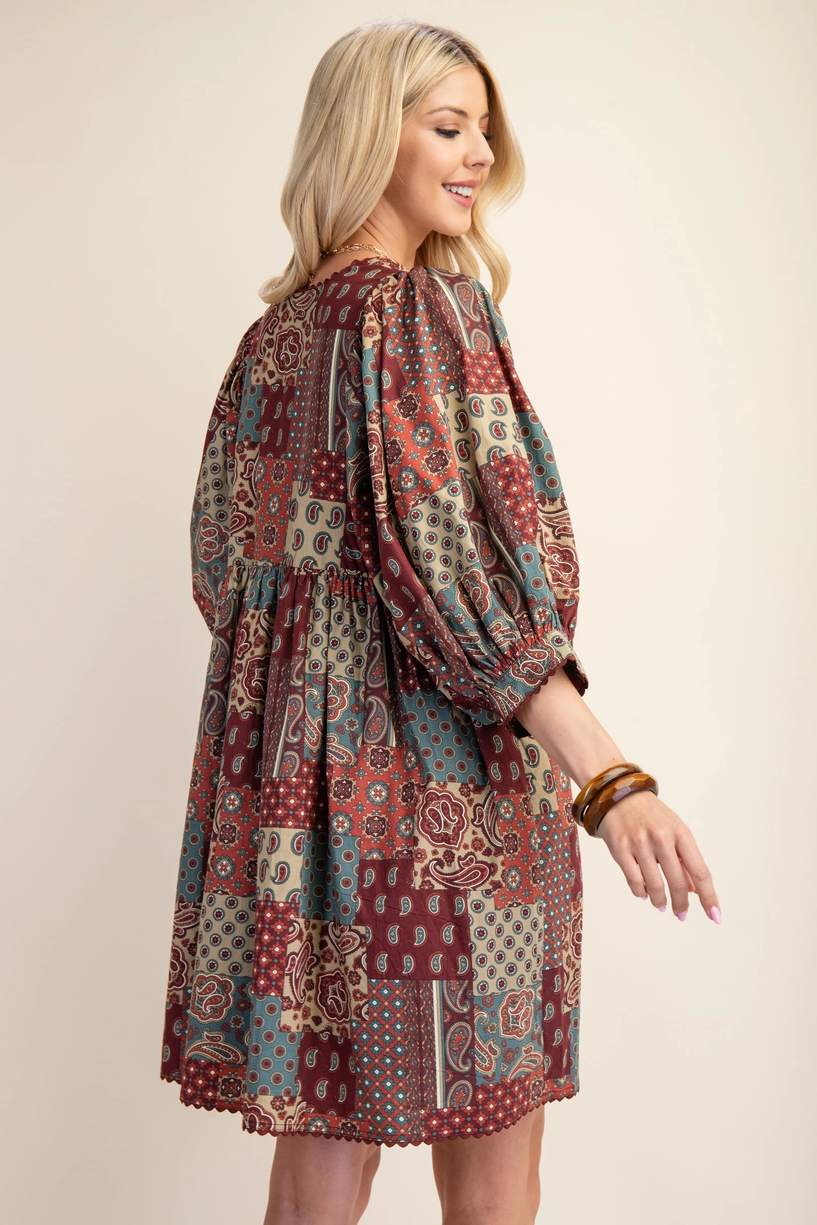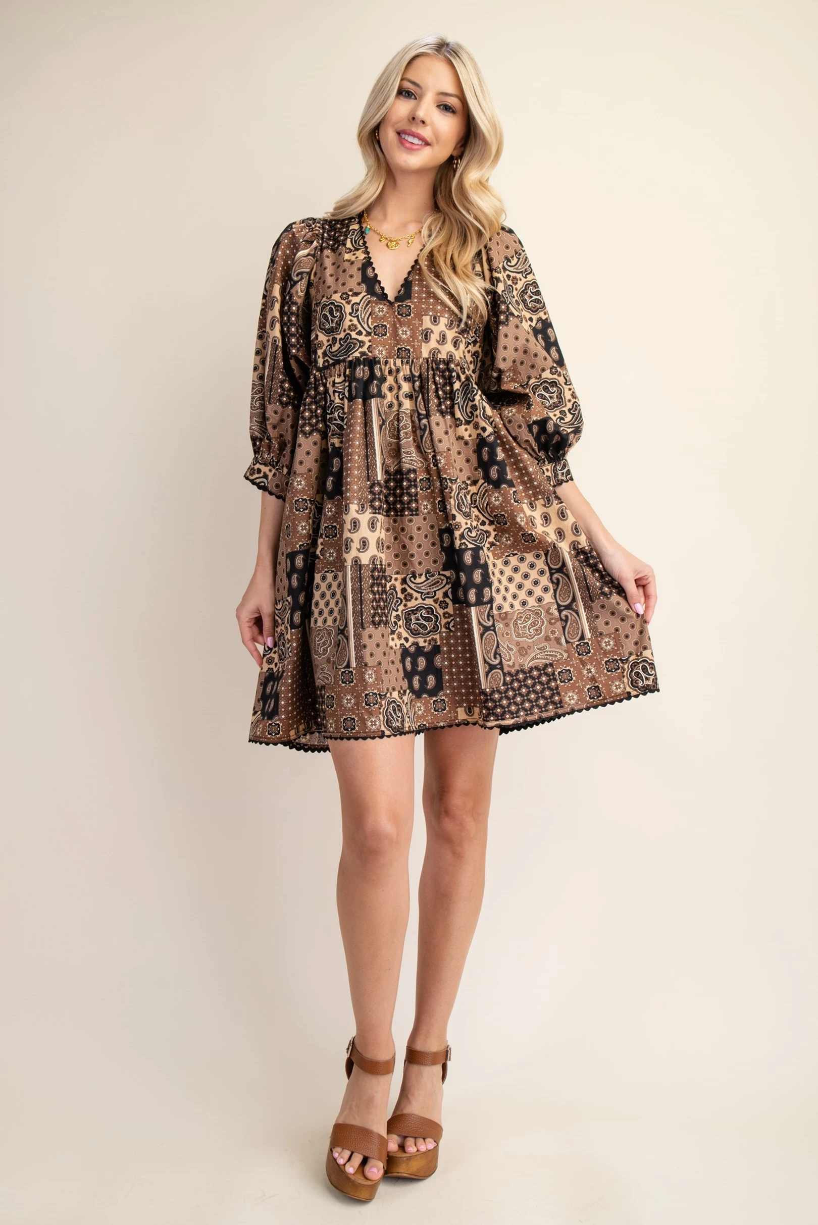 Paisley Print Mini Dress with Puff Sleeve and Ric-Rac Trim