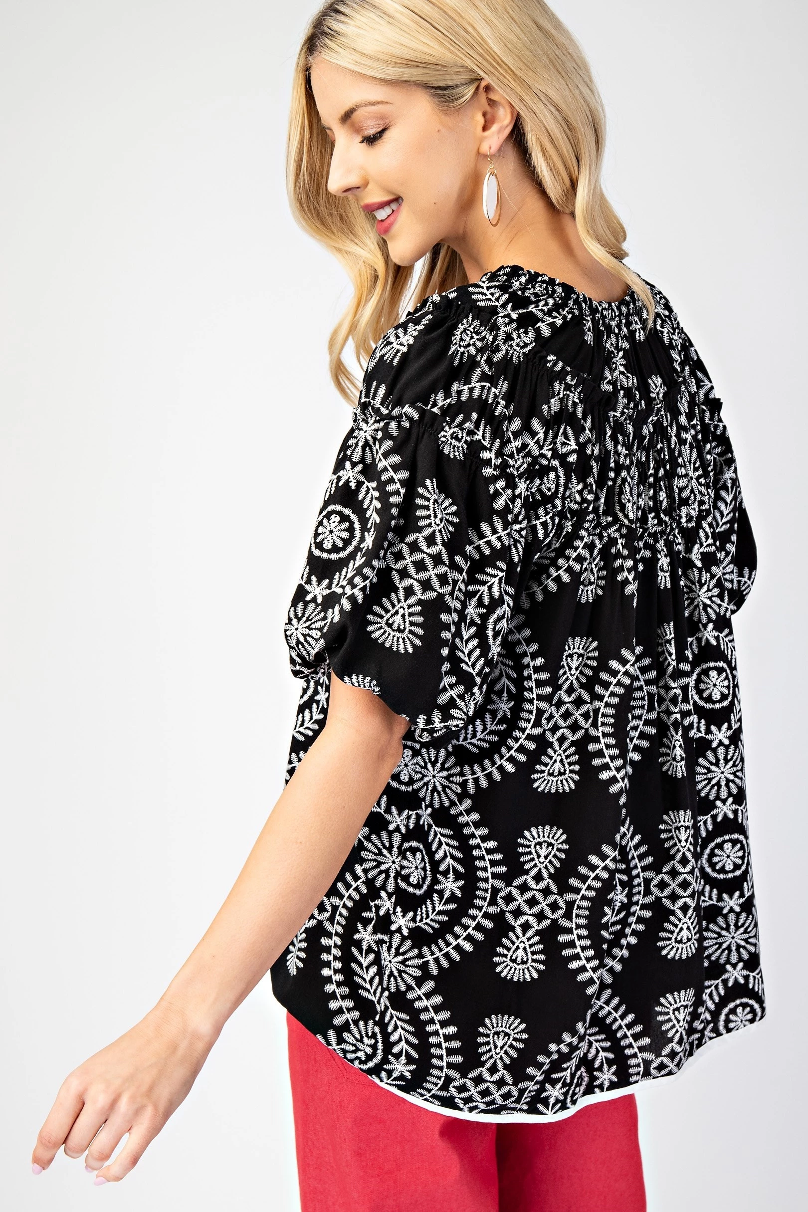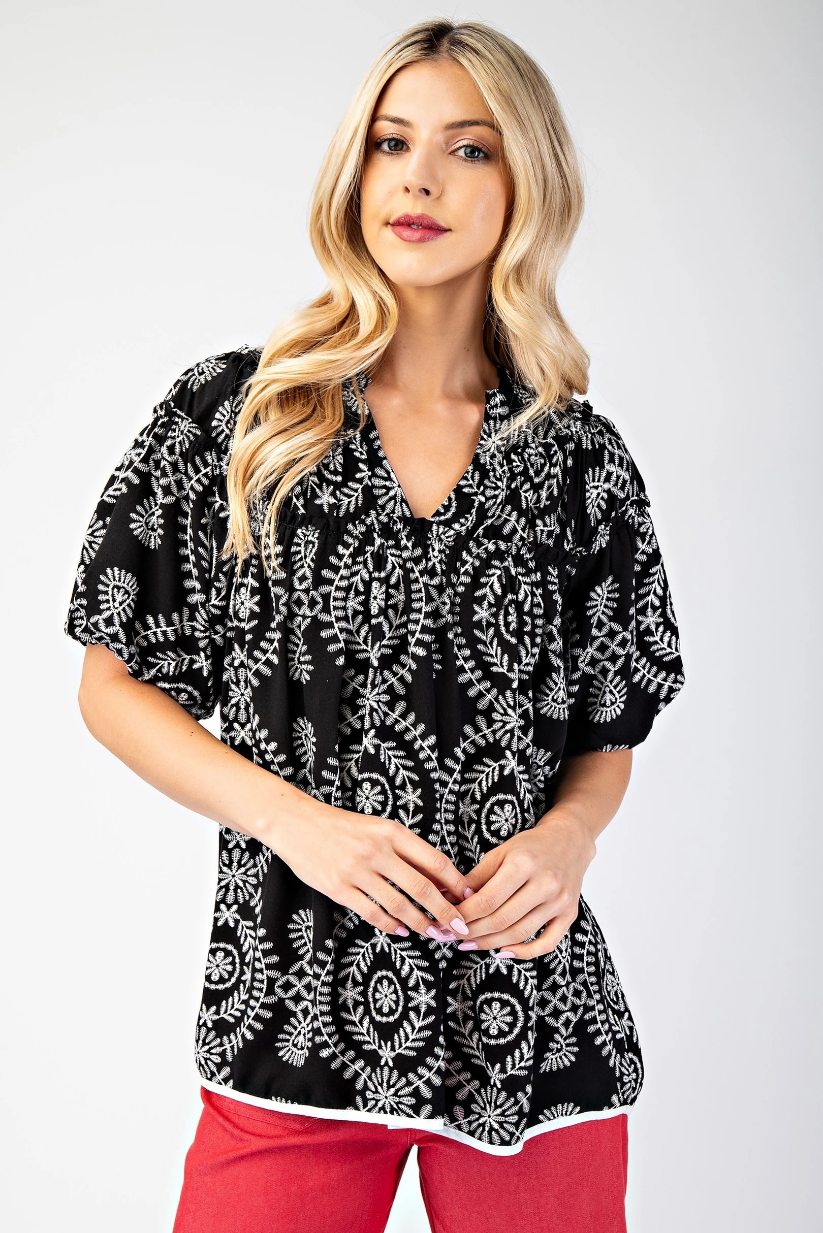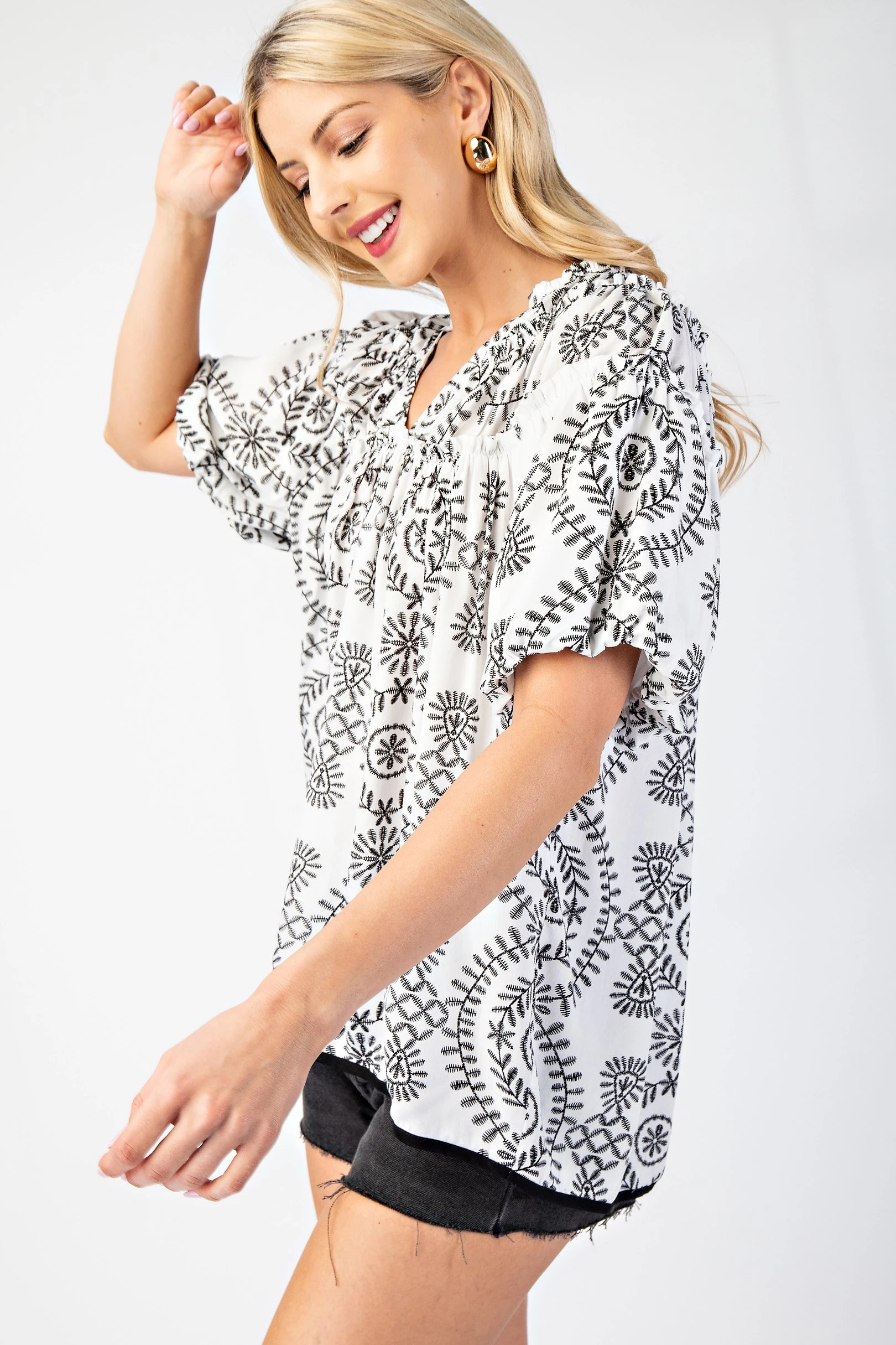 Short Puff Sleeve Top with Shirring and Ruffle Details
