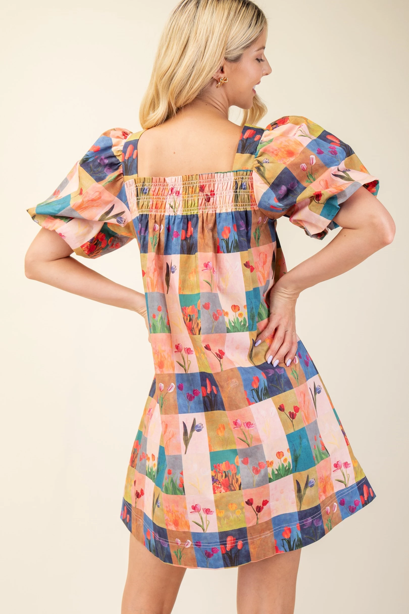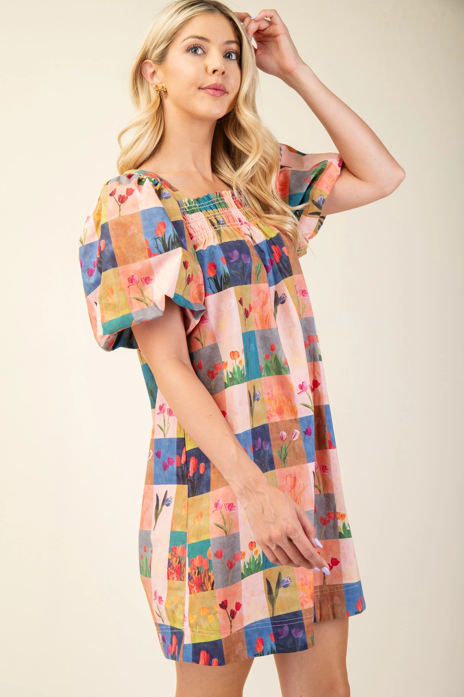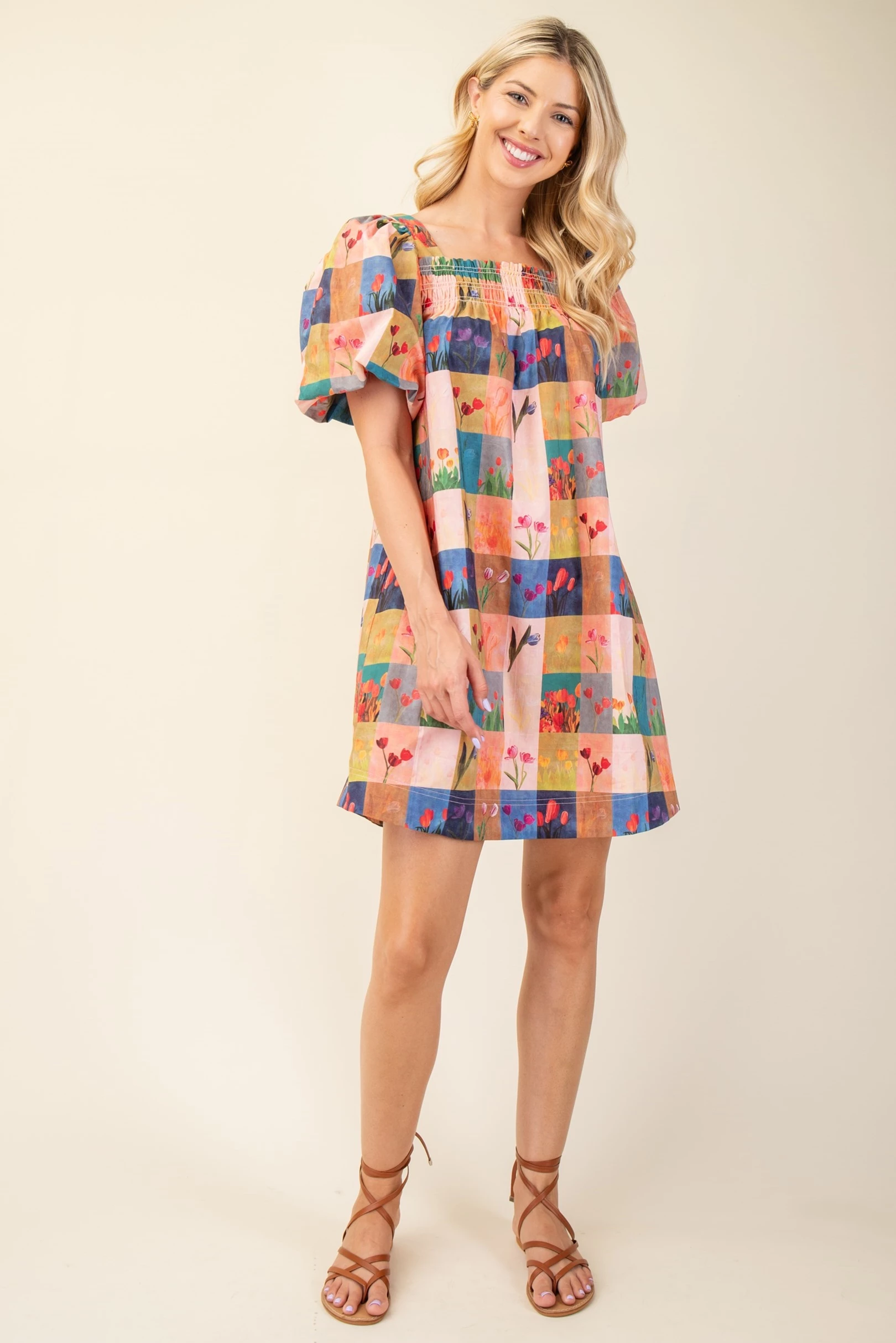 Puff Sleeve Mini Dress with Smocking on Back and Front Necklines