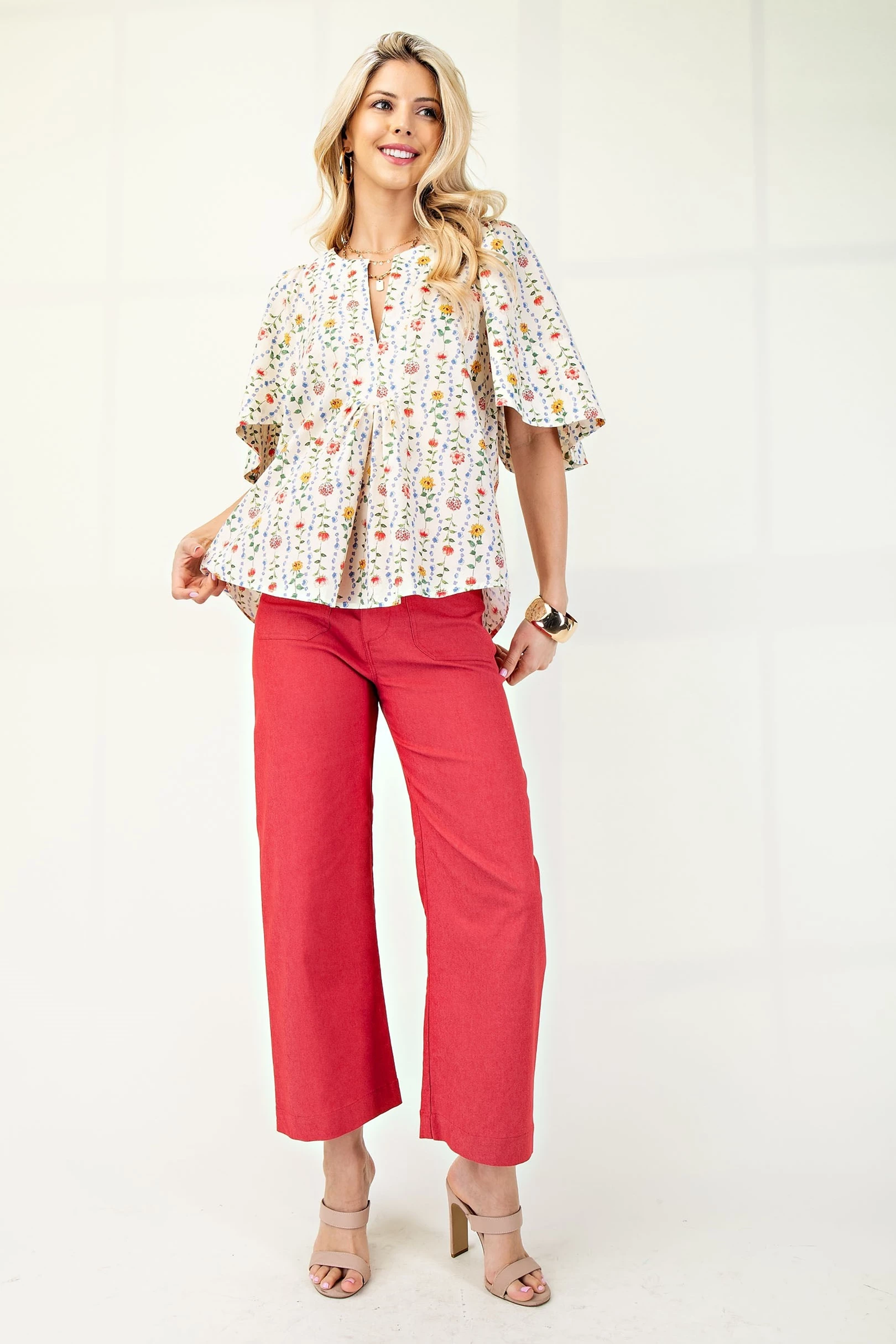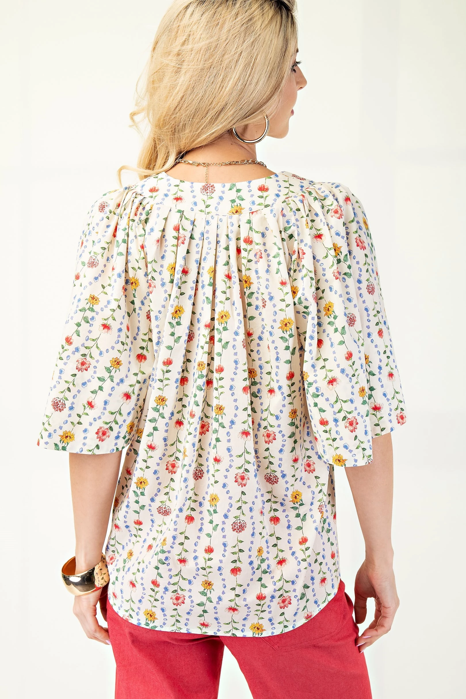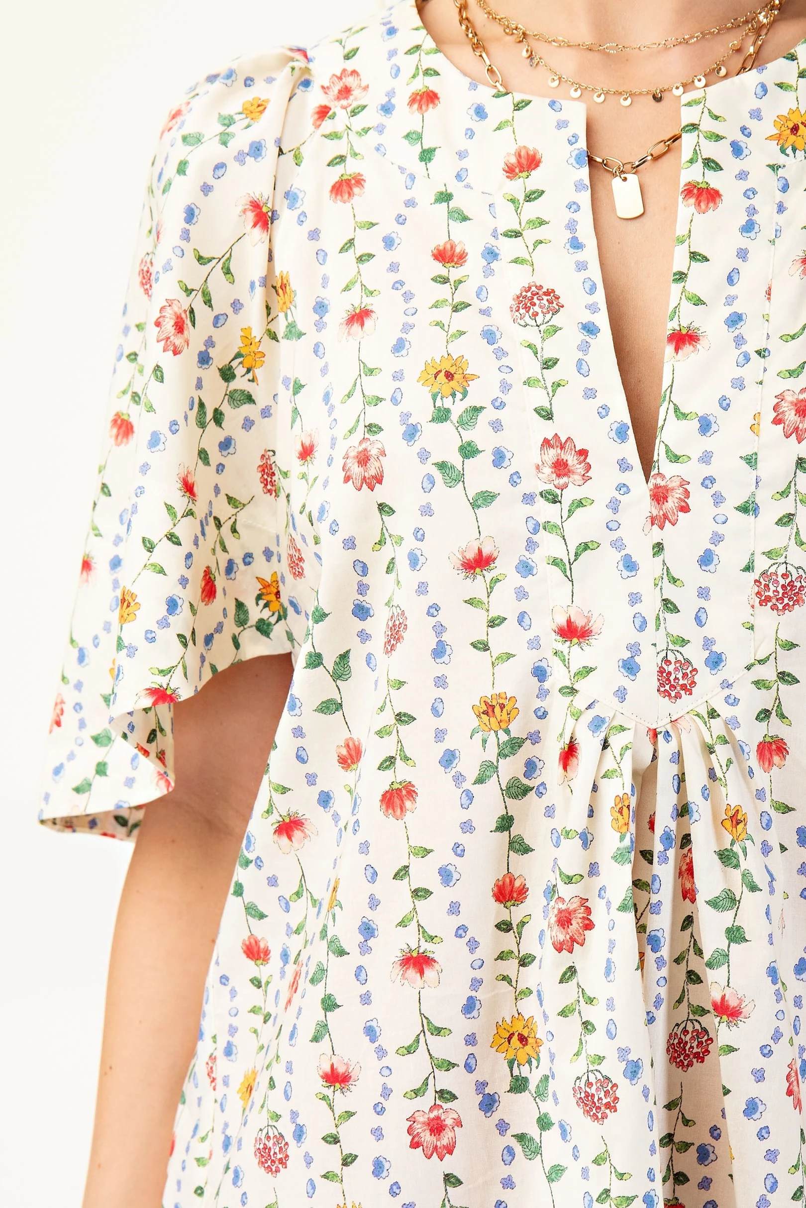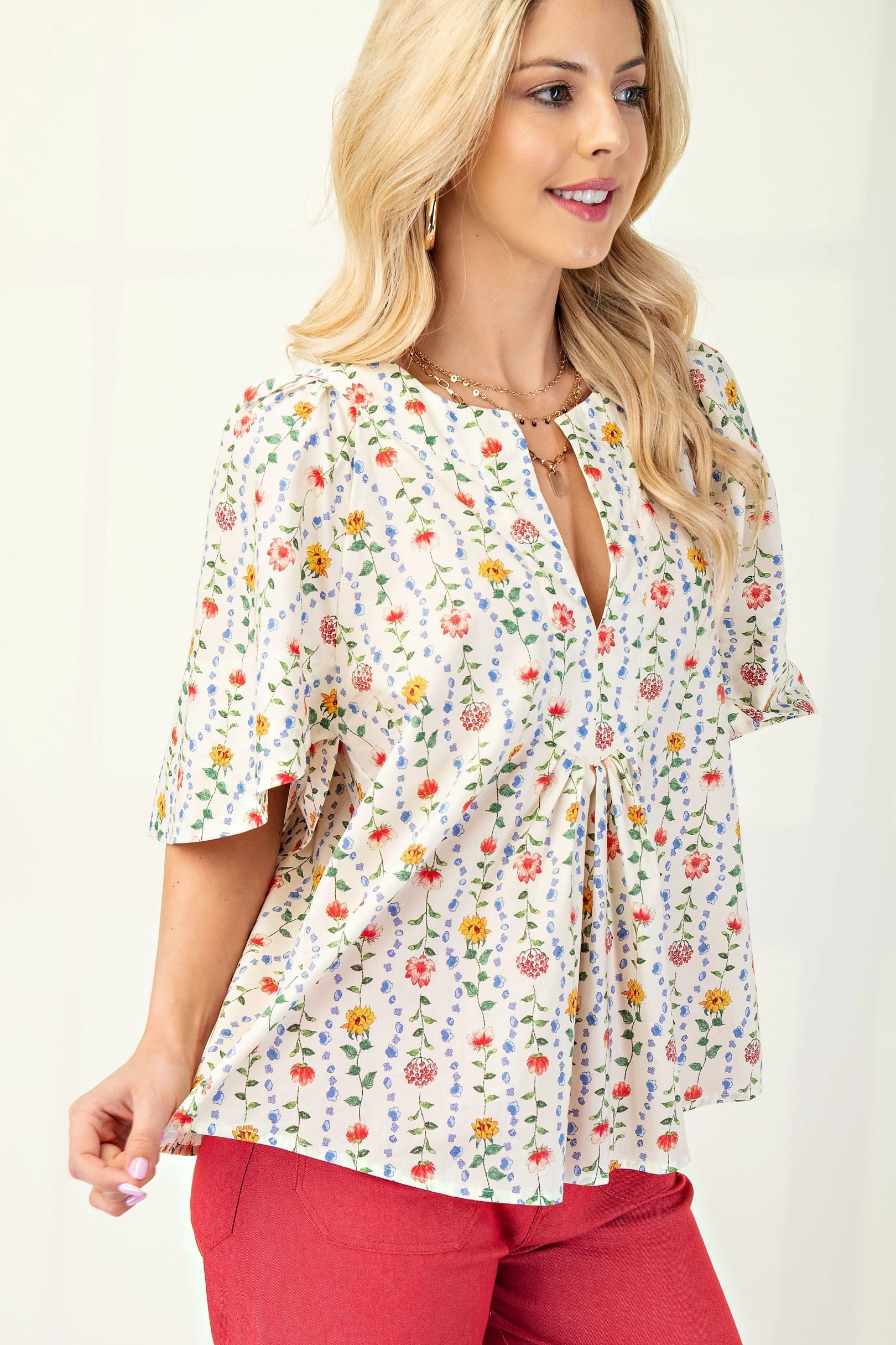 Floral Print Split Neck Top with Cape Sleeves and Pleat Detail