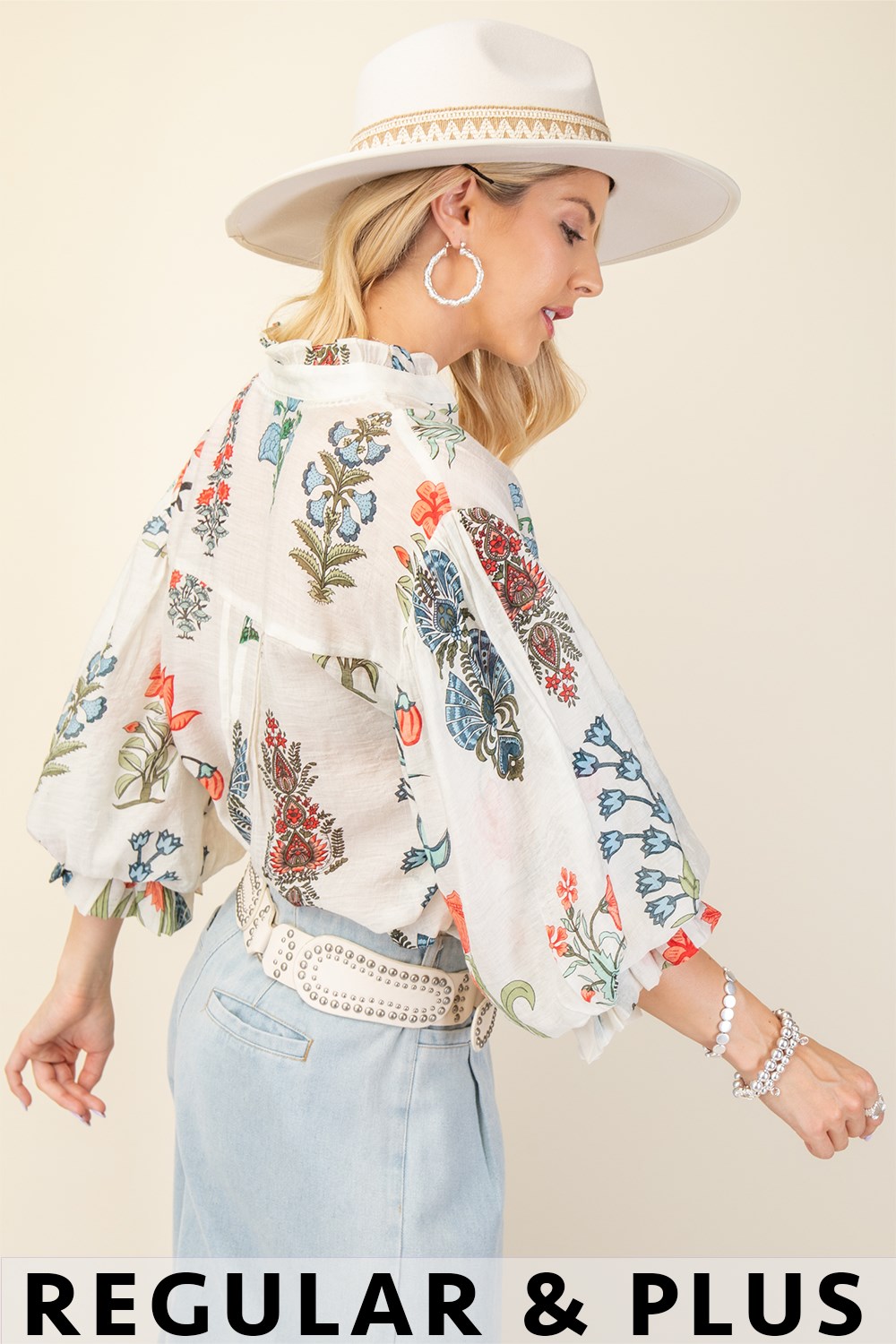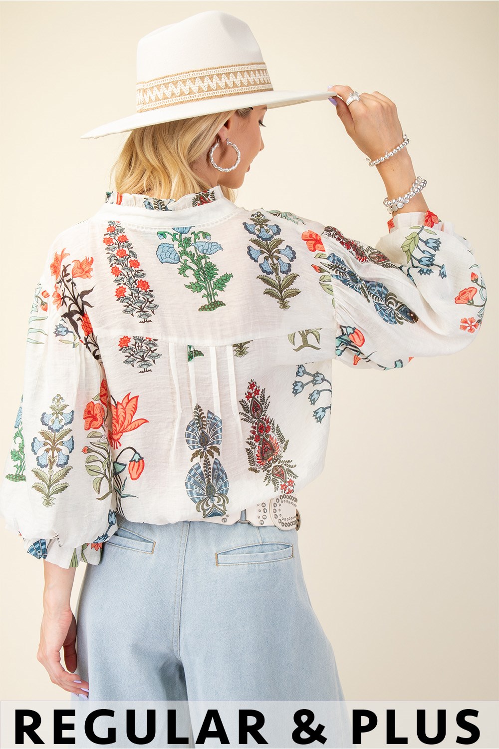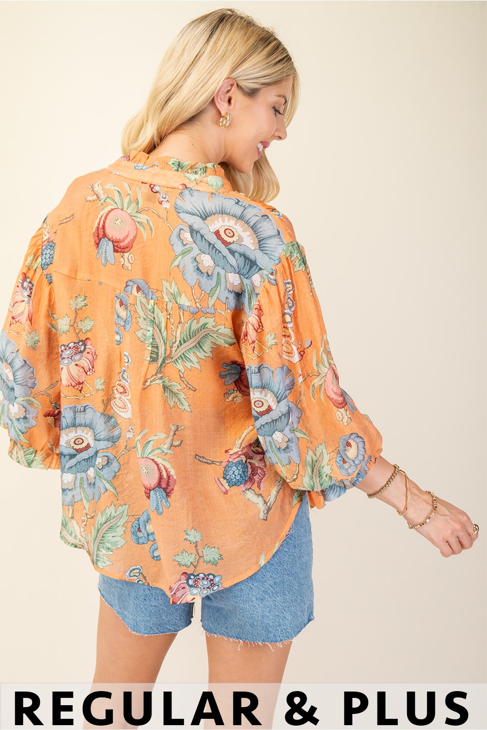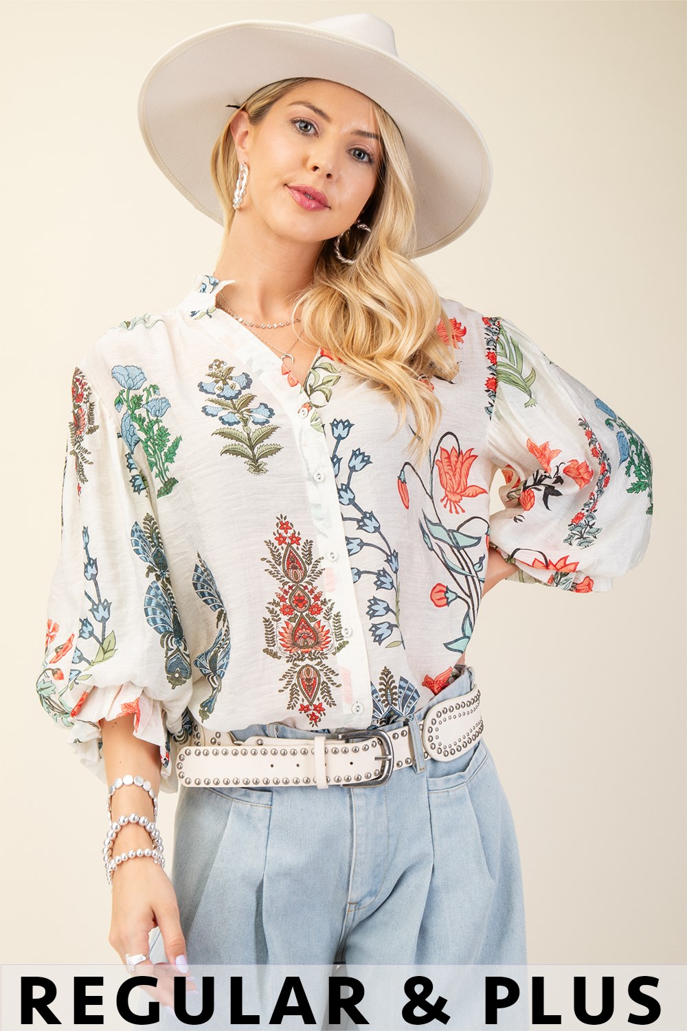 Floral Printed Button Down Top with 3/4 Length Gathered Balloon Sleeves