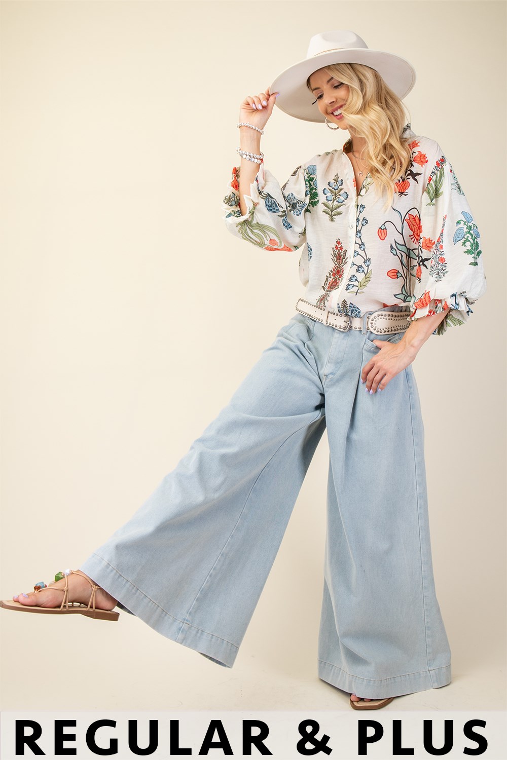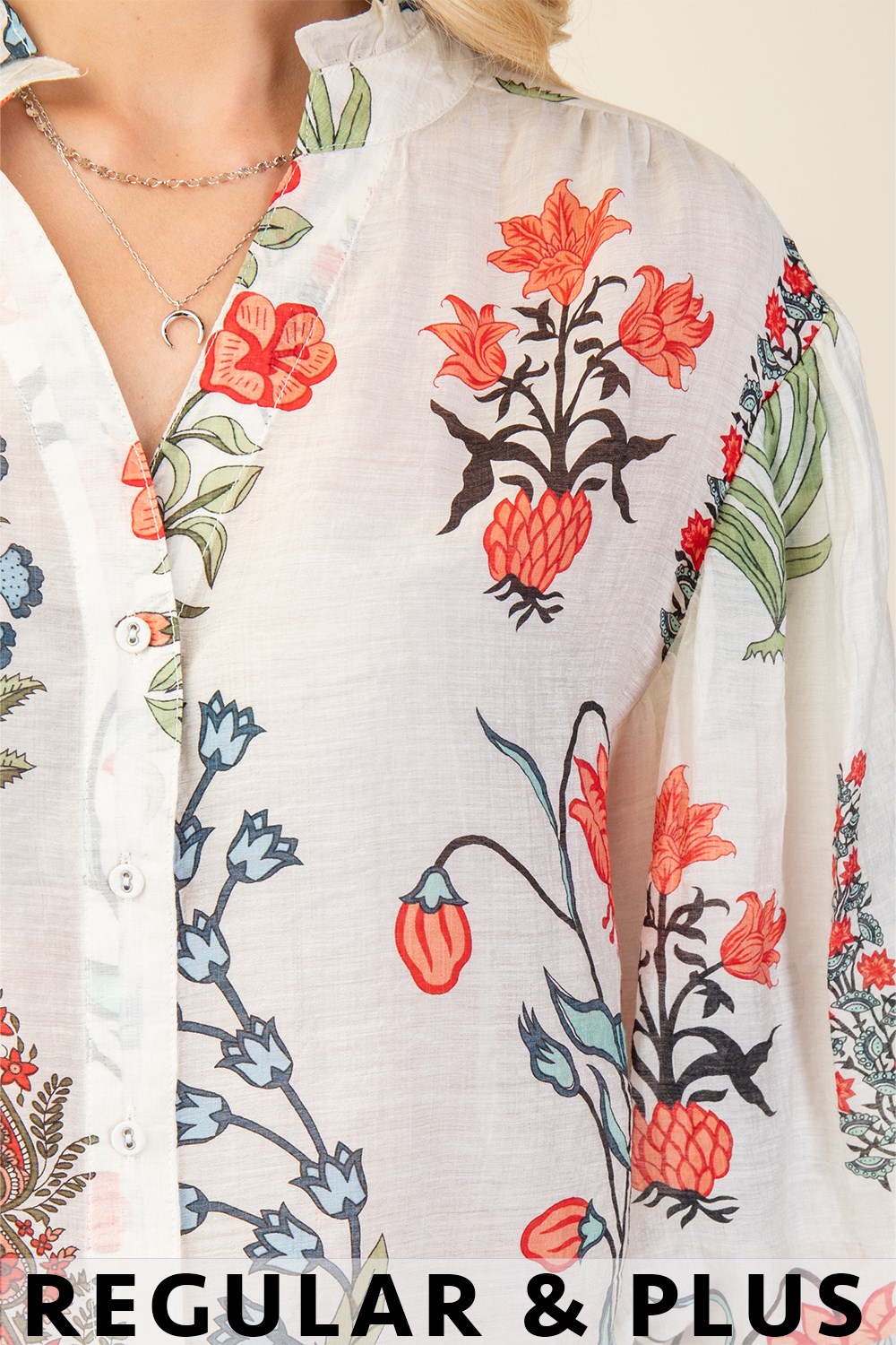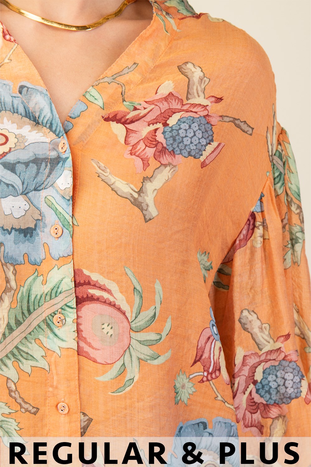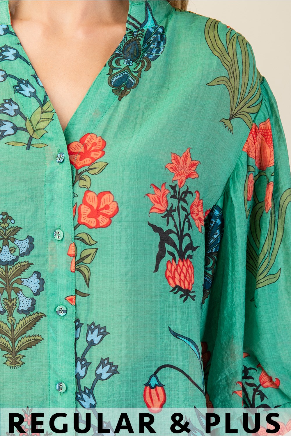 Floral Printed Button Down Top with 3/4 Length Gathered Balloon Sleeves