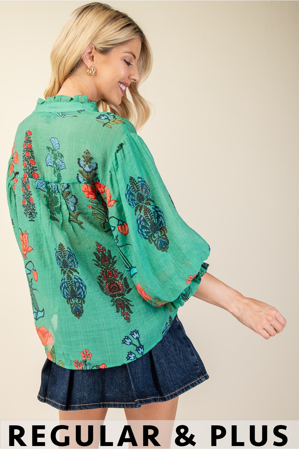 Printed Button Down Top with 3/4 Length Gathered Balloon Sleeves