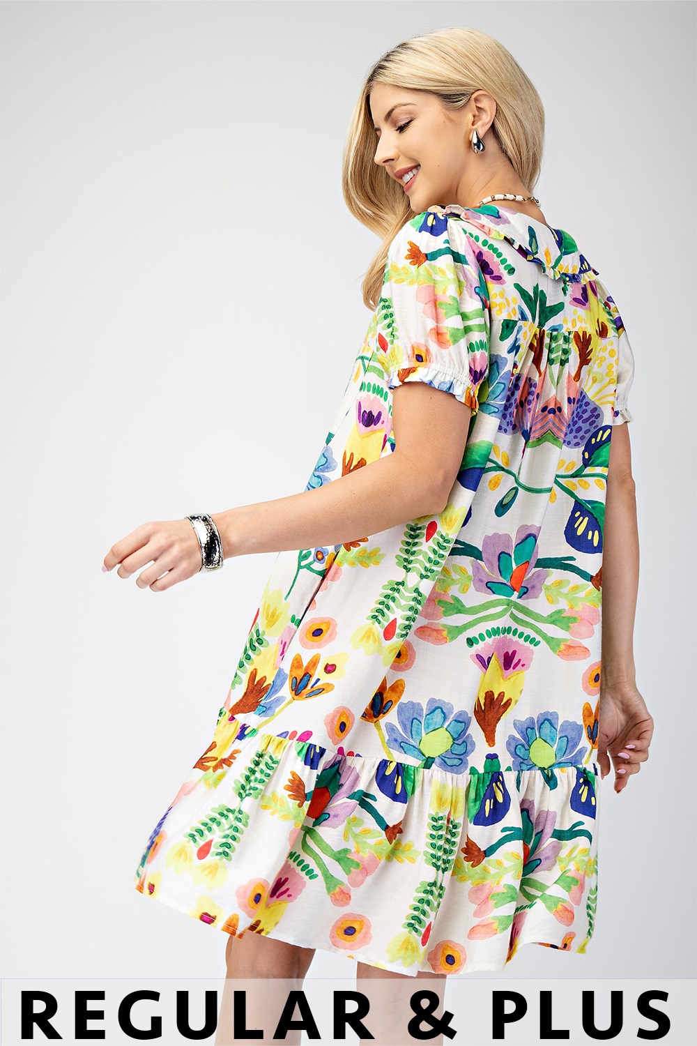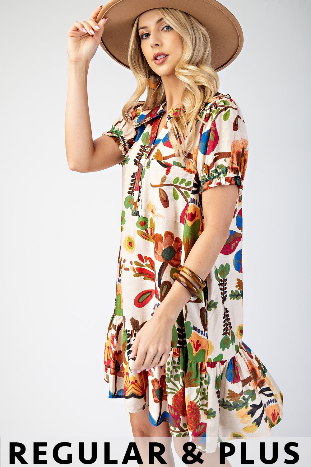 Floral Print Ruffled Neck Mini Dress with Contrasting Stripe Accents and Layered Ruffle Sleeves. The Skirt is Lined