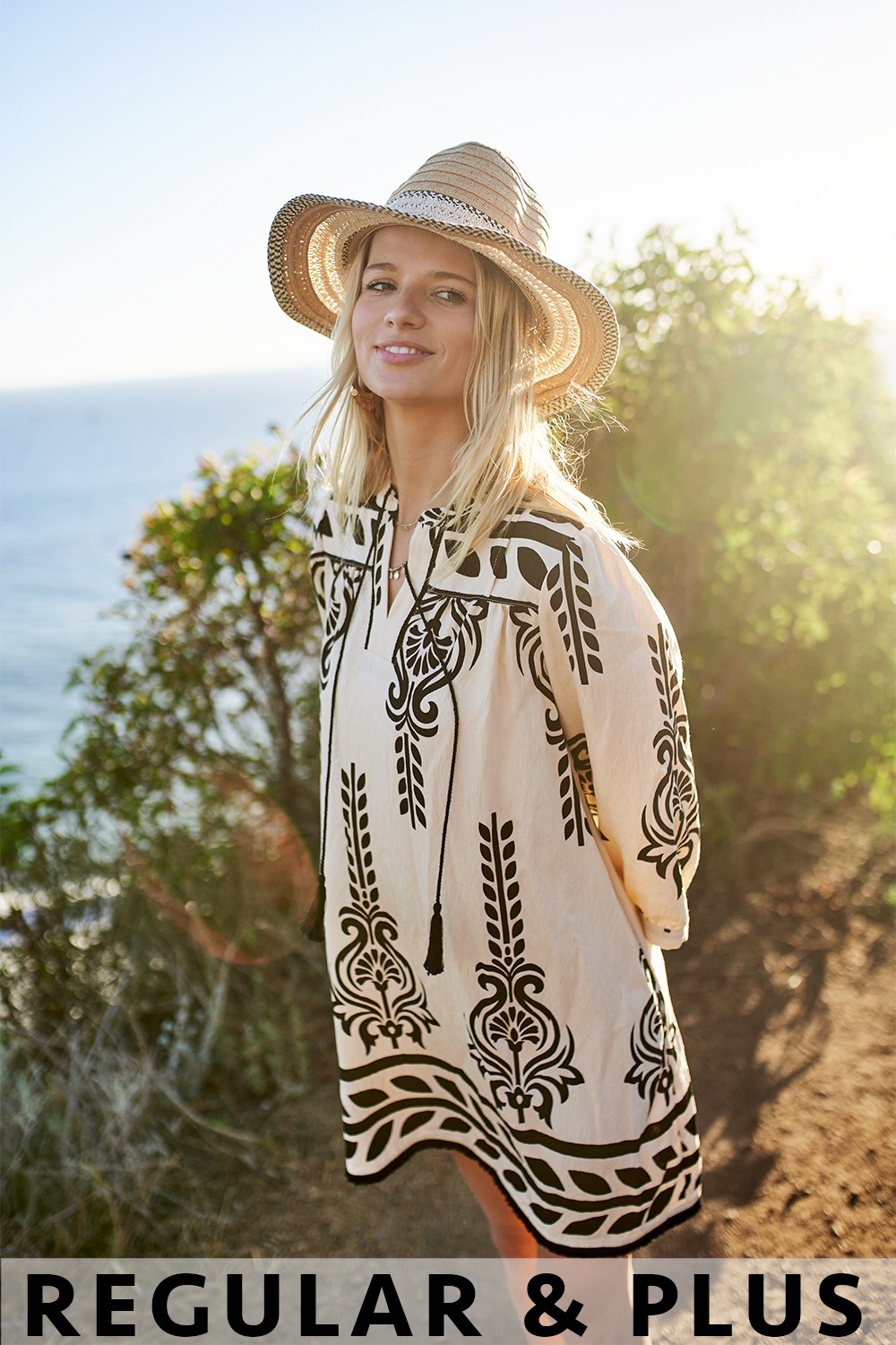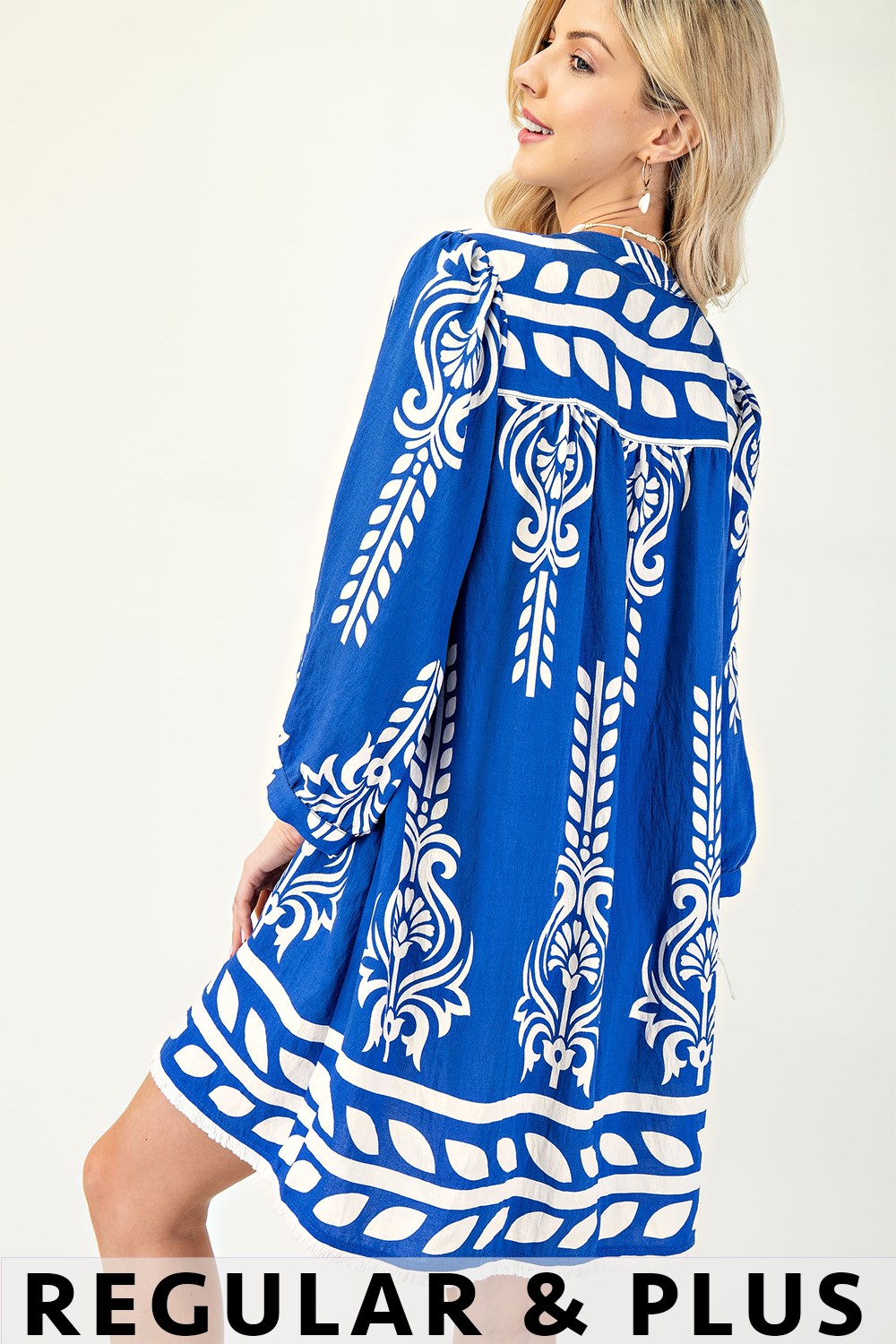 Printed 3/4 Sleeve Dress with Tassel Tie and Fringe Detail on Hem