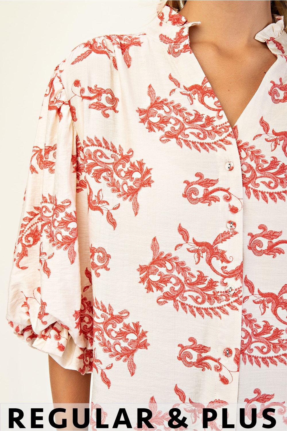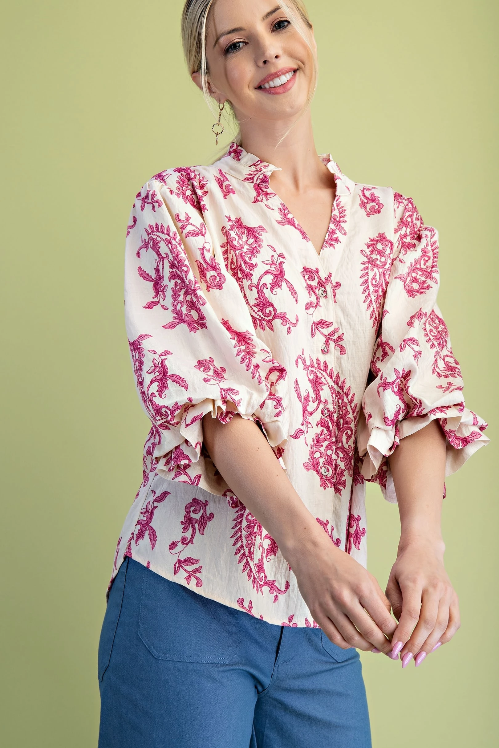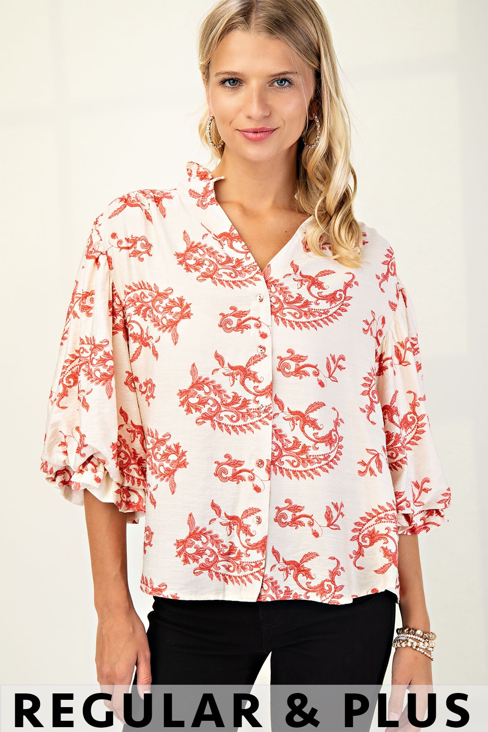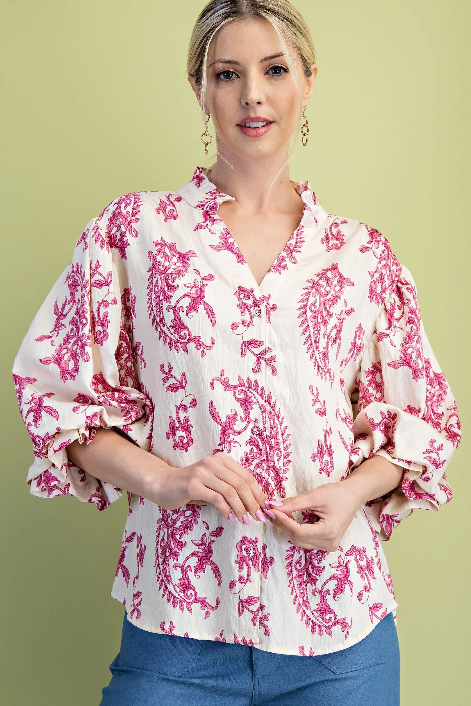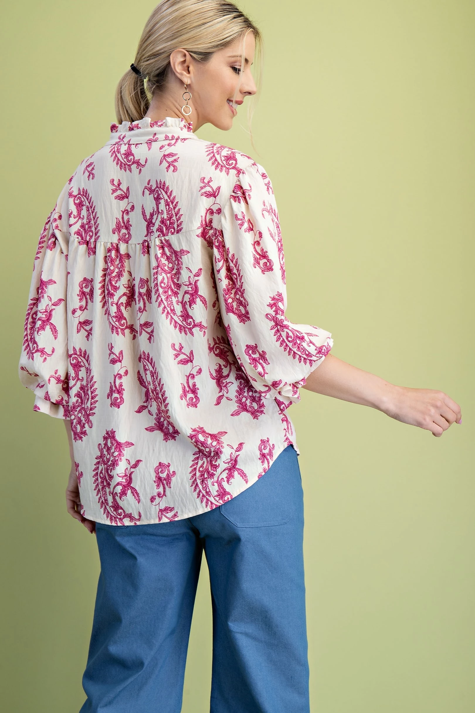 Printed Button Down Top with 3/4 Length Gathered Balloon Sleeves