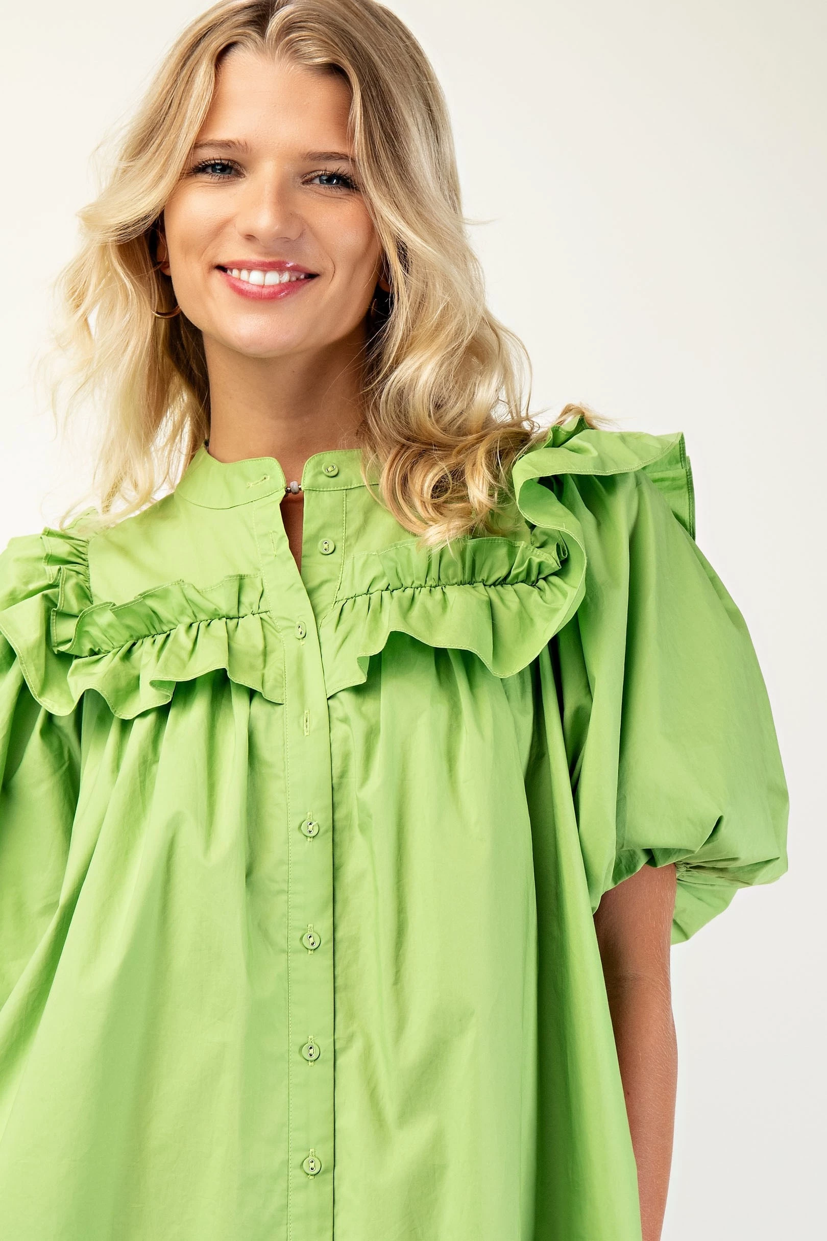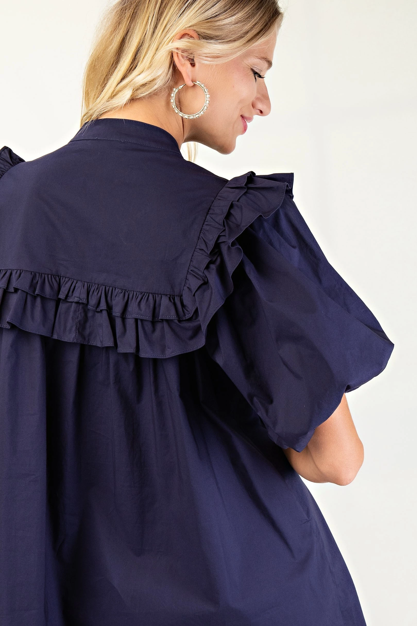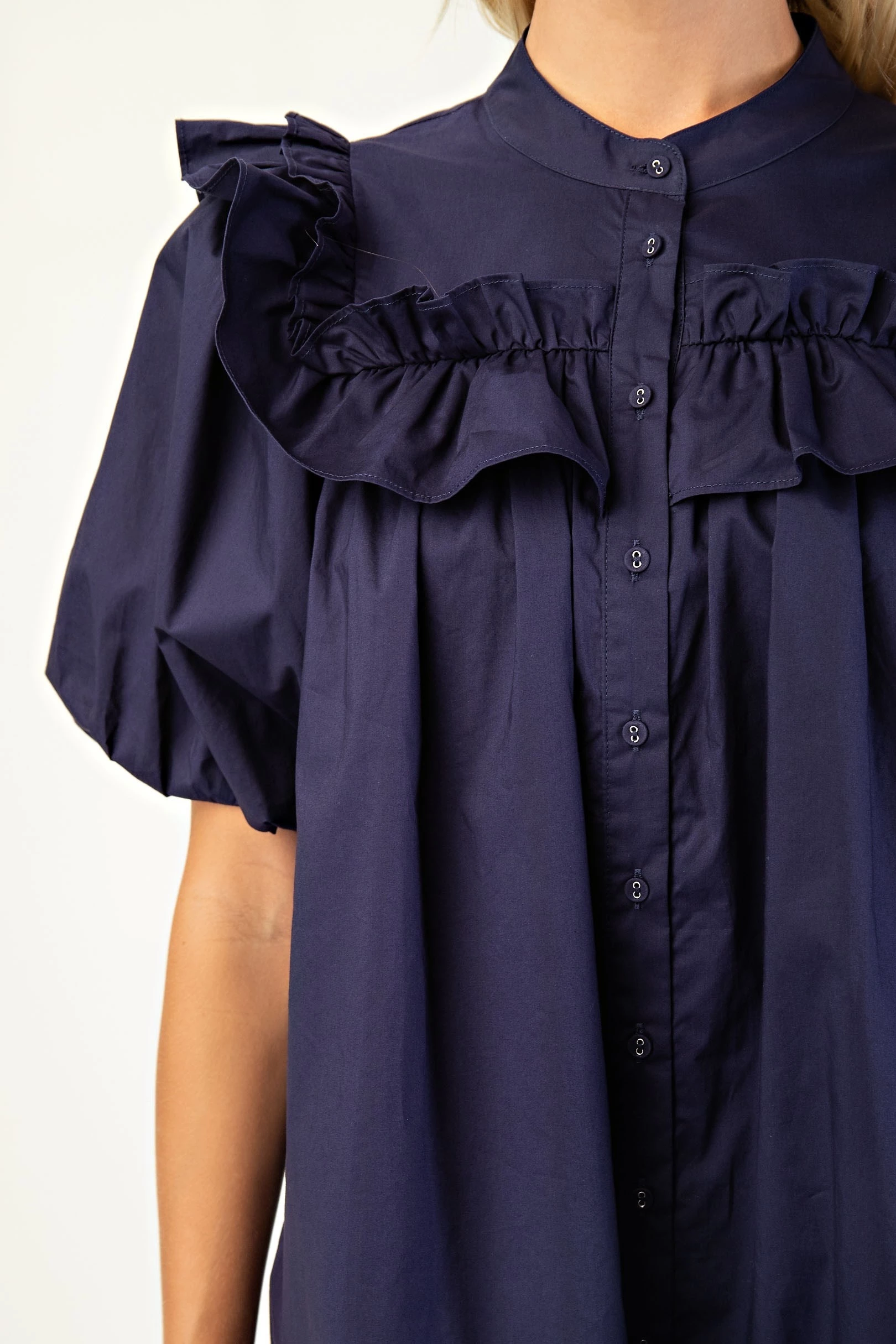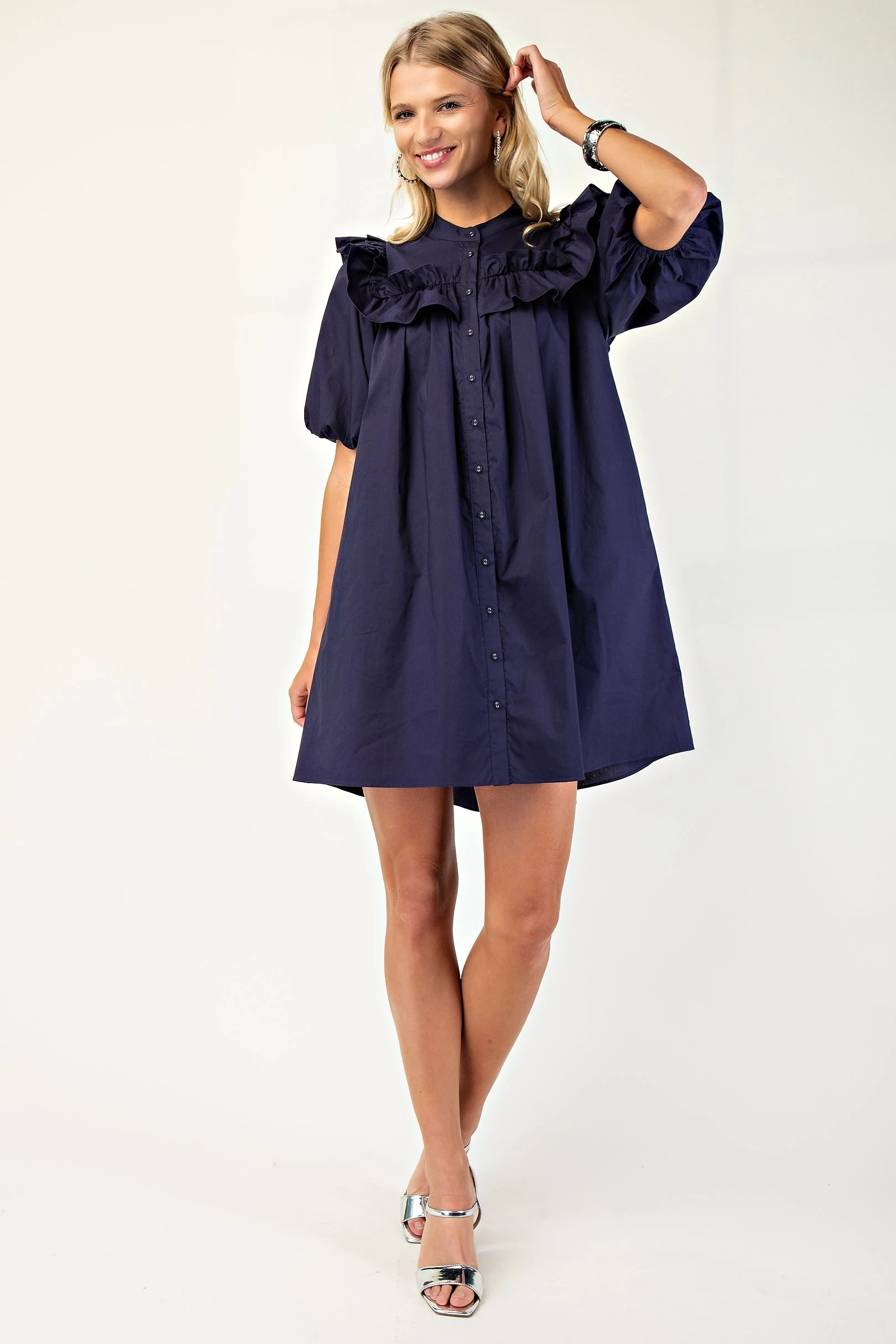 Puff Sleeve Mini Dress with Mandarin Collar and Ruffle Details