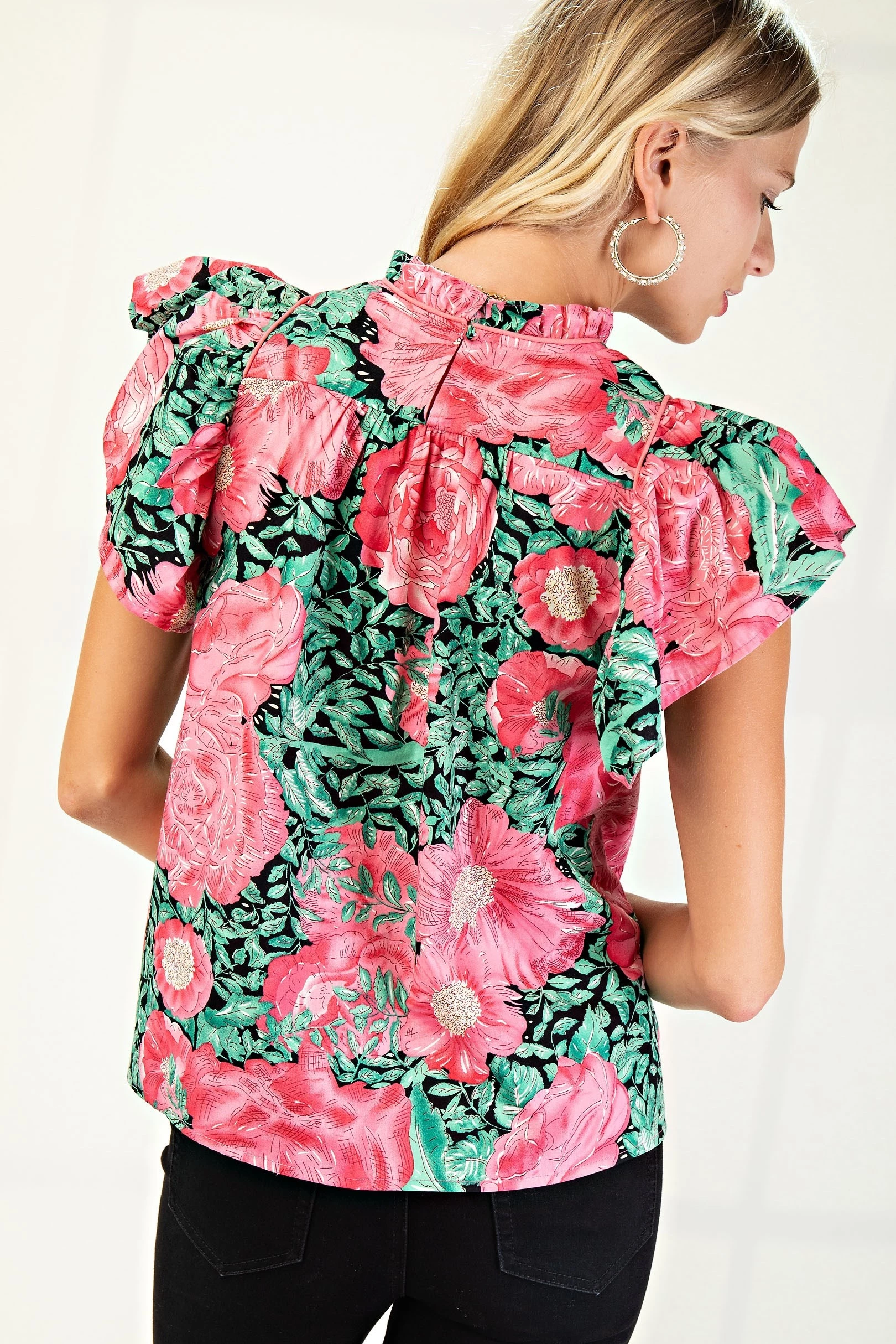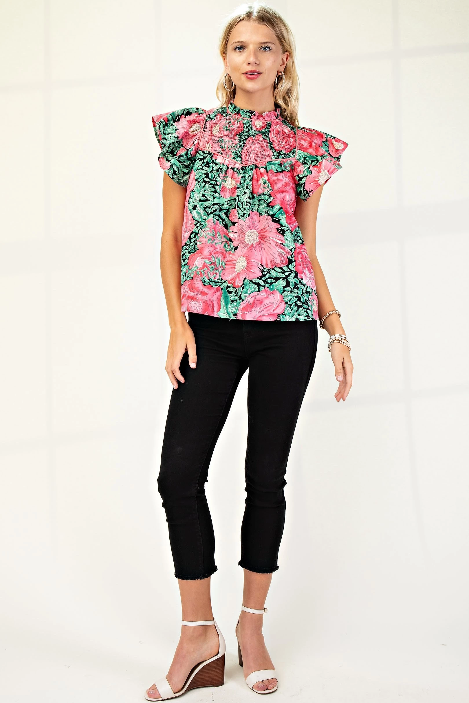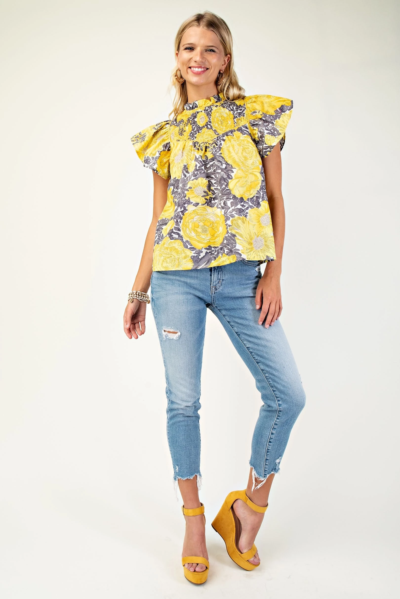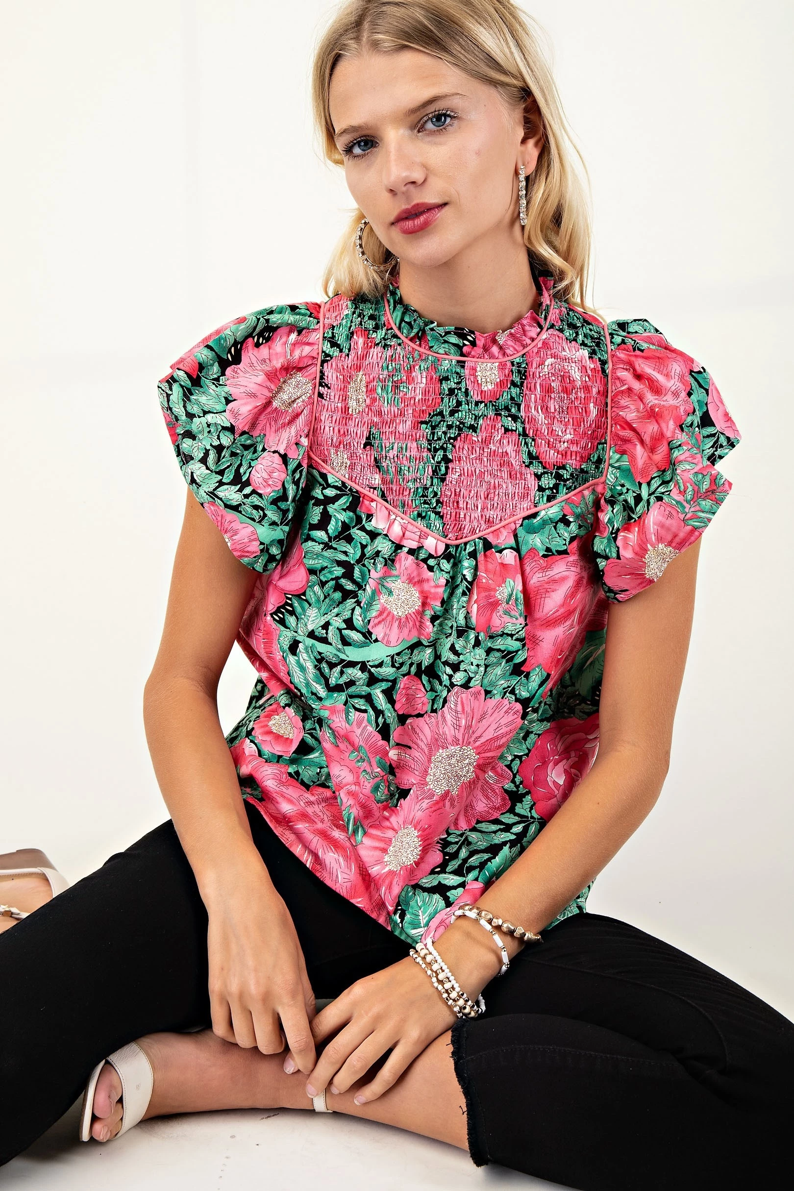Smocked Neck Blouse with Ruffled Sleeves and Binding Detail