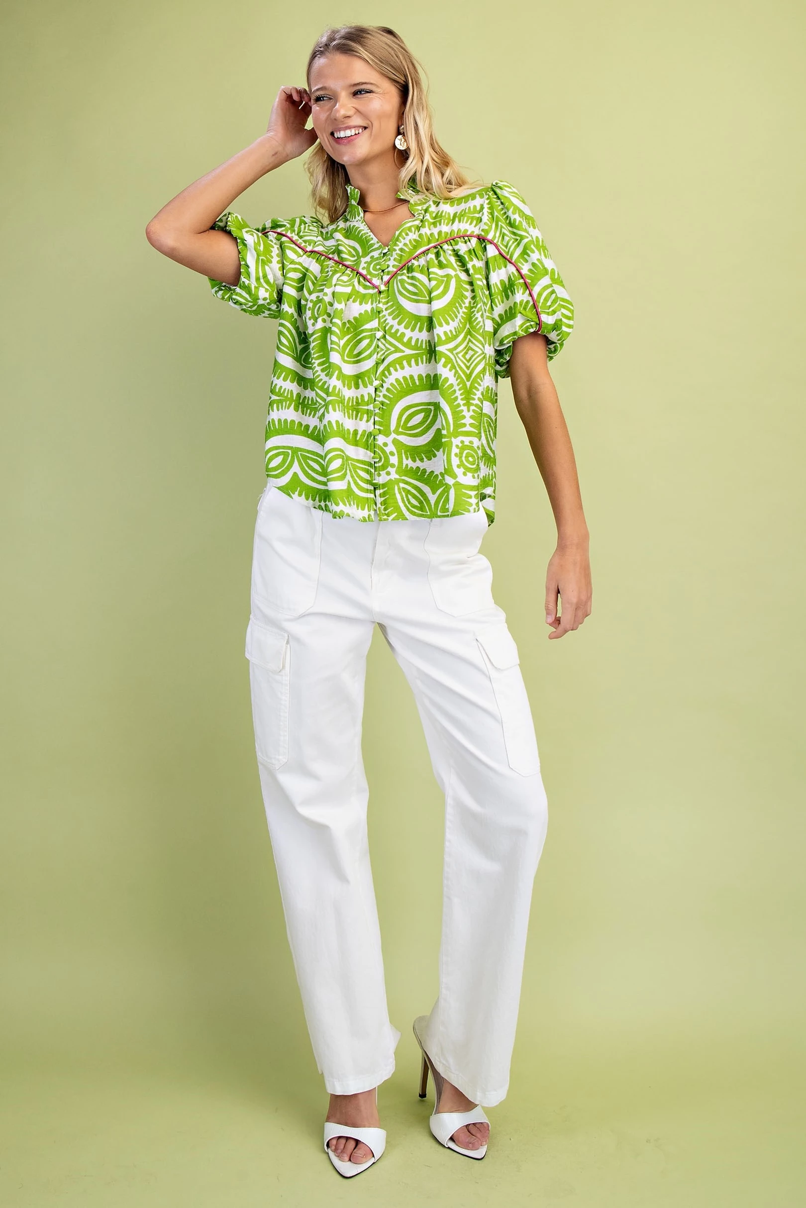 Ruffled Neck Short Puff Sleeve Top with Piping Details