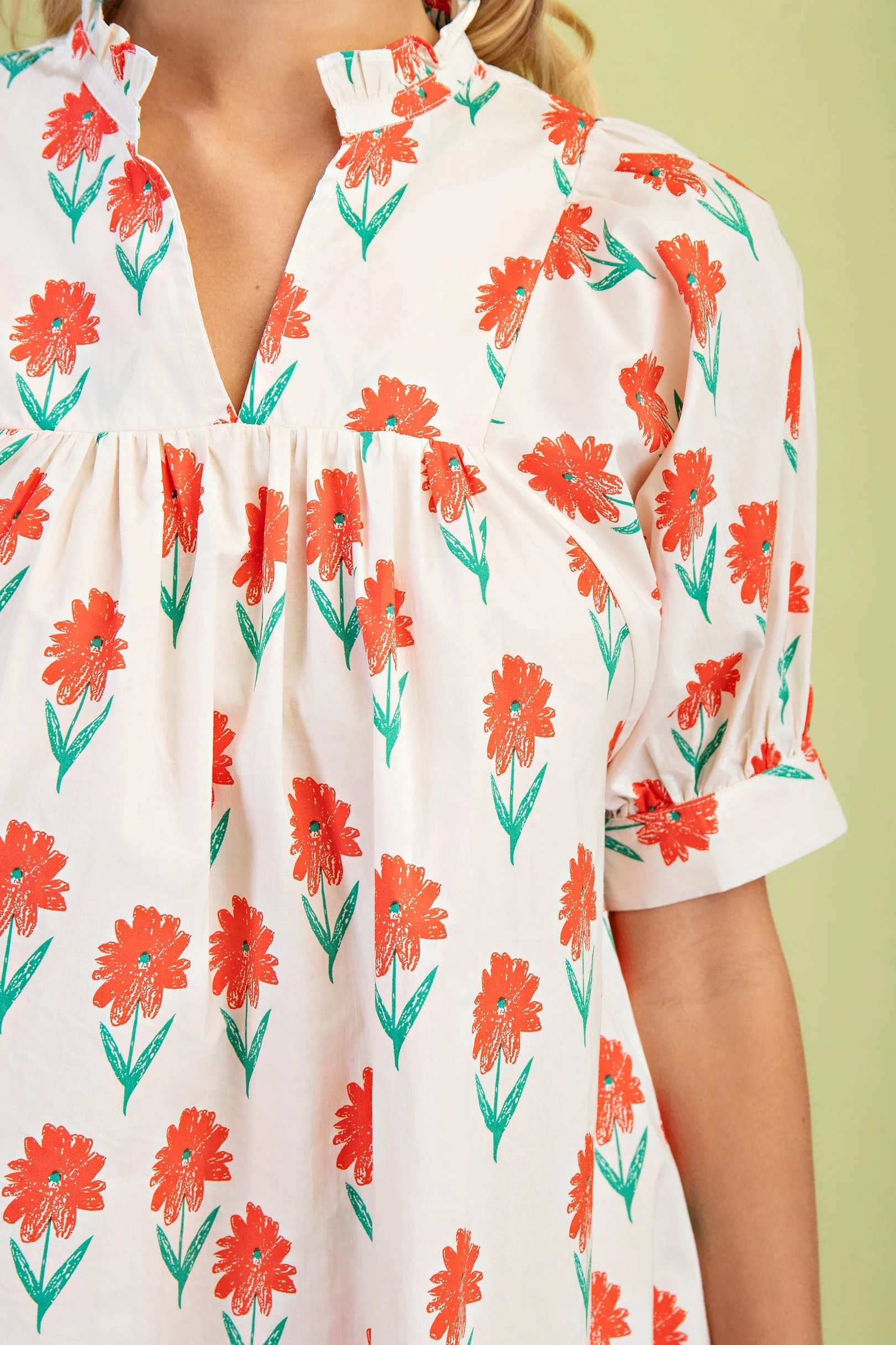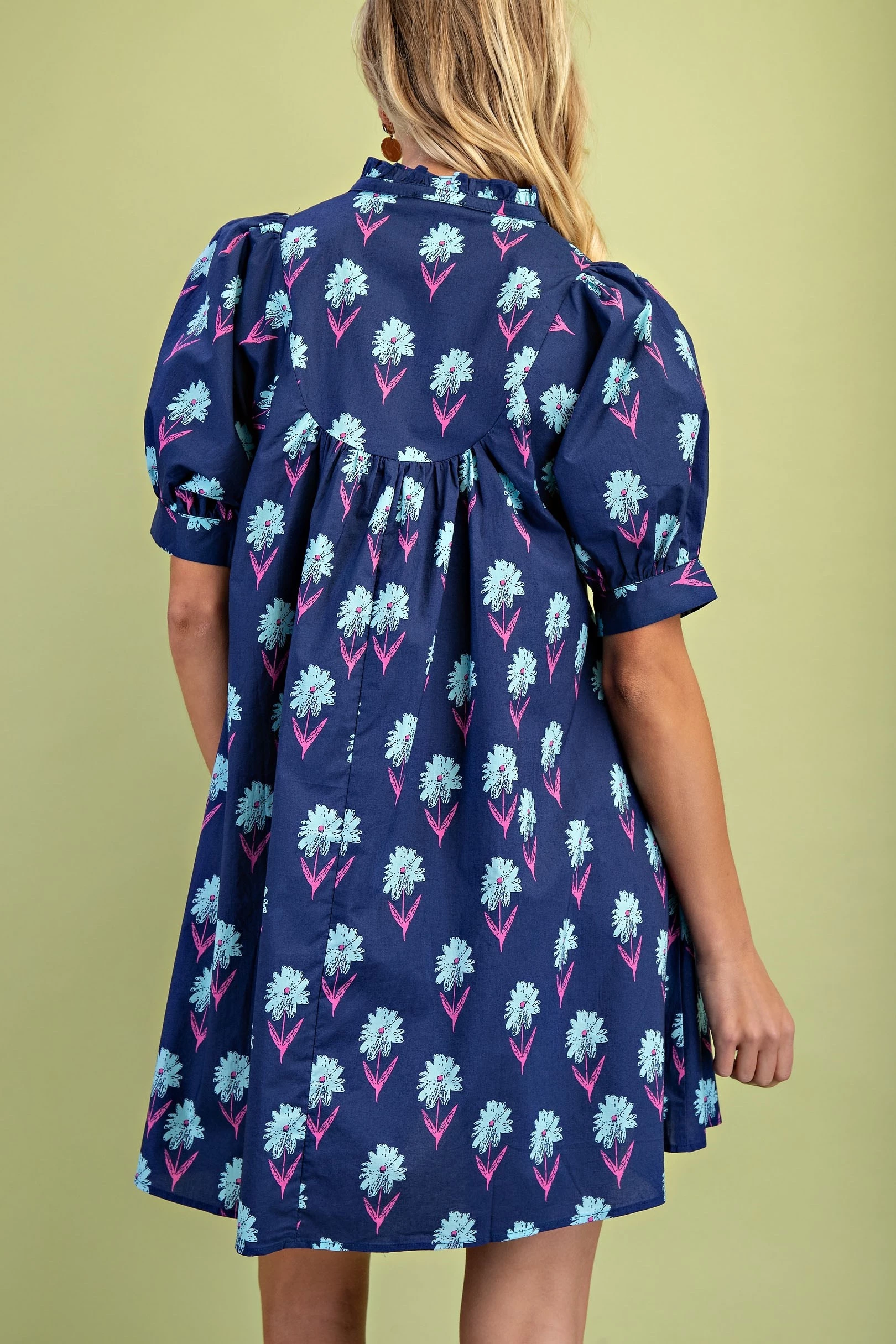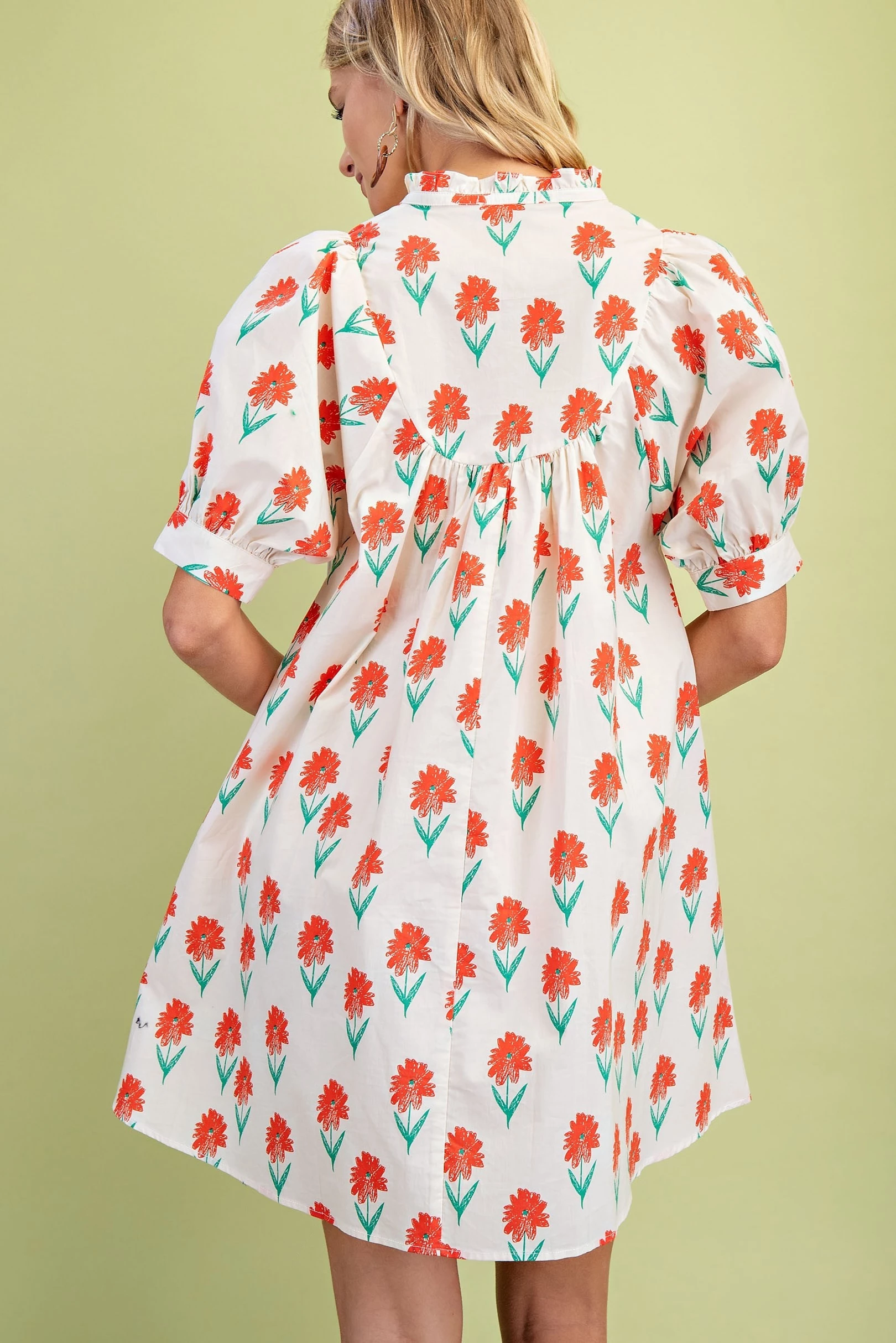 Floral Print Mini Dress with a Ruffled Neck and Short Puff Sleeves