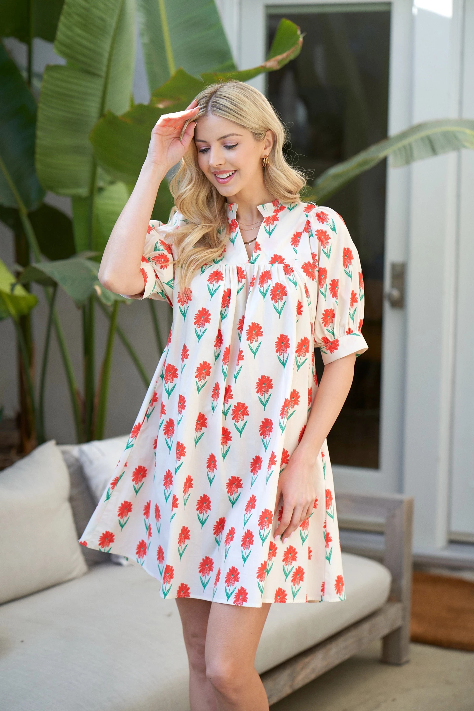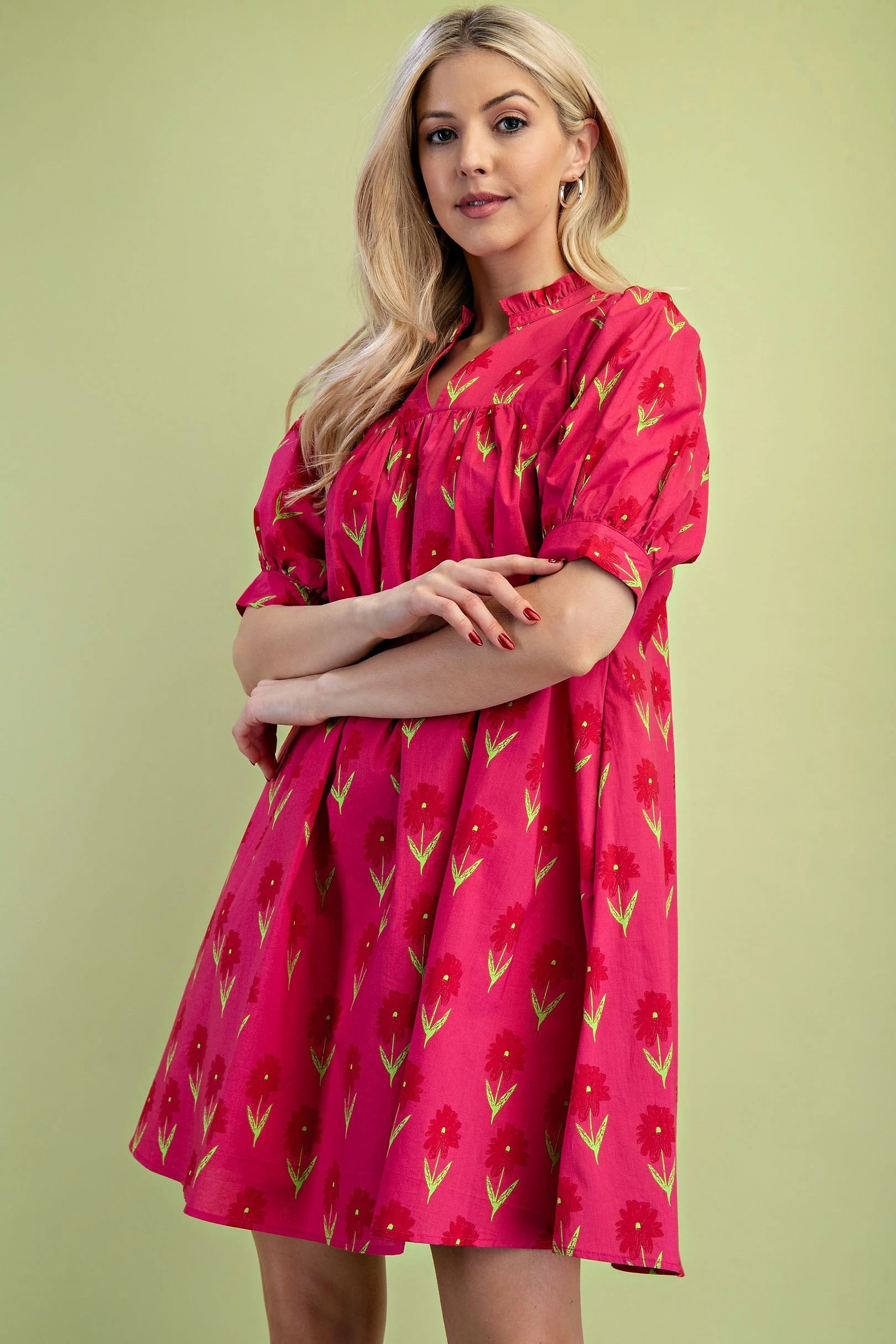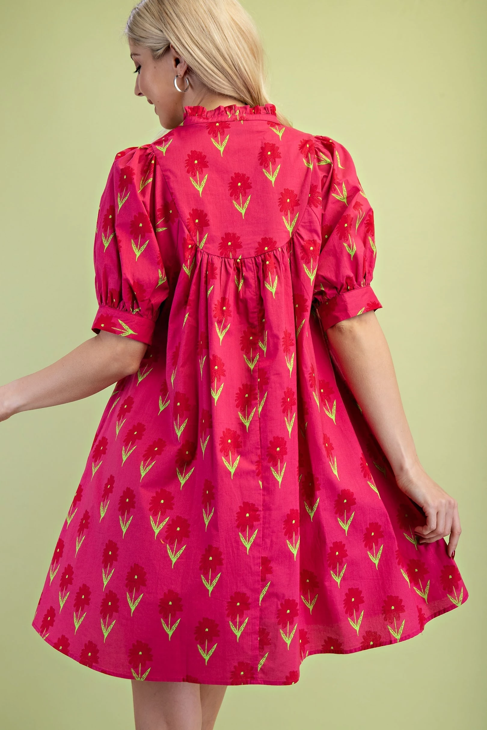 Floral Print Mini Dress with a Ruffled Neck and Short Puff Sleeves