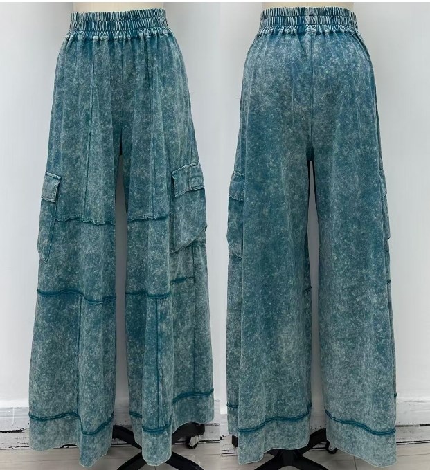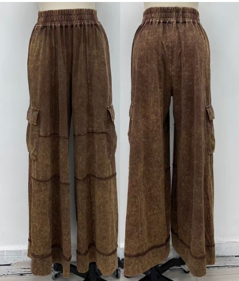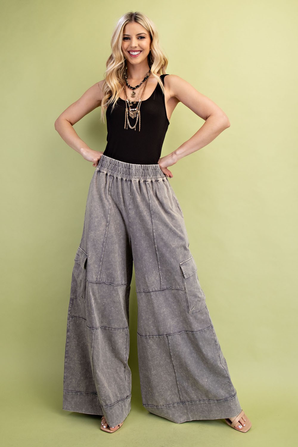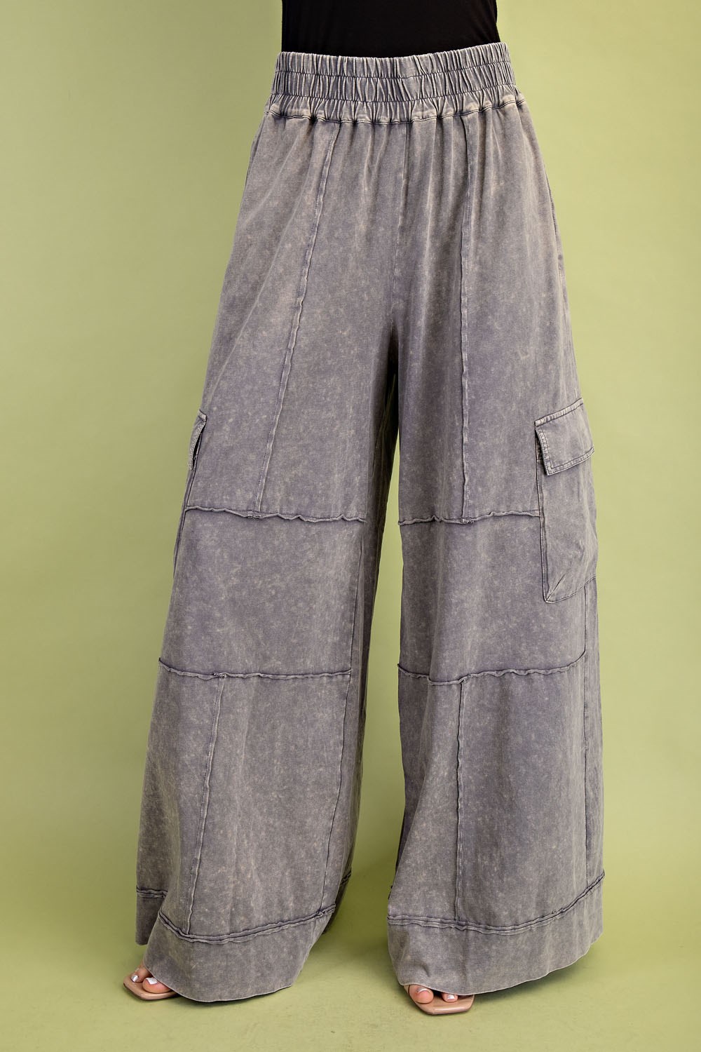 Mineral Washed Wide Leg Pants with Pocket and Exposed Seam Details