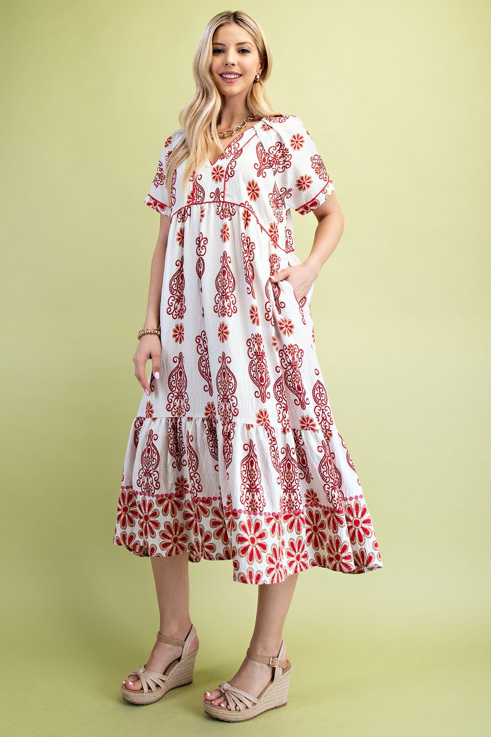 Watercolor Floral Tiered V-Neck Midi Dress with Decorative Trim Details. The Dress is Lined