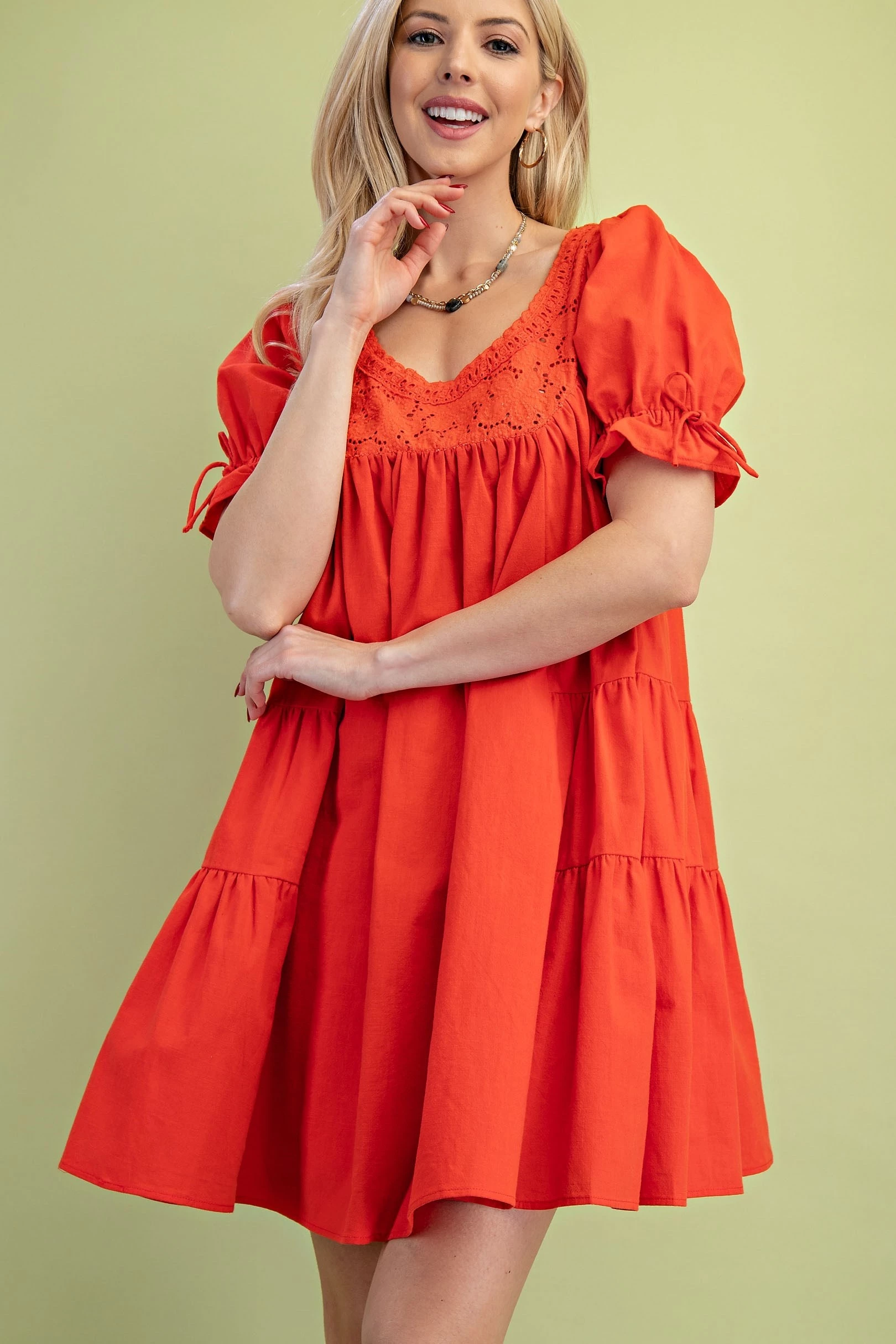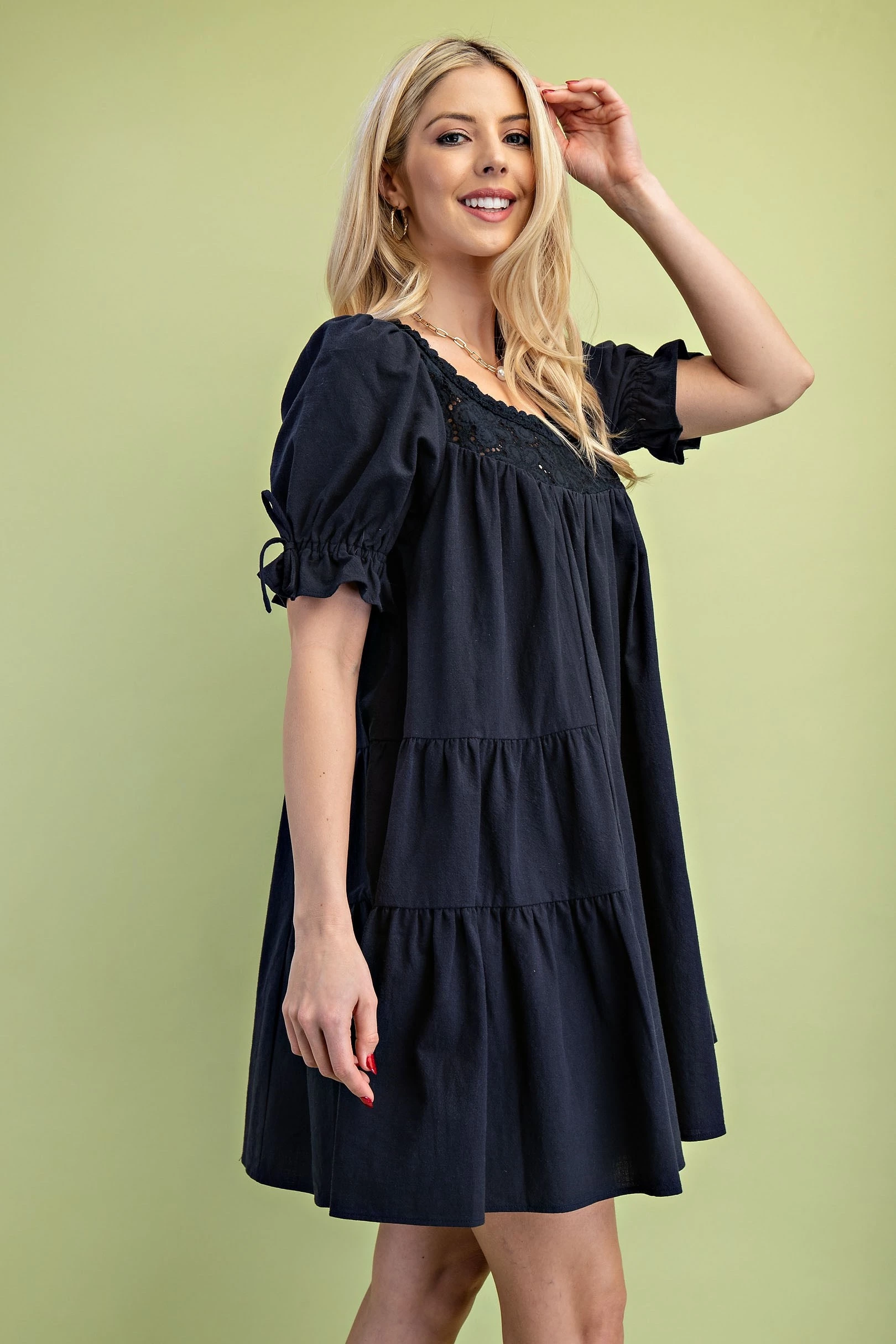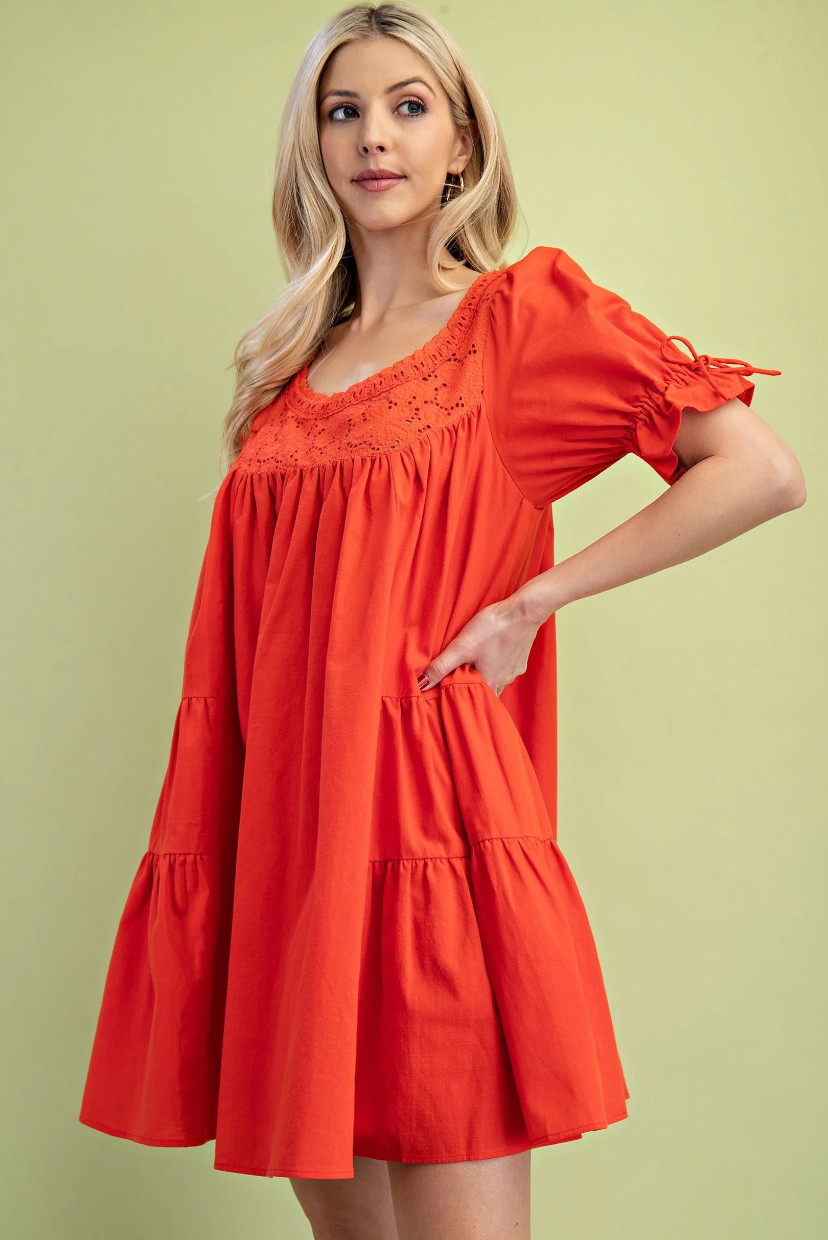 Scoop Neck Voluminous Mini Dress with Tied Puff Sleeves and an Eyelet Yoke