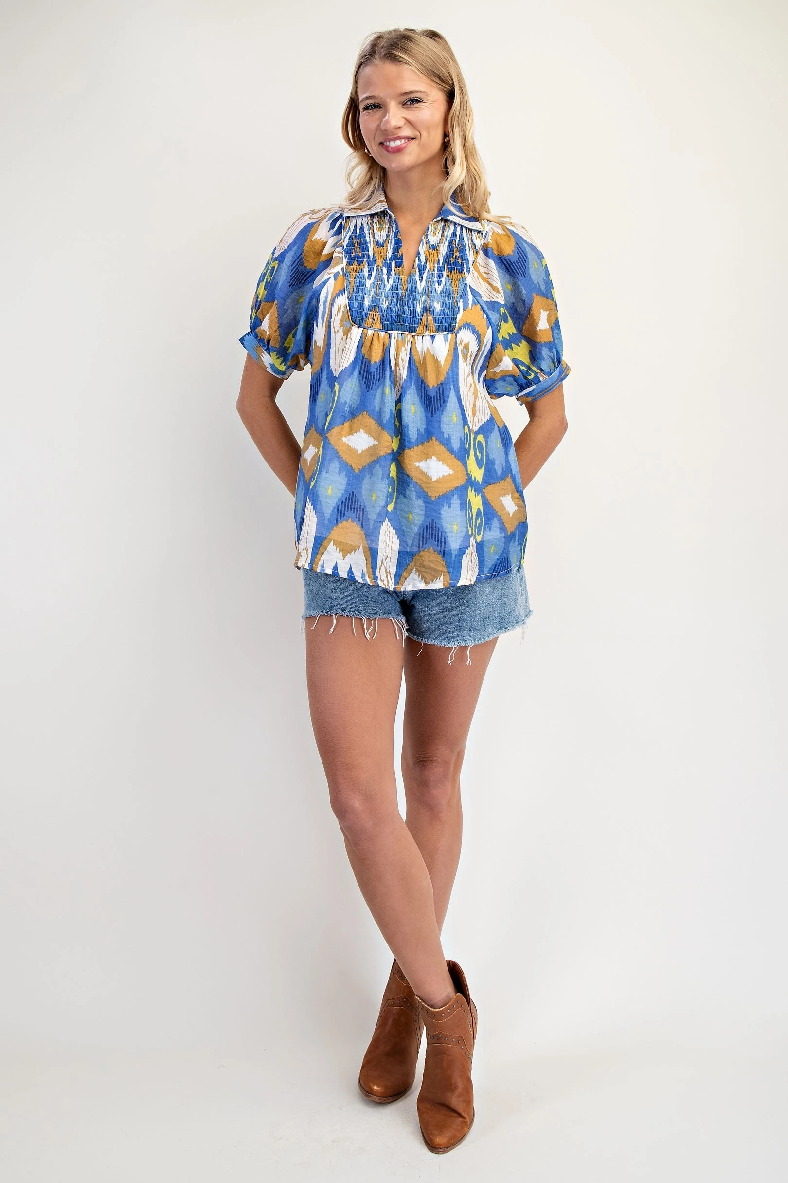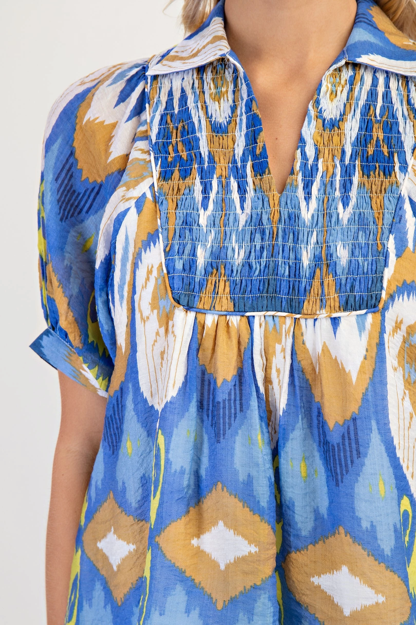 Smocked Yoke Top with Short Balloon Sleeves and a Collar