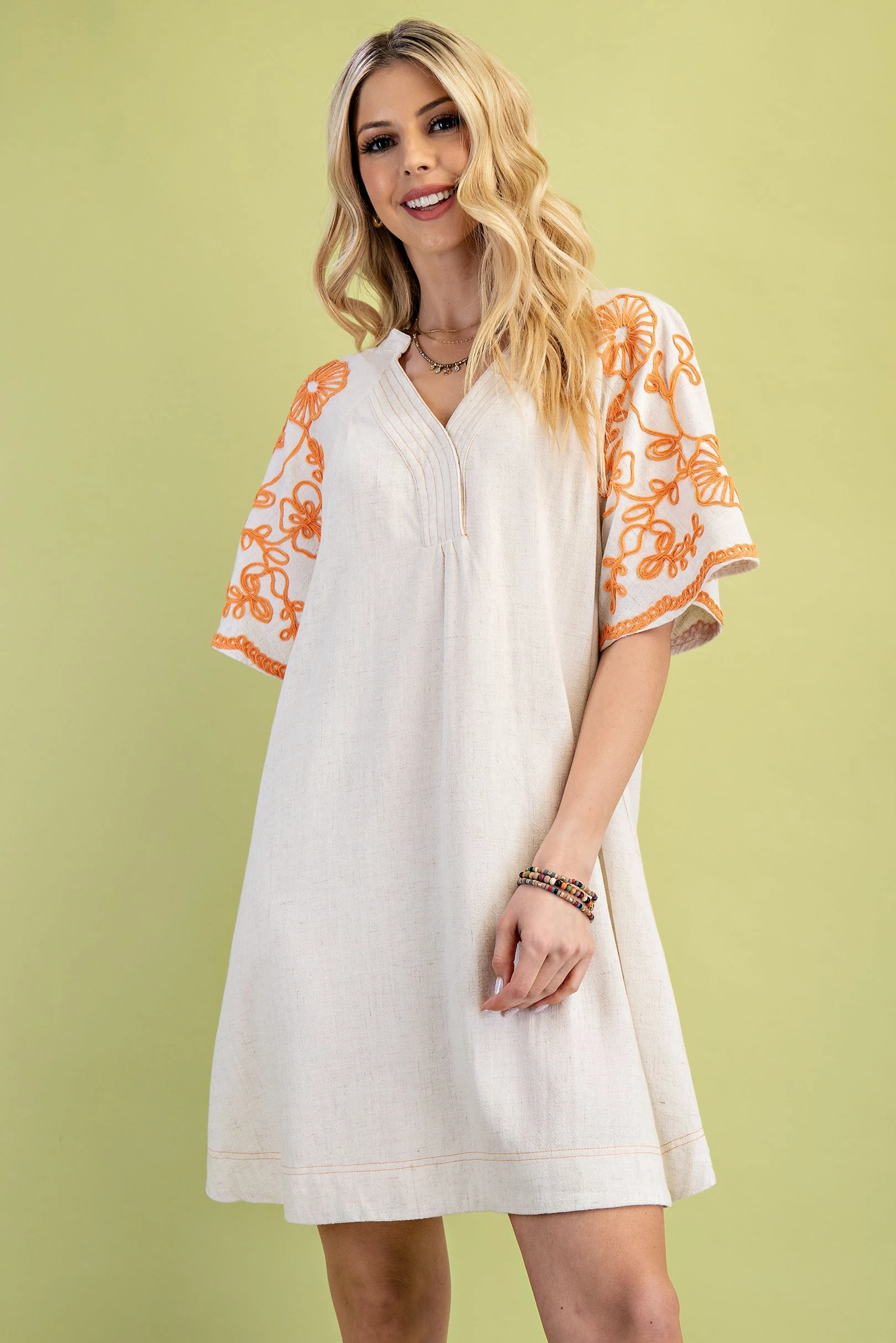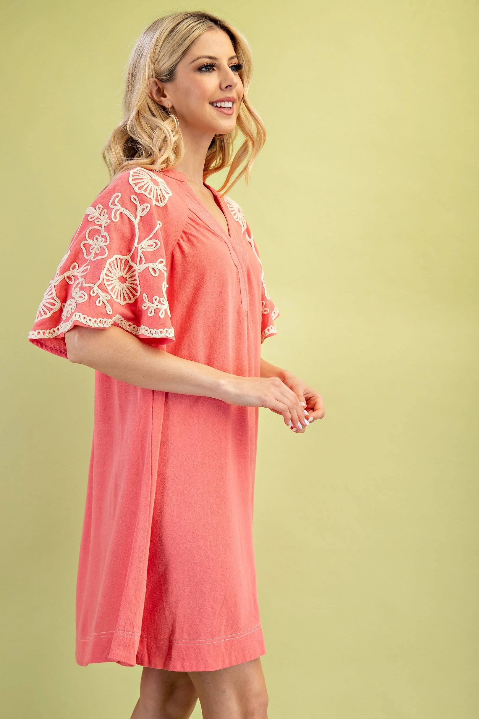 Embroidered Sleeve V-Neck Dress with a Snap Closure and Trapunto Stitching