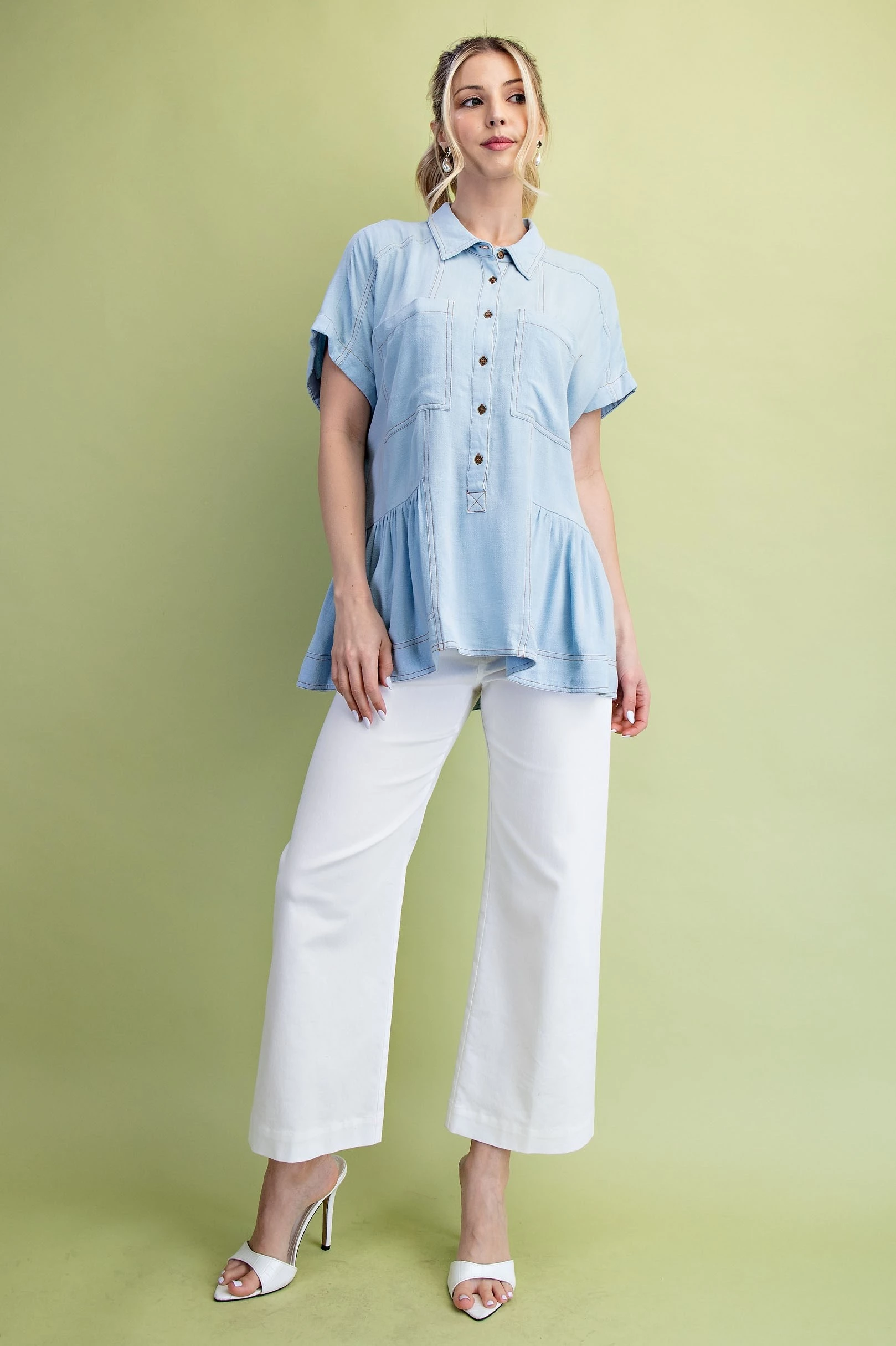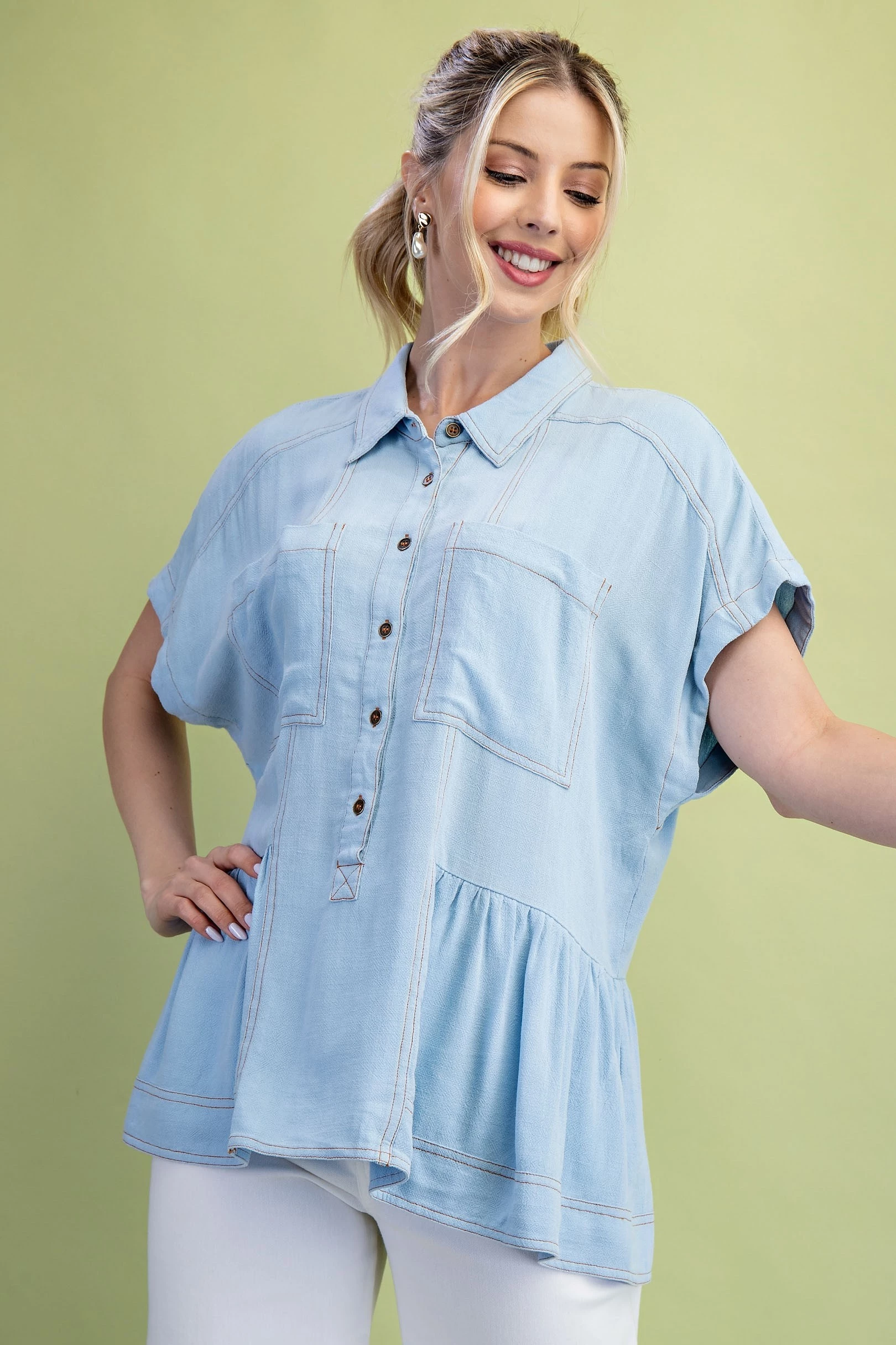 Linen Button Up Peplum Blouse with Front Pockets and Seaming Details