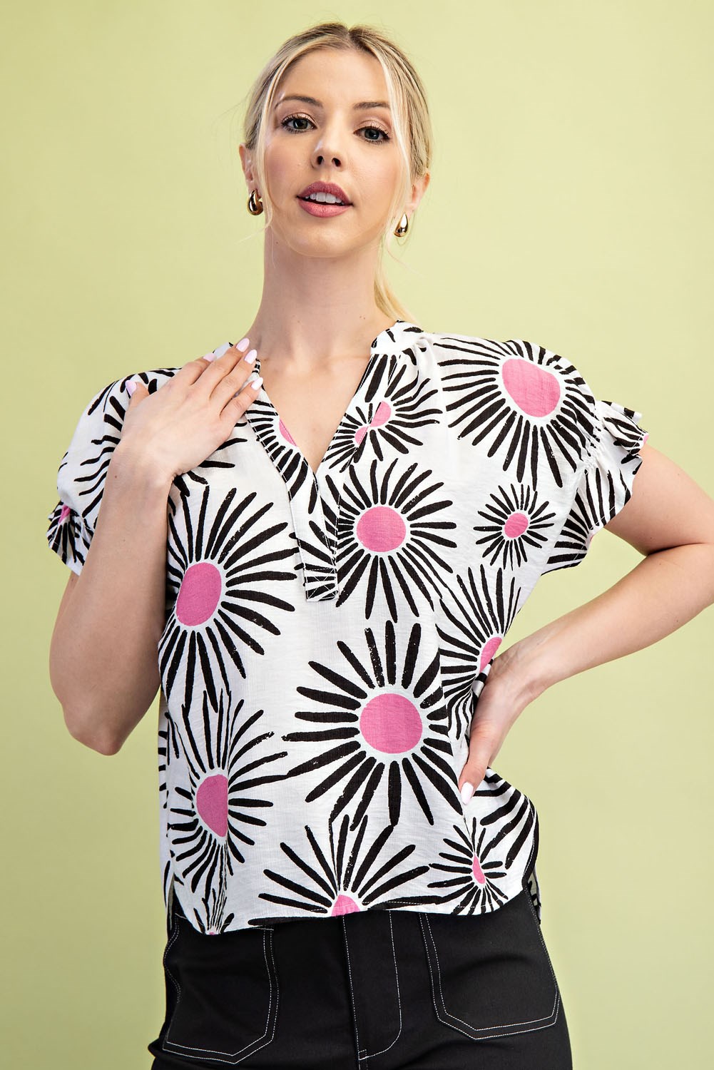 Sunburst Printed V-Neck Top with Smocked Sleeve Details