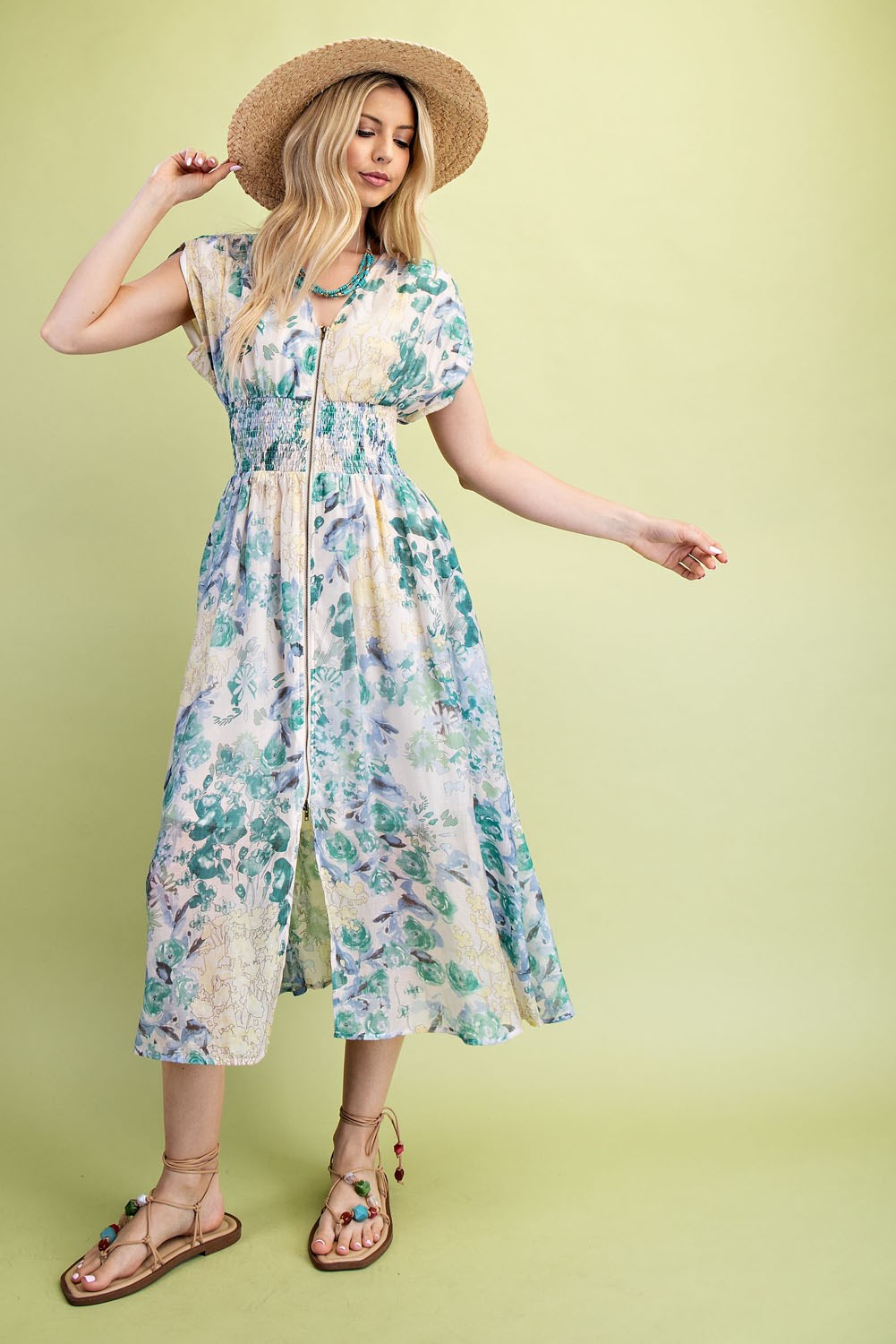 Floral Jacquard Printed Button Down Dress with Short Puff Sleeves. The Dress is Lined