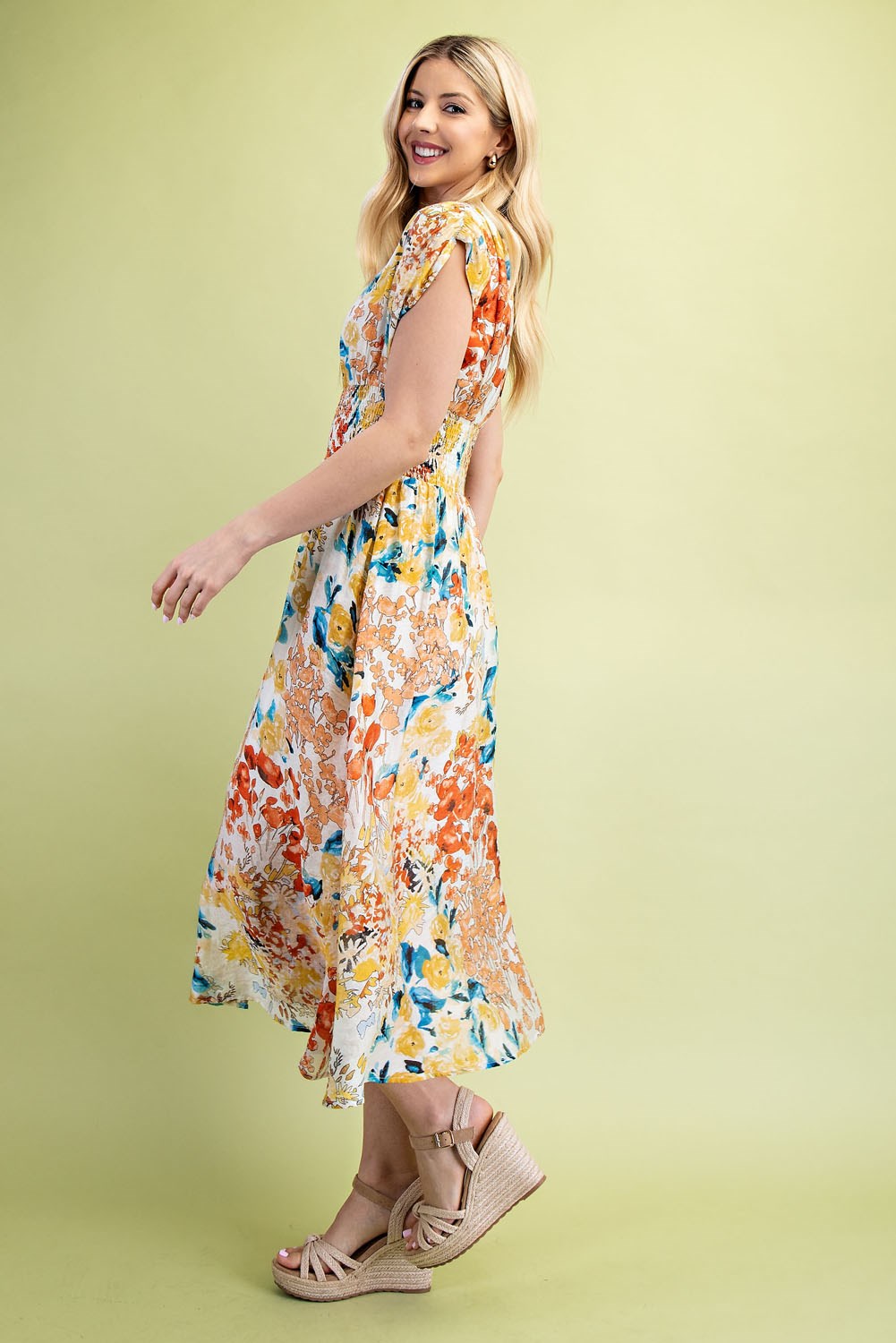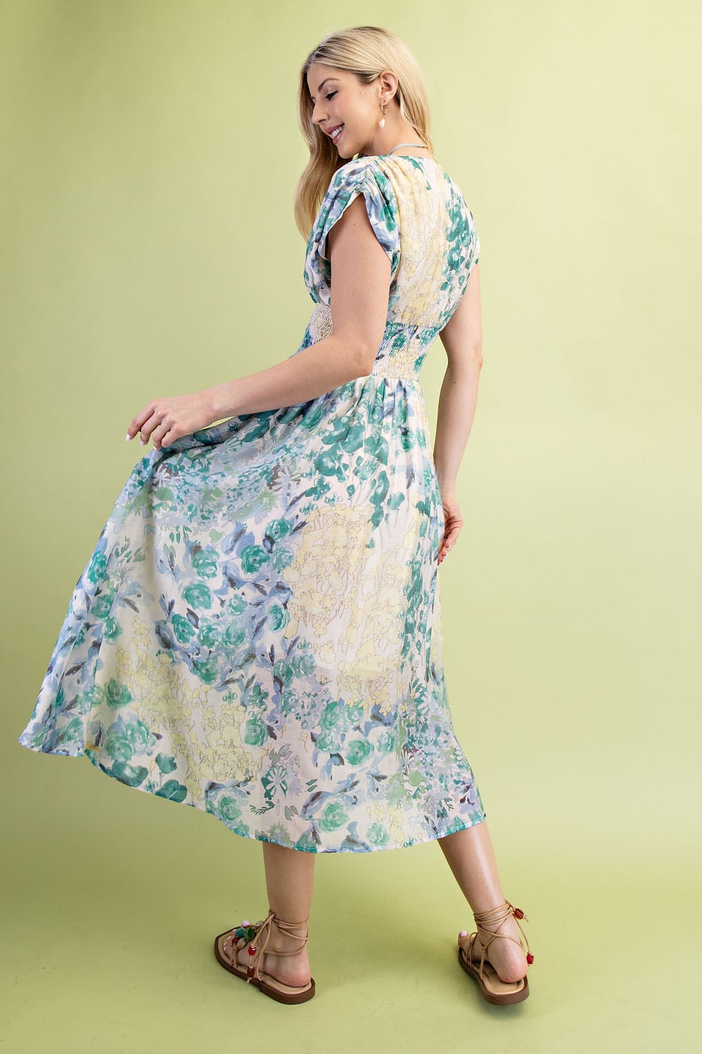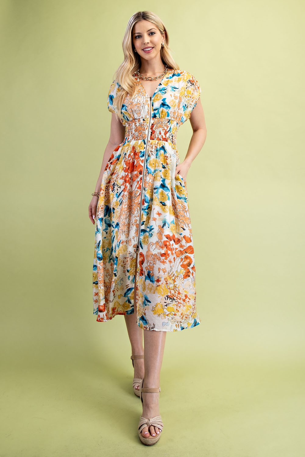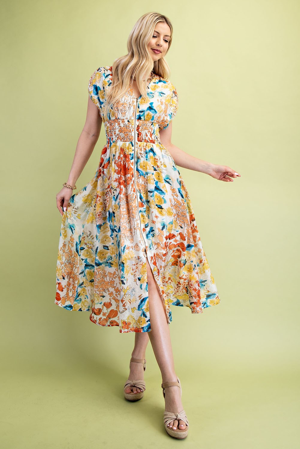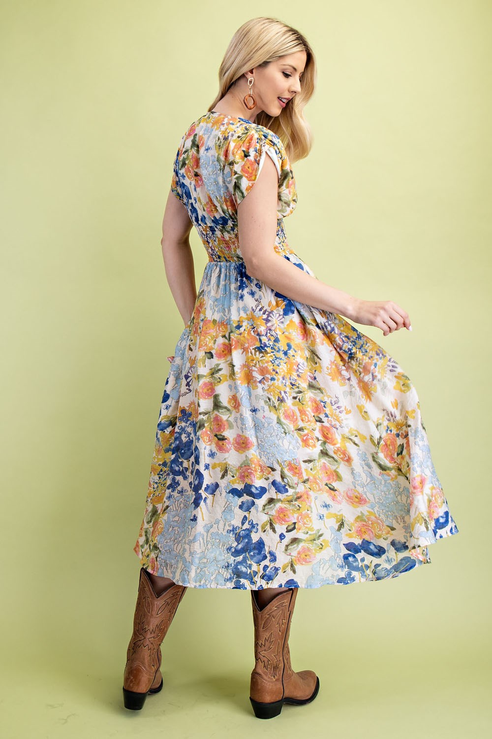 Mixed Print Short Puff Sleeve Midi Dress with a Smocked Front Yoke