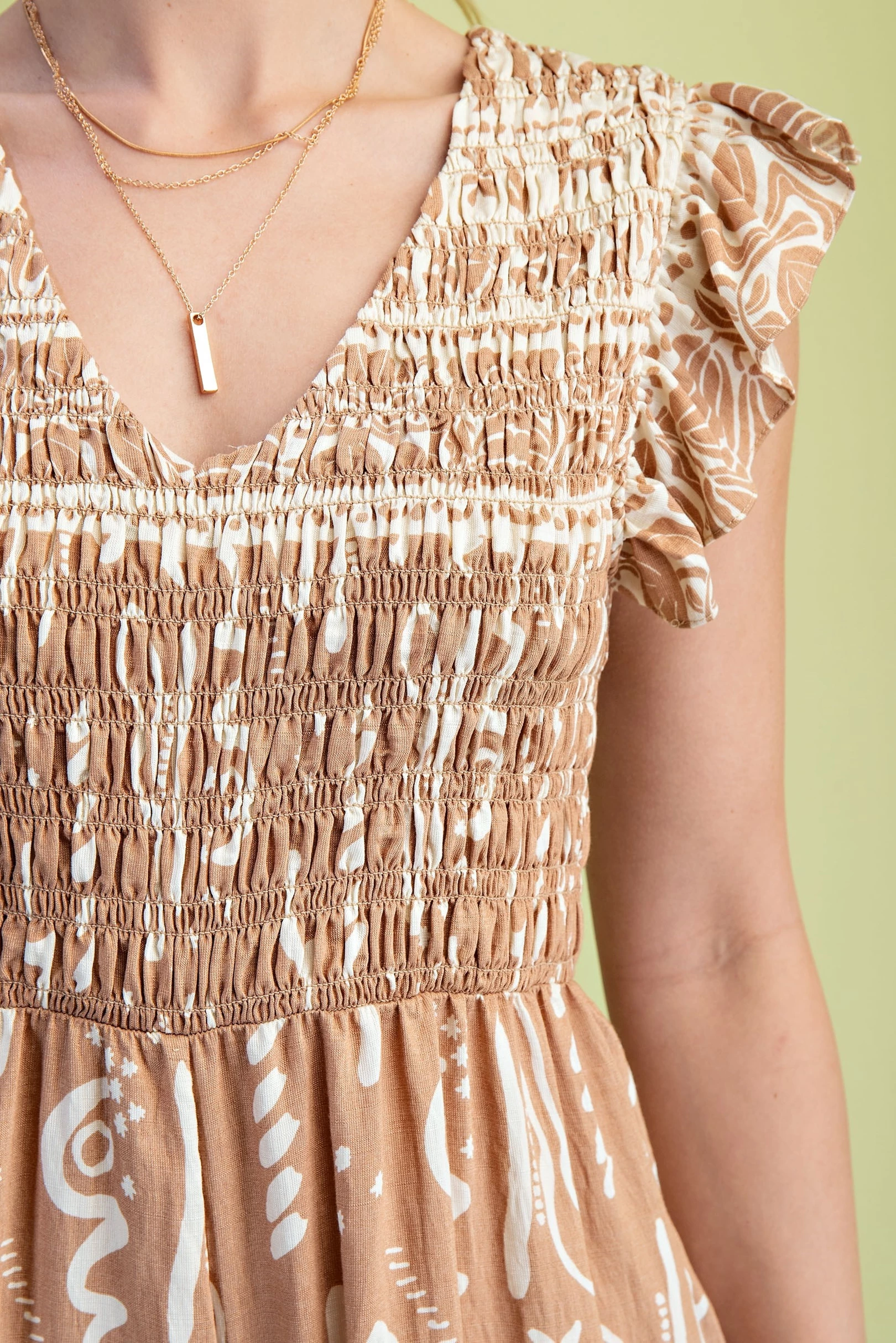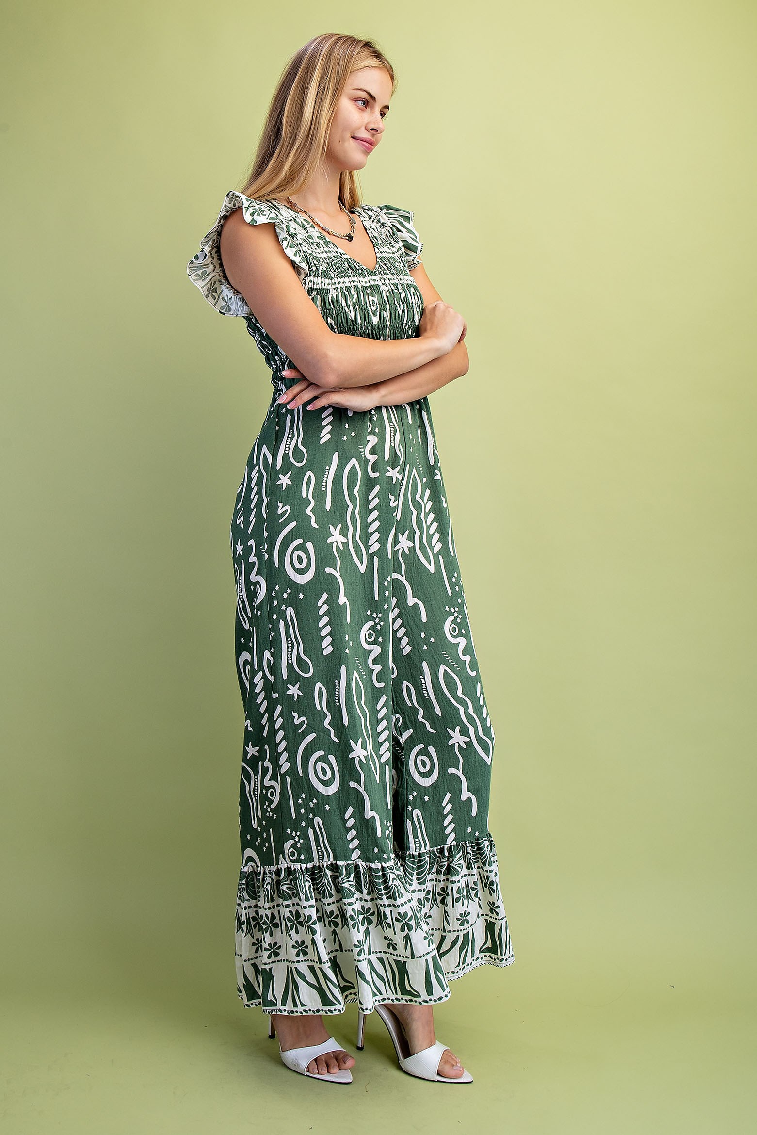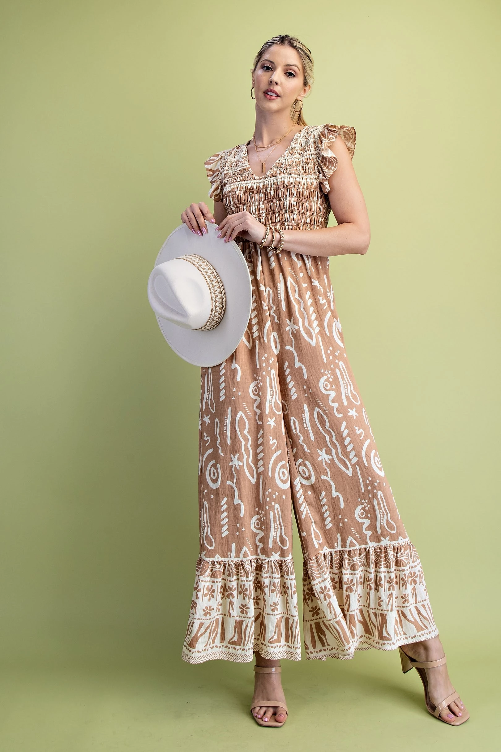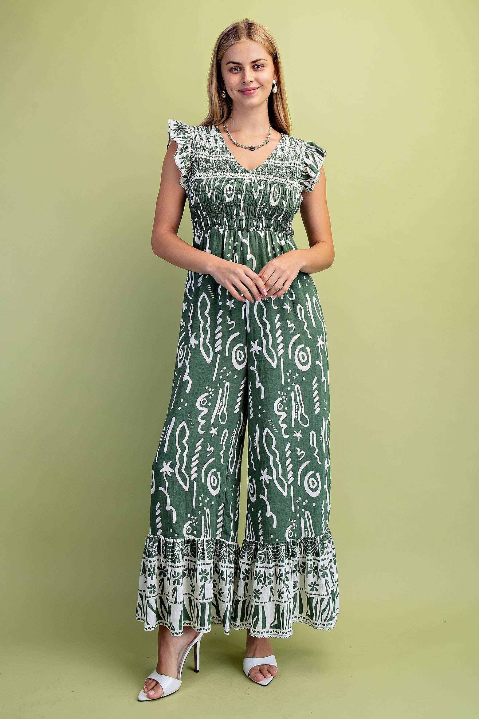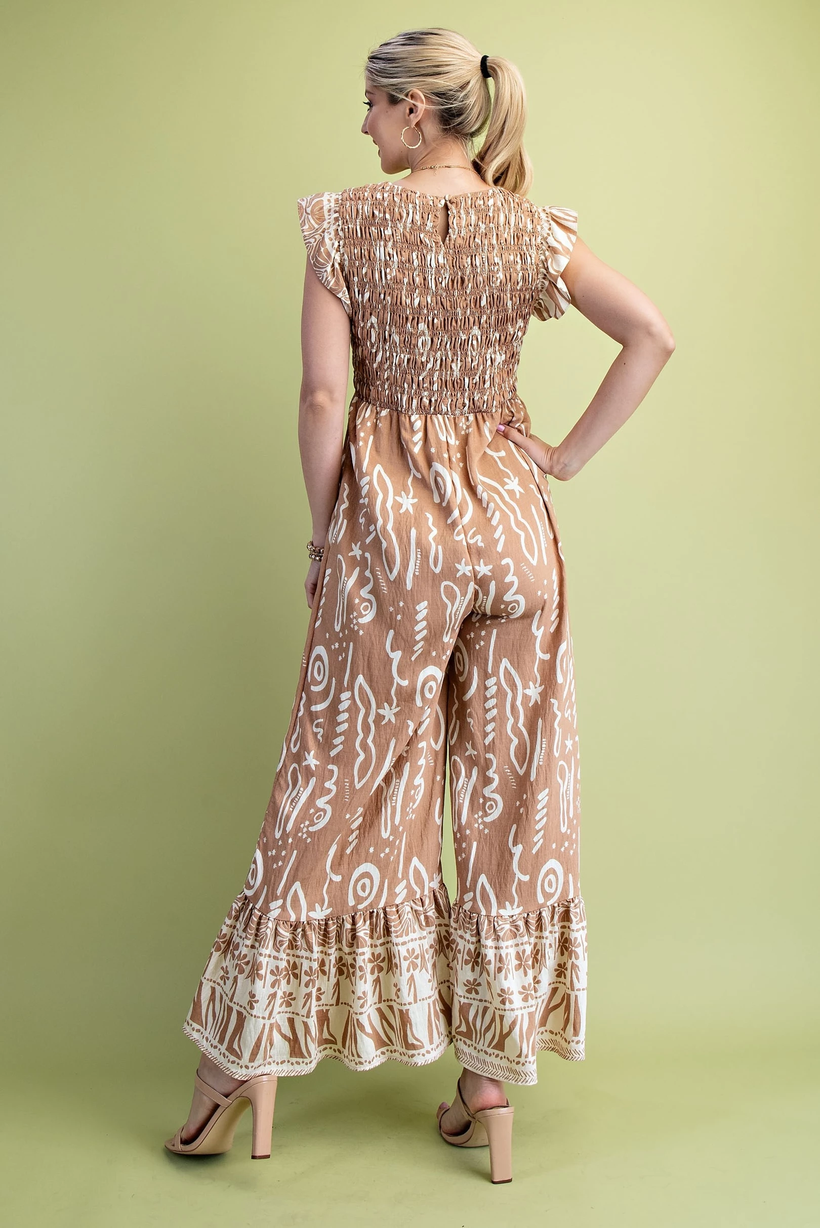 Mixed Print V-Neck Jumpsuit with a Smocked Bodice and Flutter Sleeves
