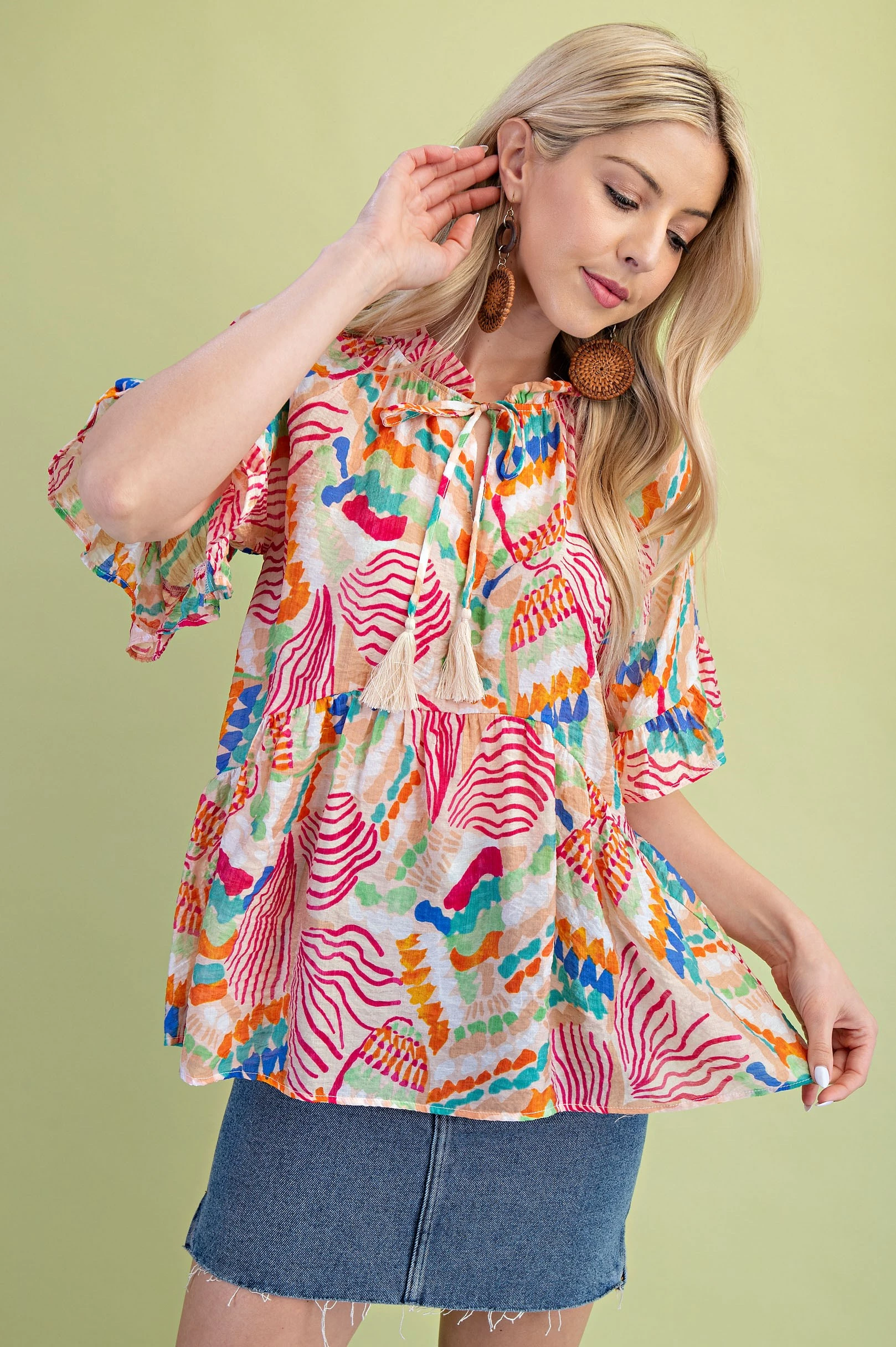 Patchwork Print Mixed and Elastic Waist Shorts with Side Pockets and Waist Tie
