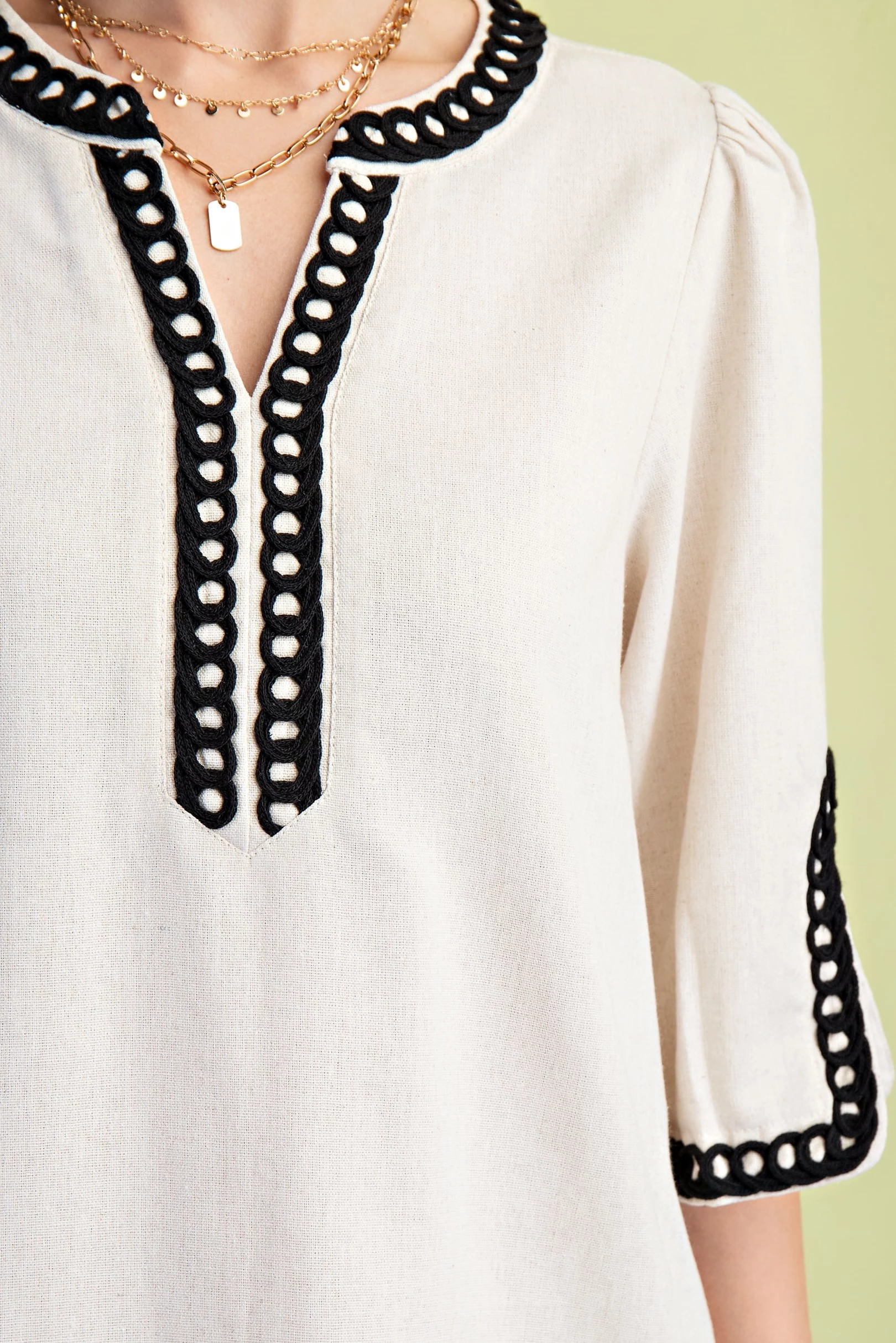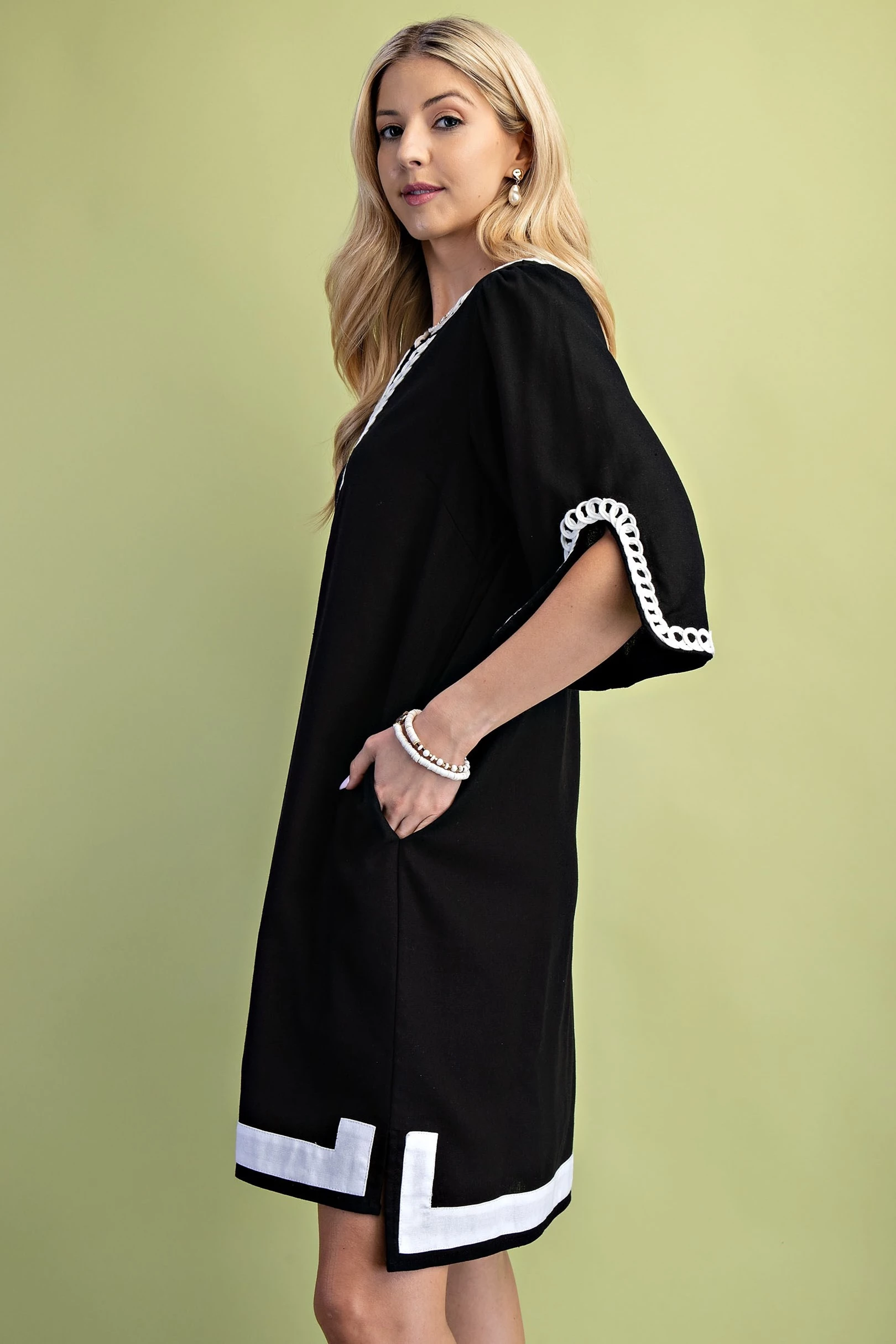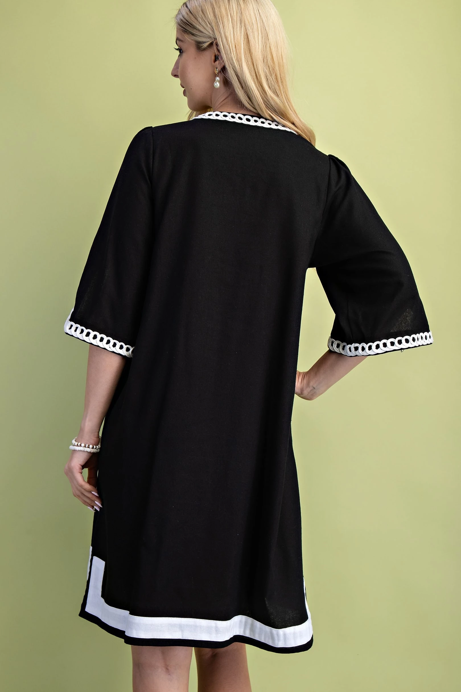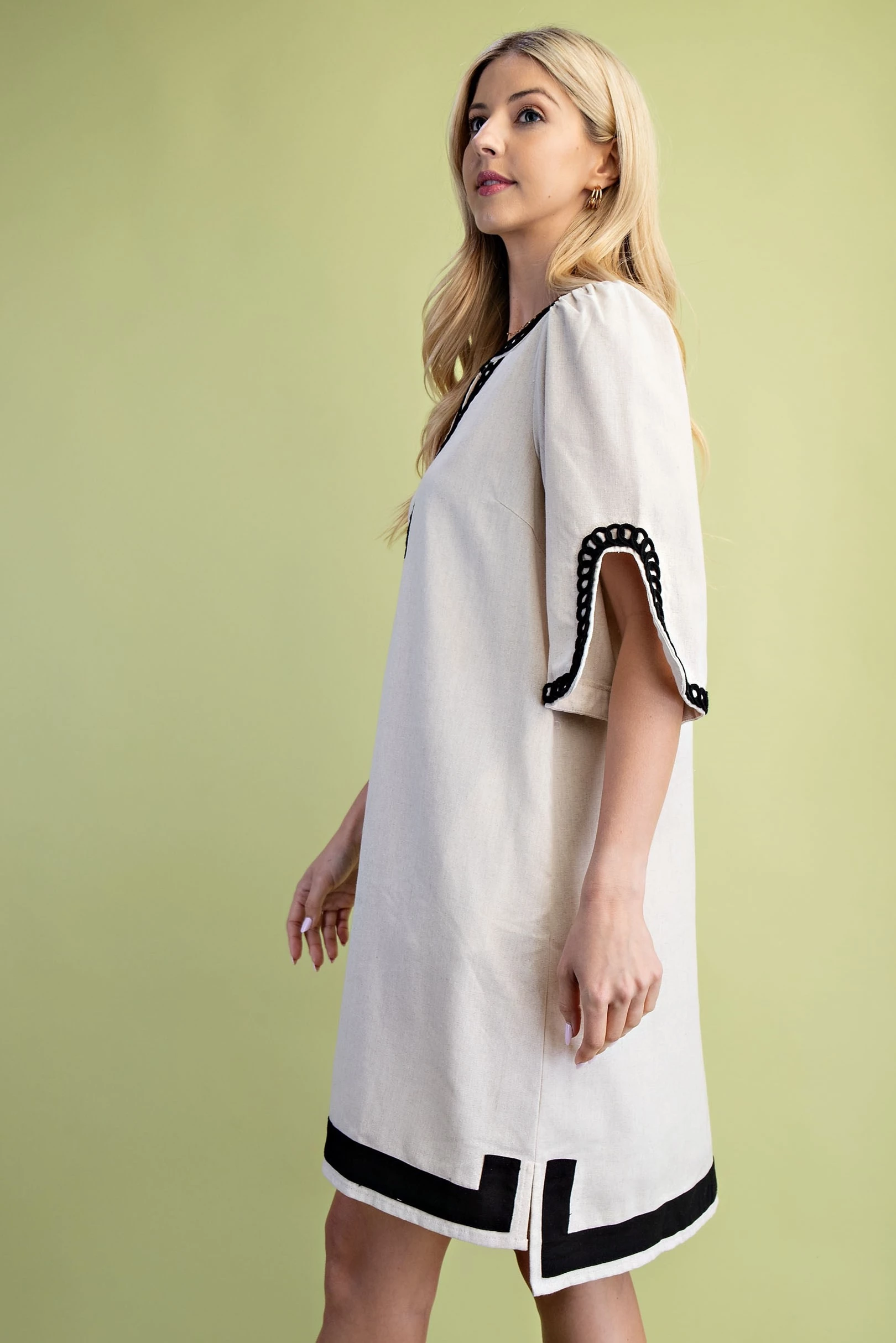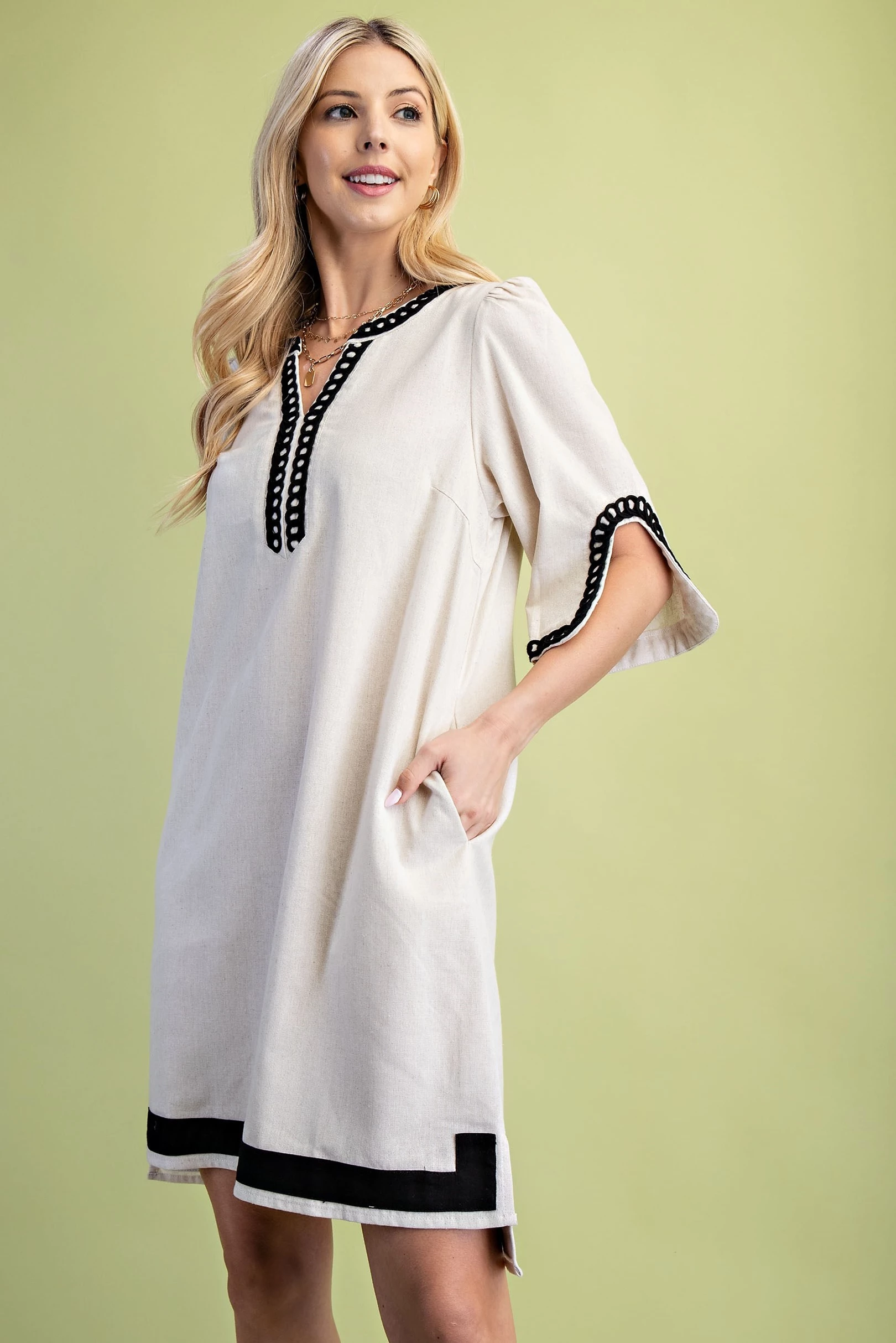 3/4 Sleeve Linen Notch Neck Dress with Embroidered Details