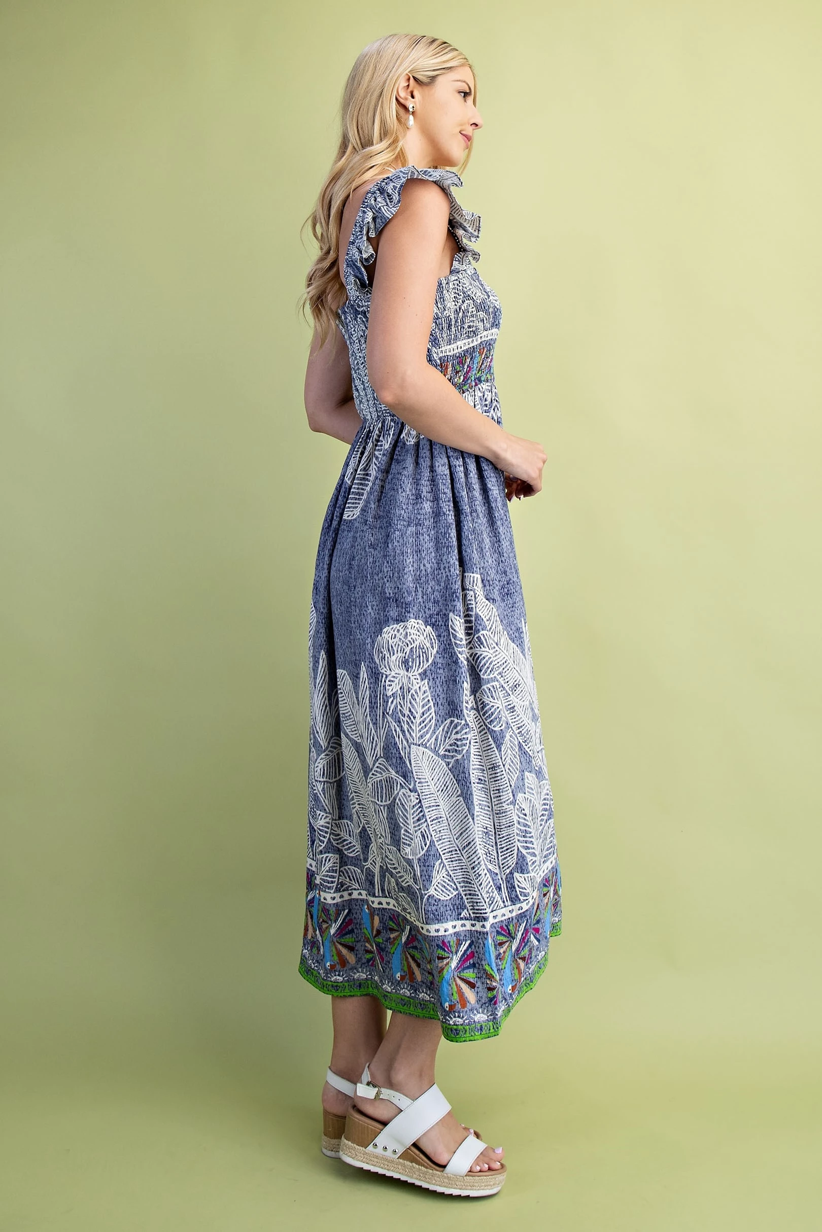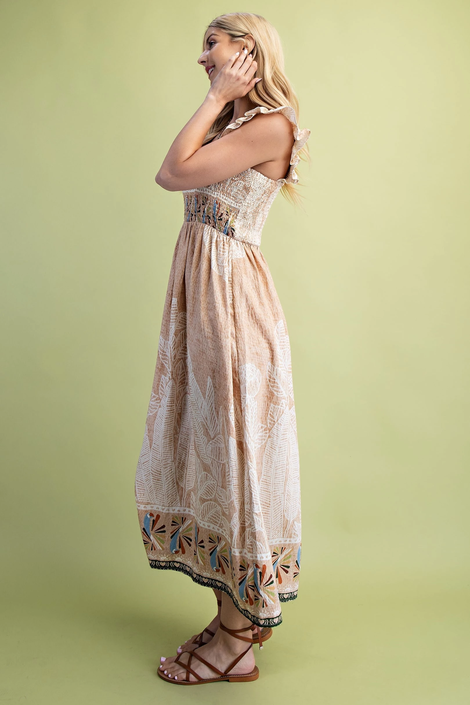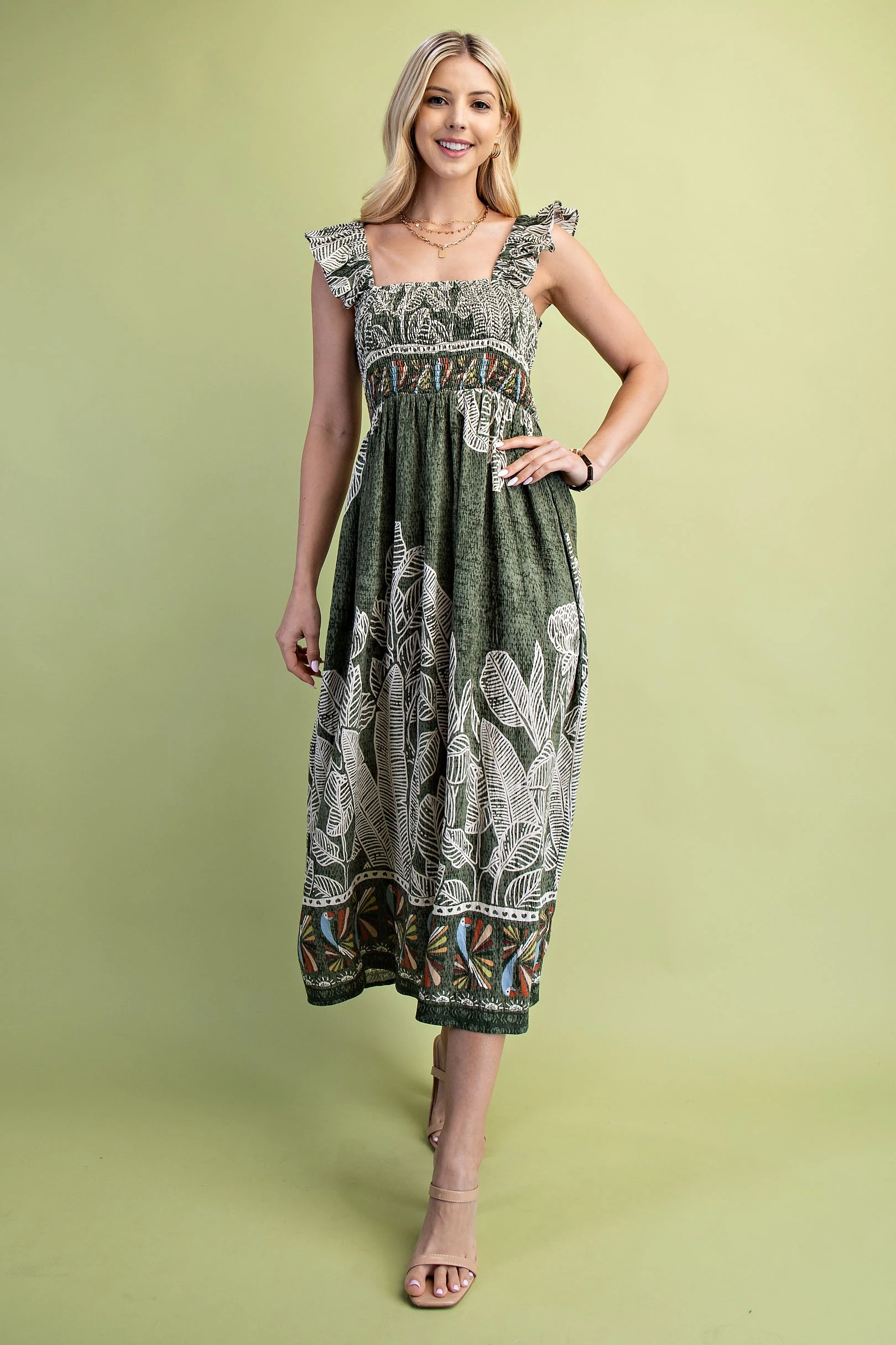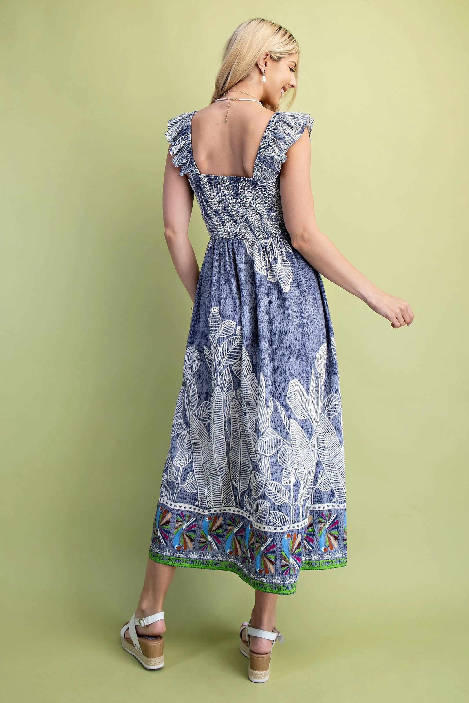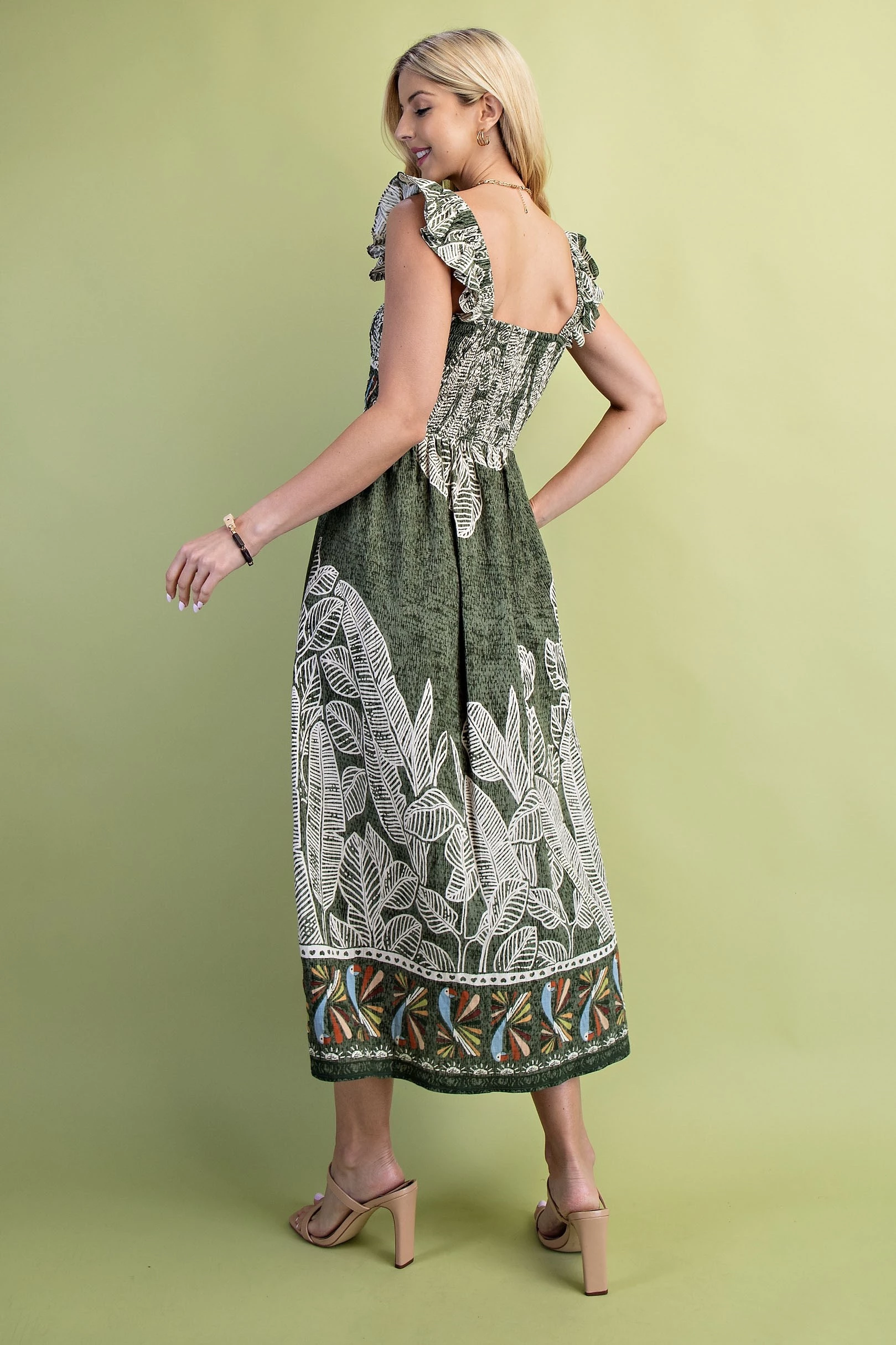 Palm and Parrot Print Midi Dress with a Smocked Bodice and Elastic Ruffle Sleeves