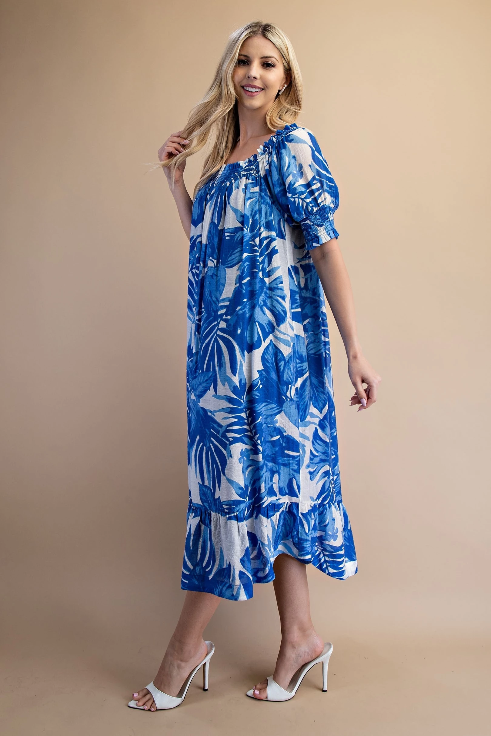 Vibrant Palm Print Square Neck Midi Dress with Smocking Details