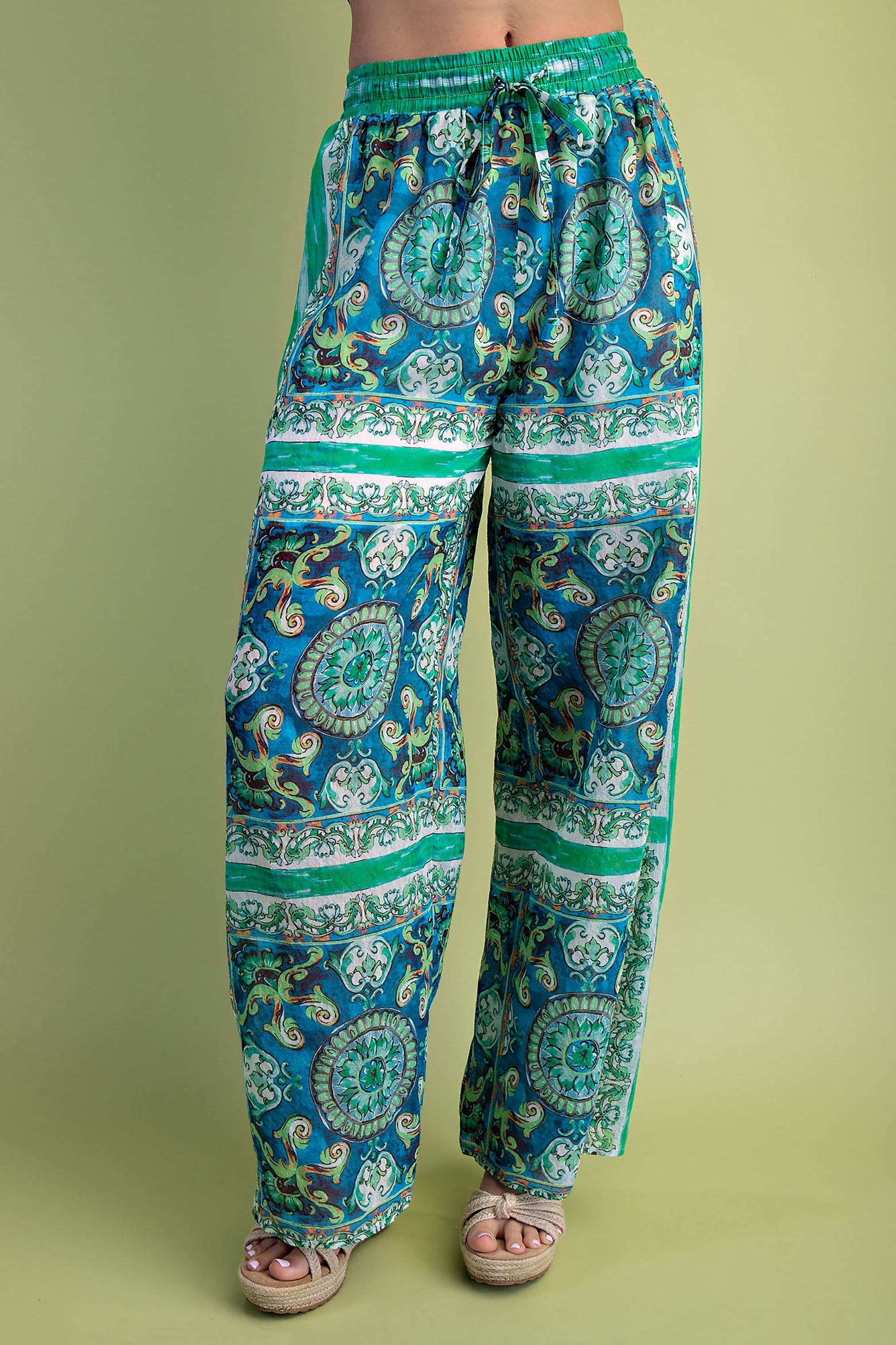 Scarf Print Relaxed Fit Pants with and an Elastic Waist and Drawstring and Shorts Lining