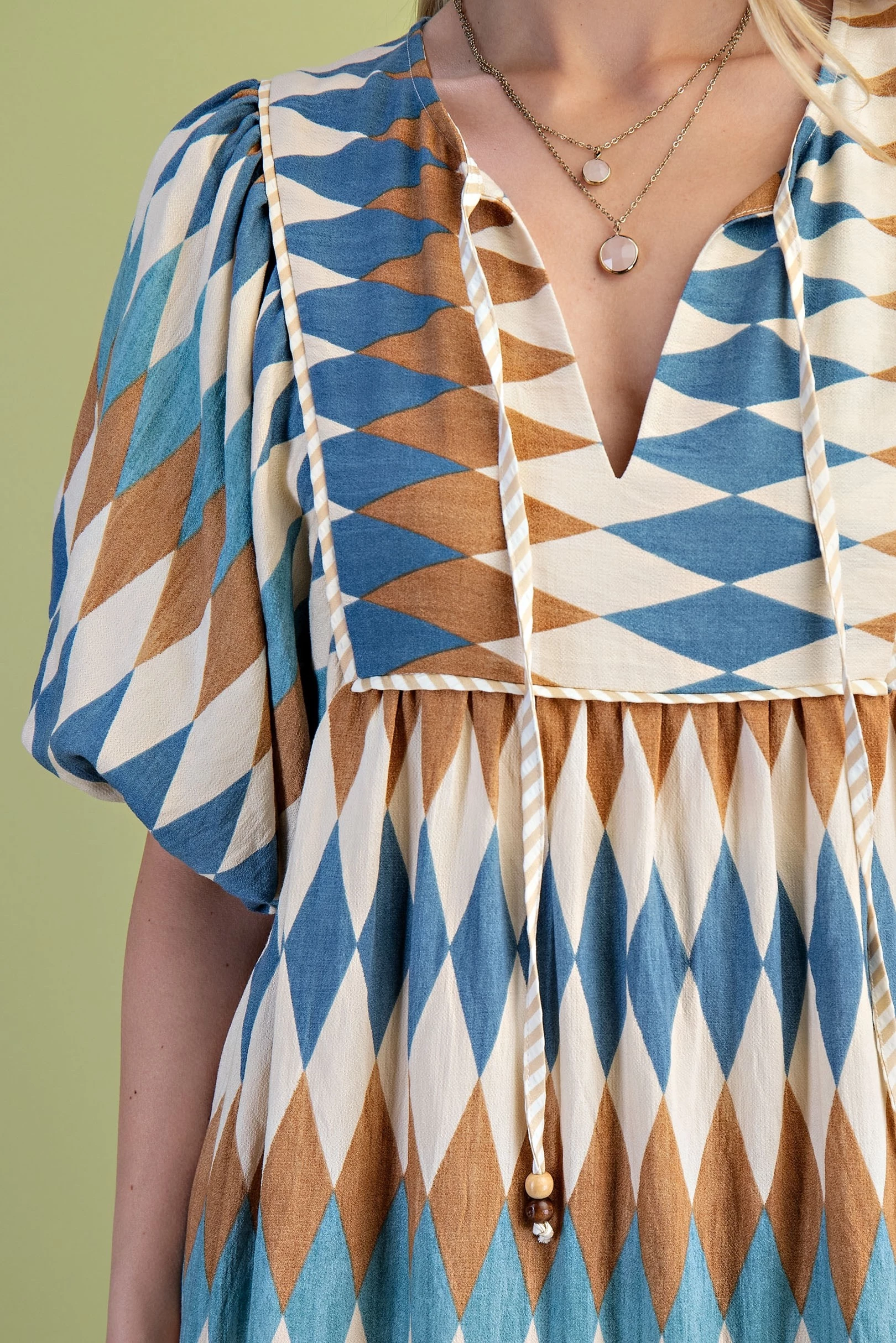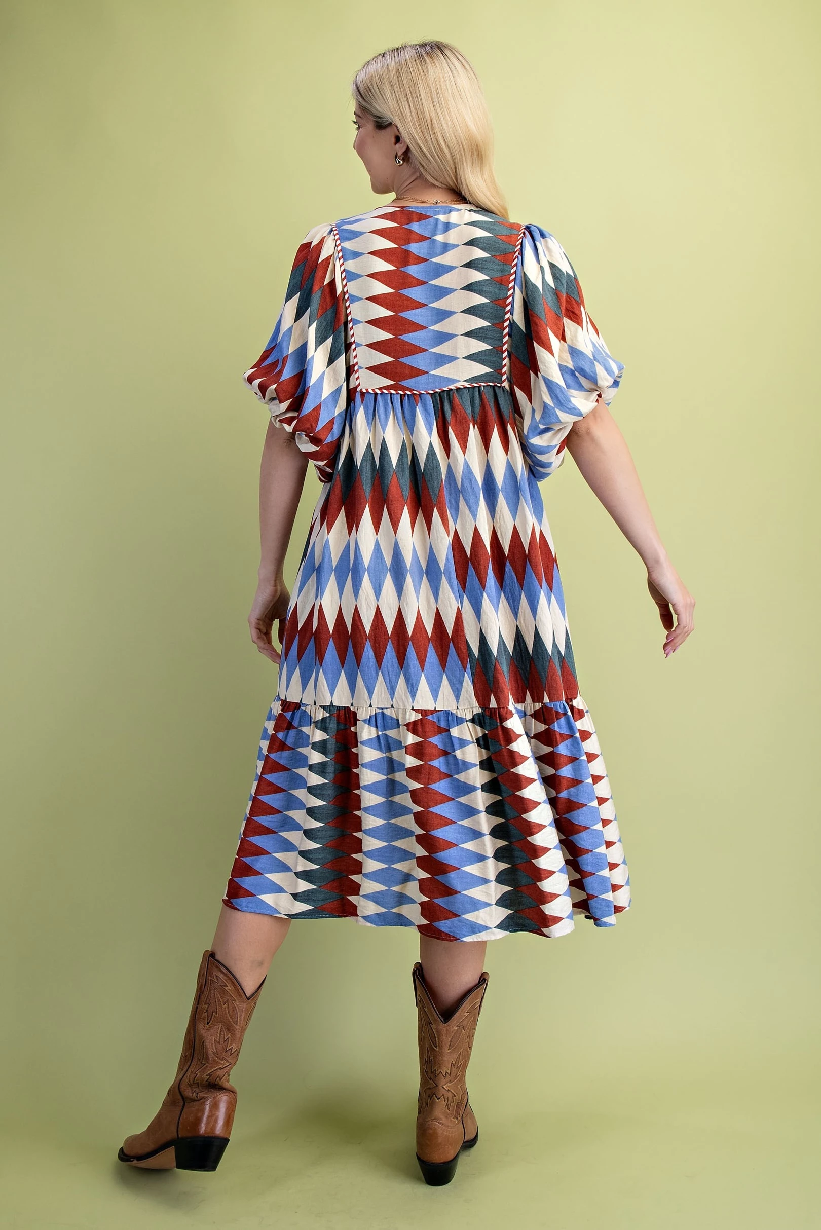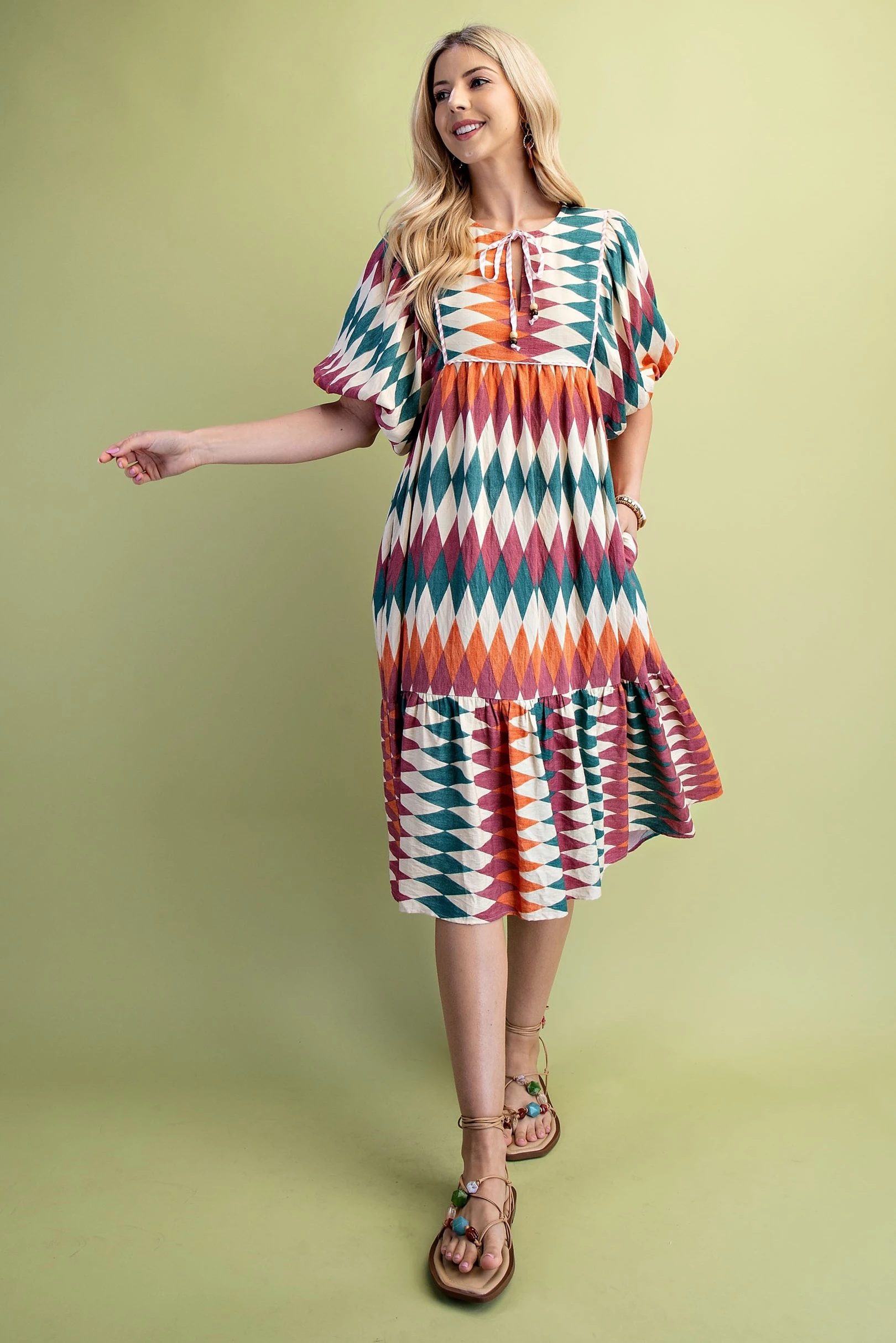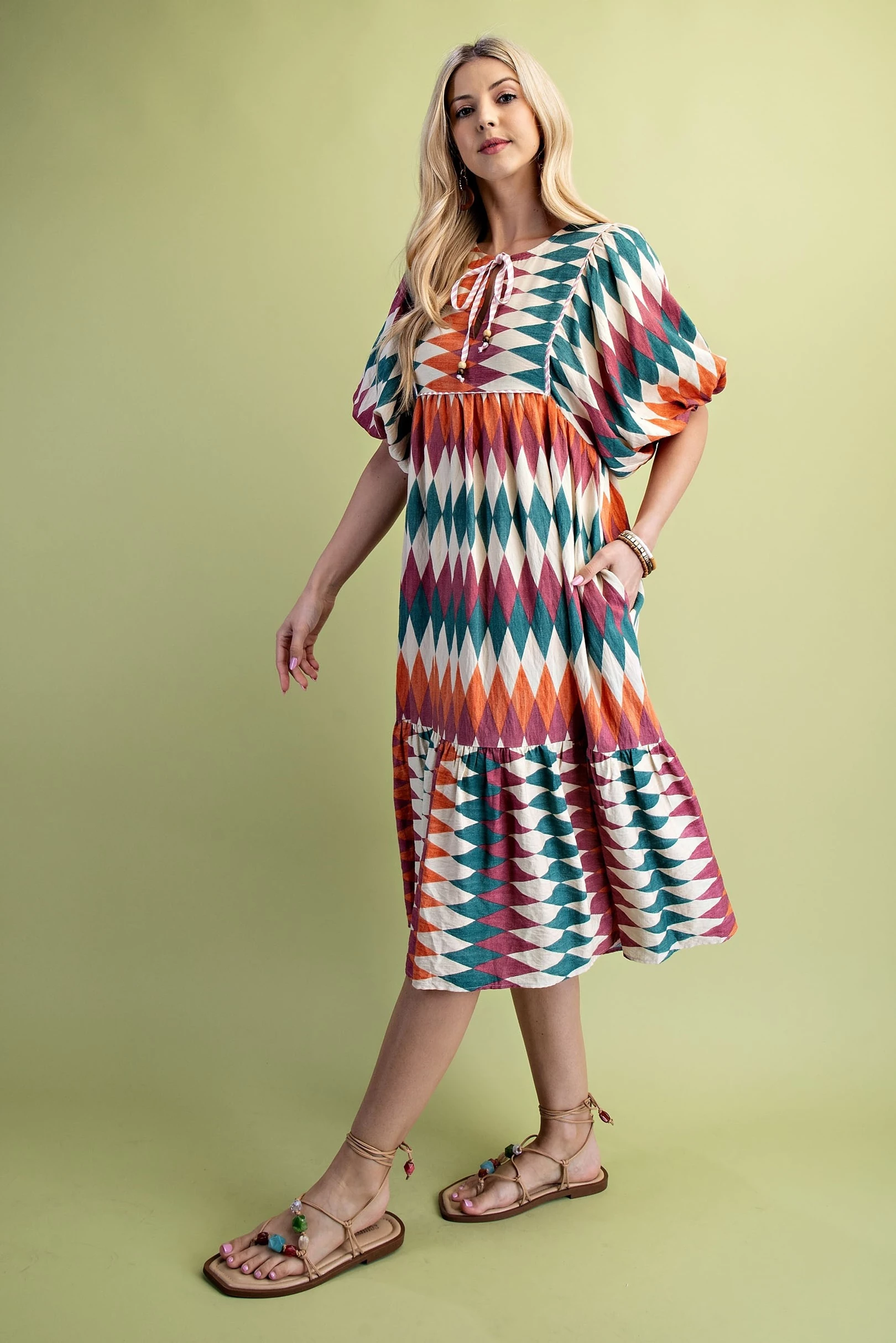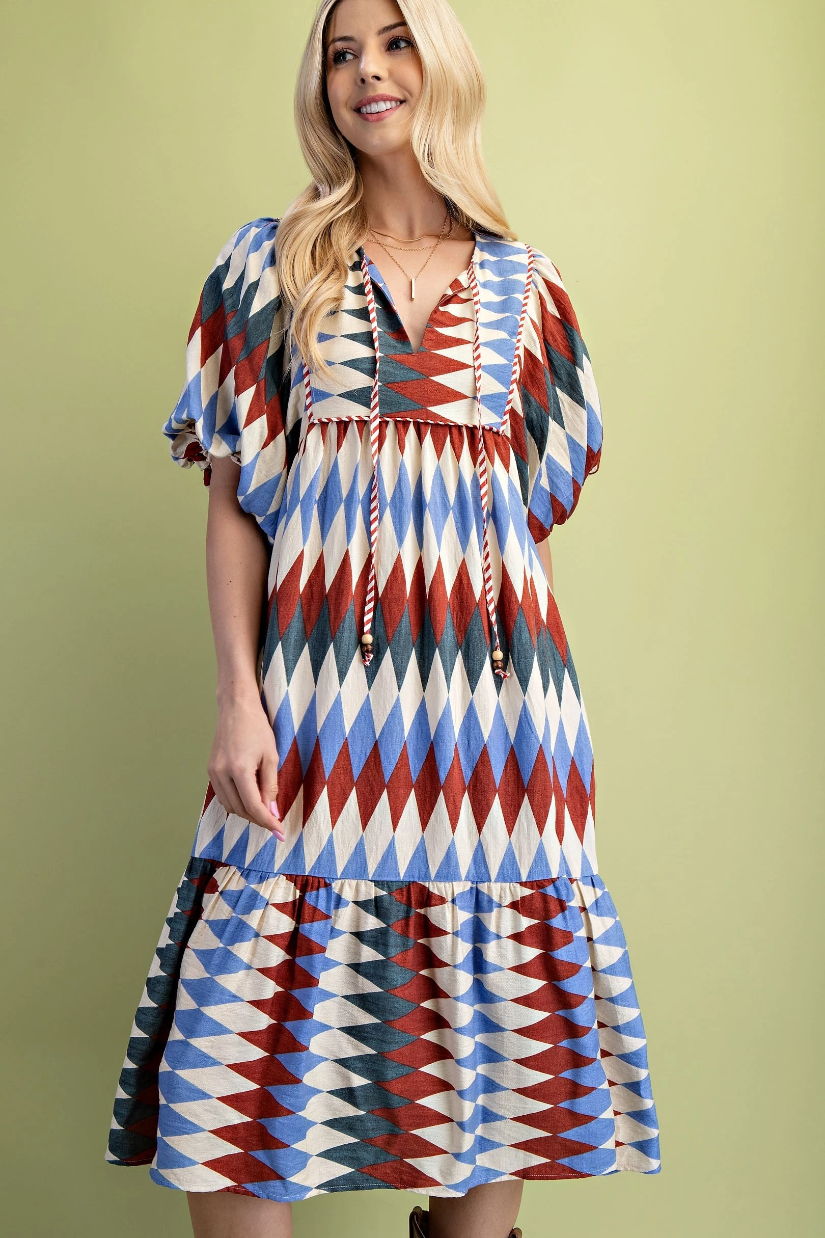 Diamond Print Midi Dress with Striped Binding Details and a Beaded Neck Tie