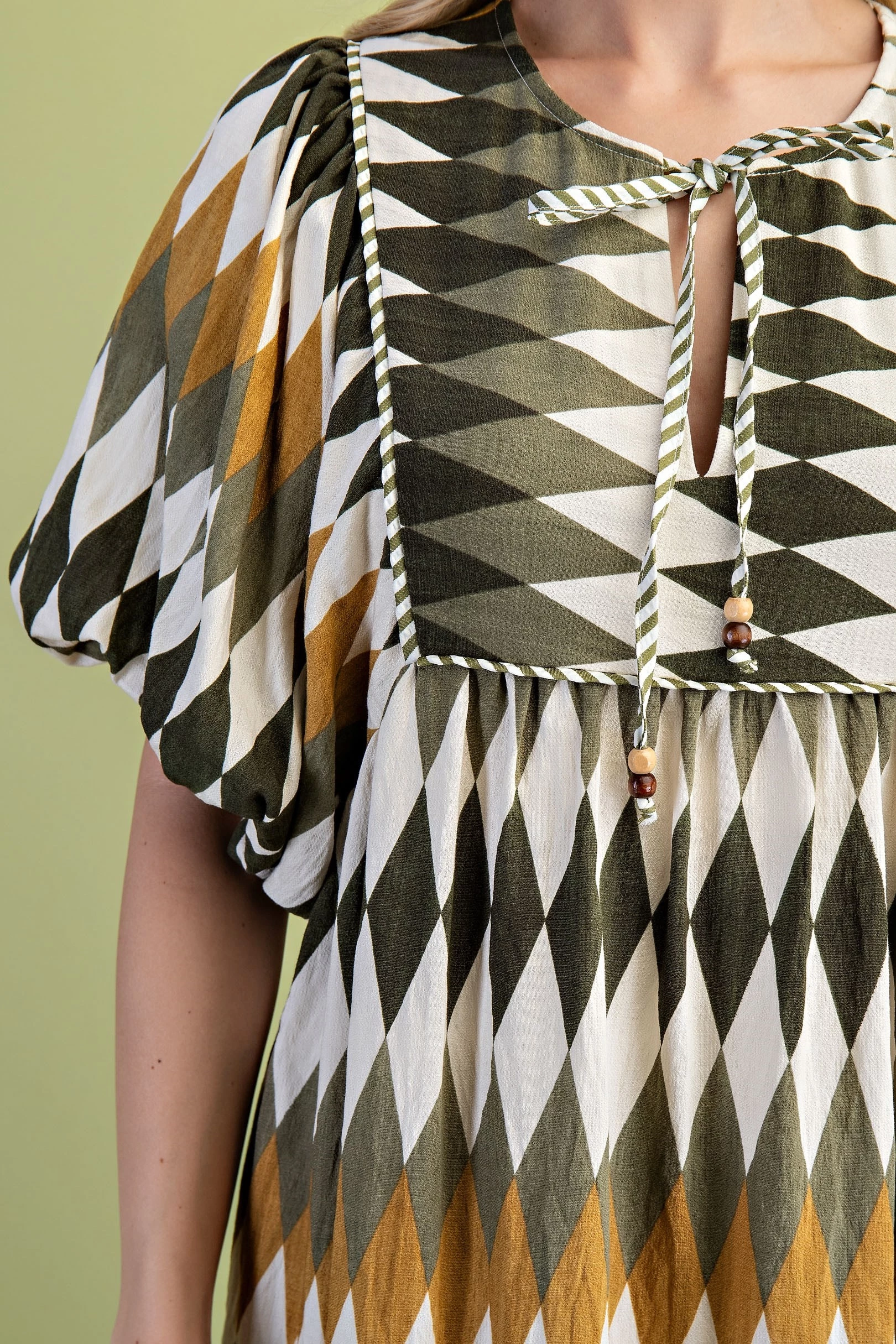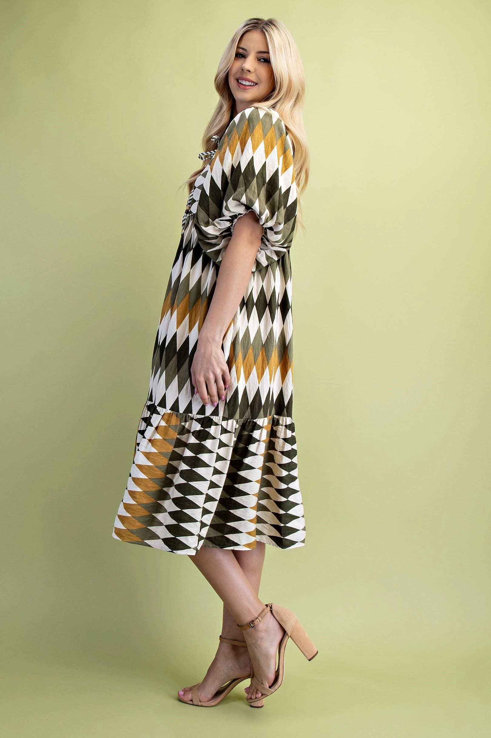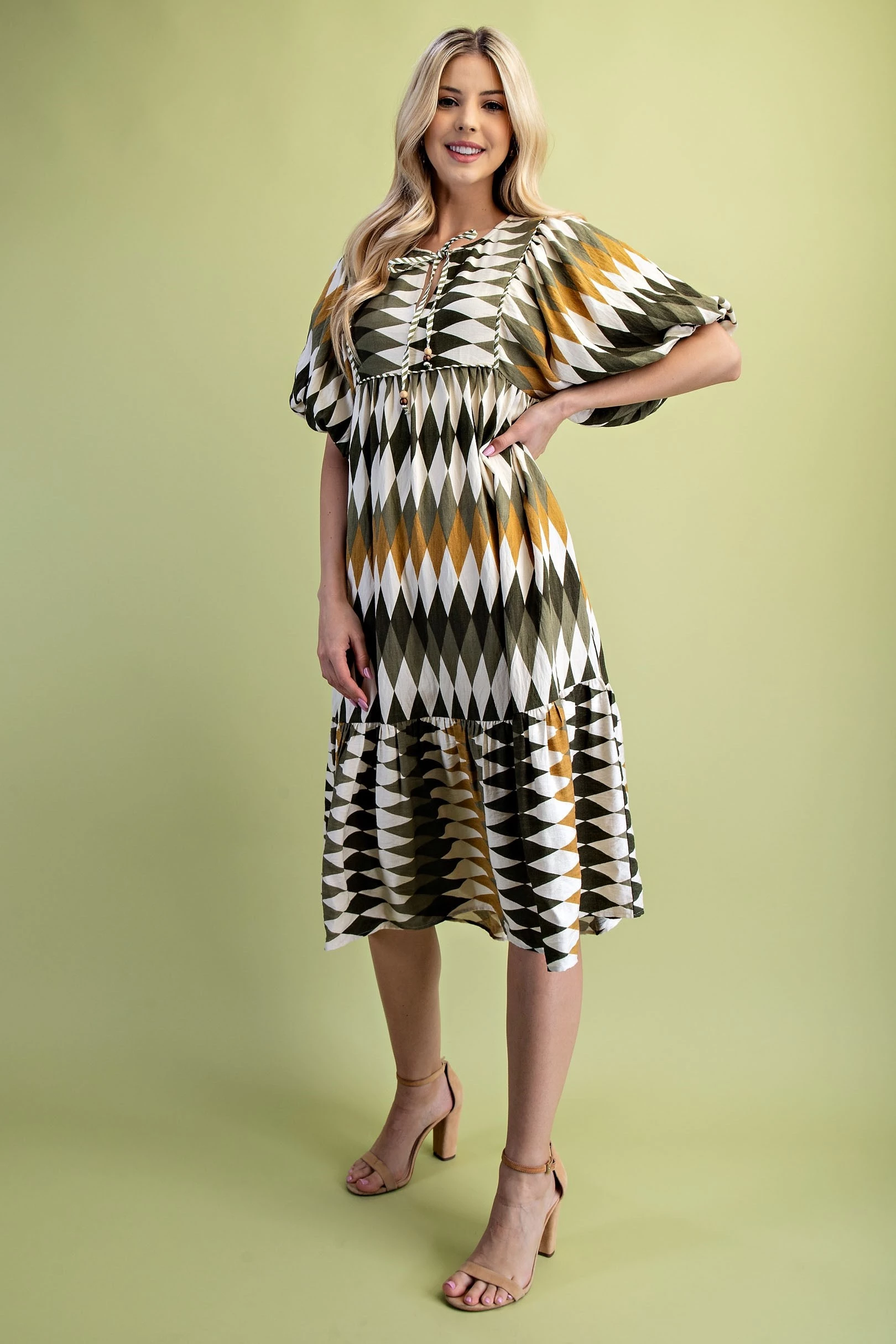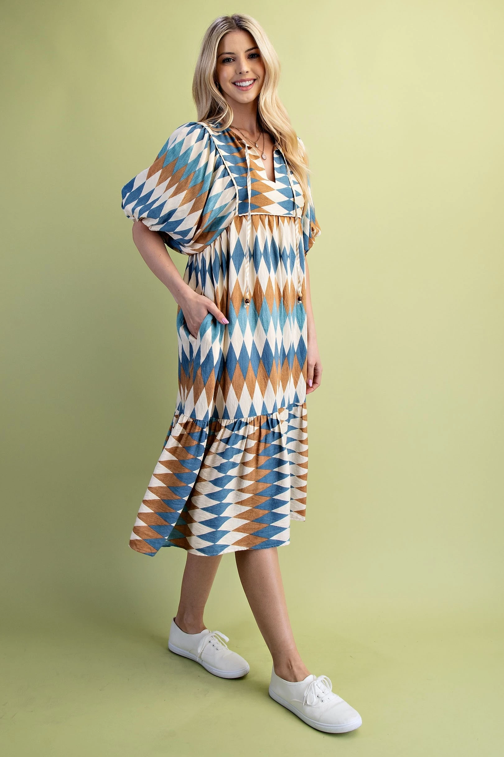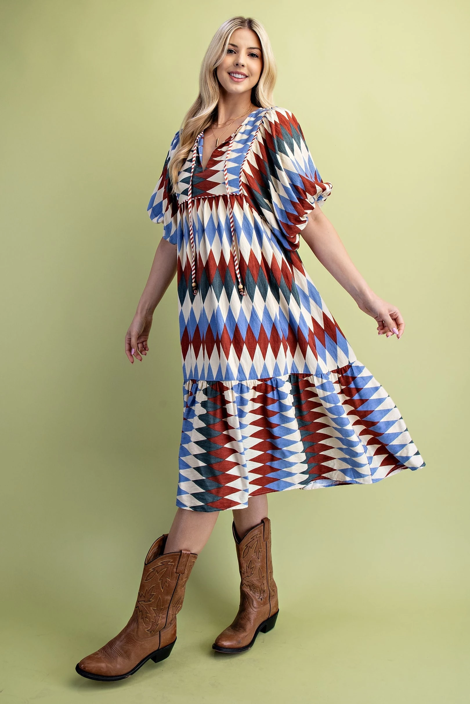 Diamond Print Midi Dress with Striped Binding Details and a Beaded Neck Tie