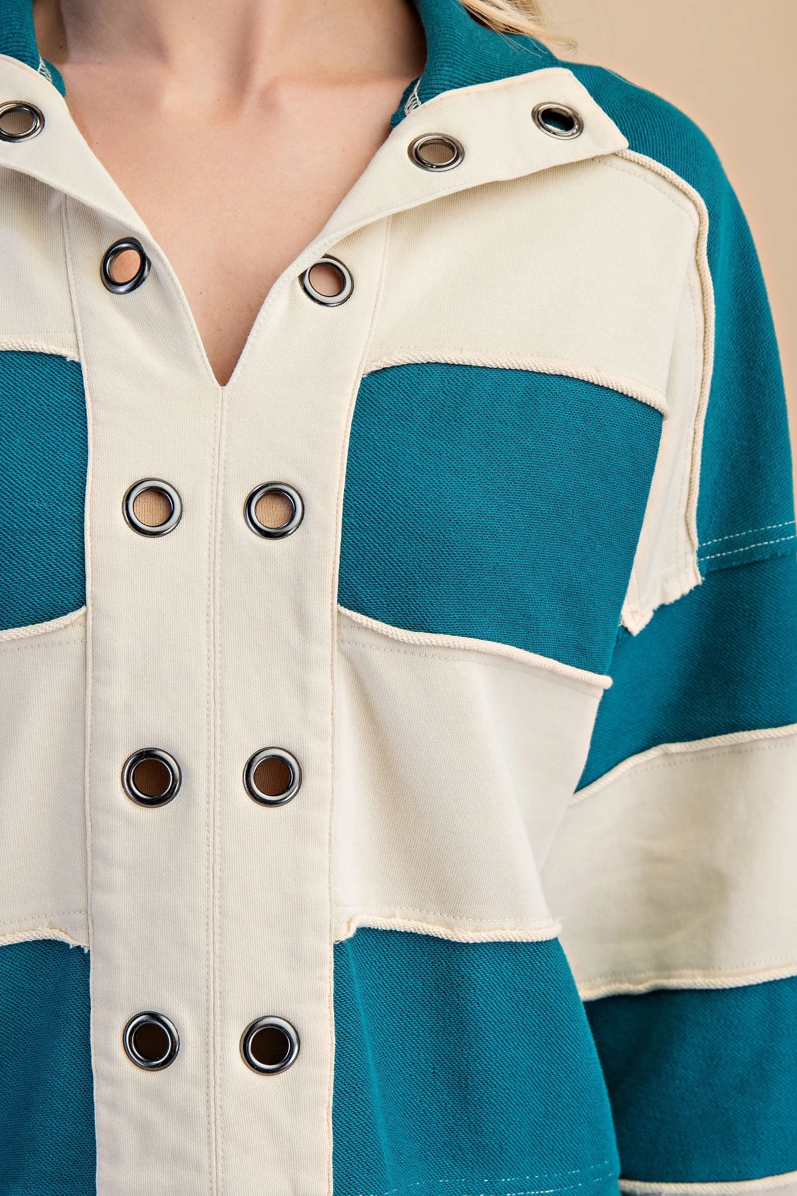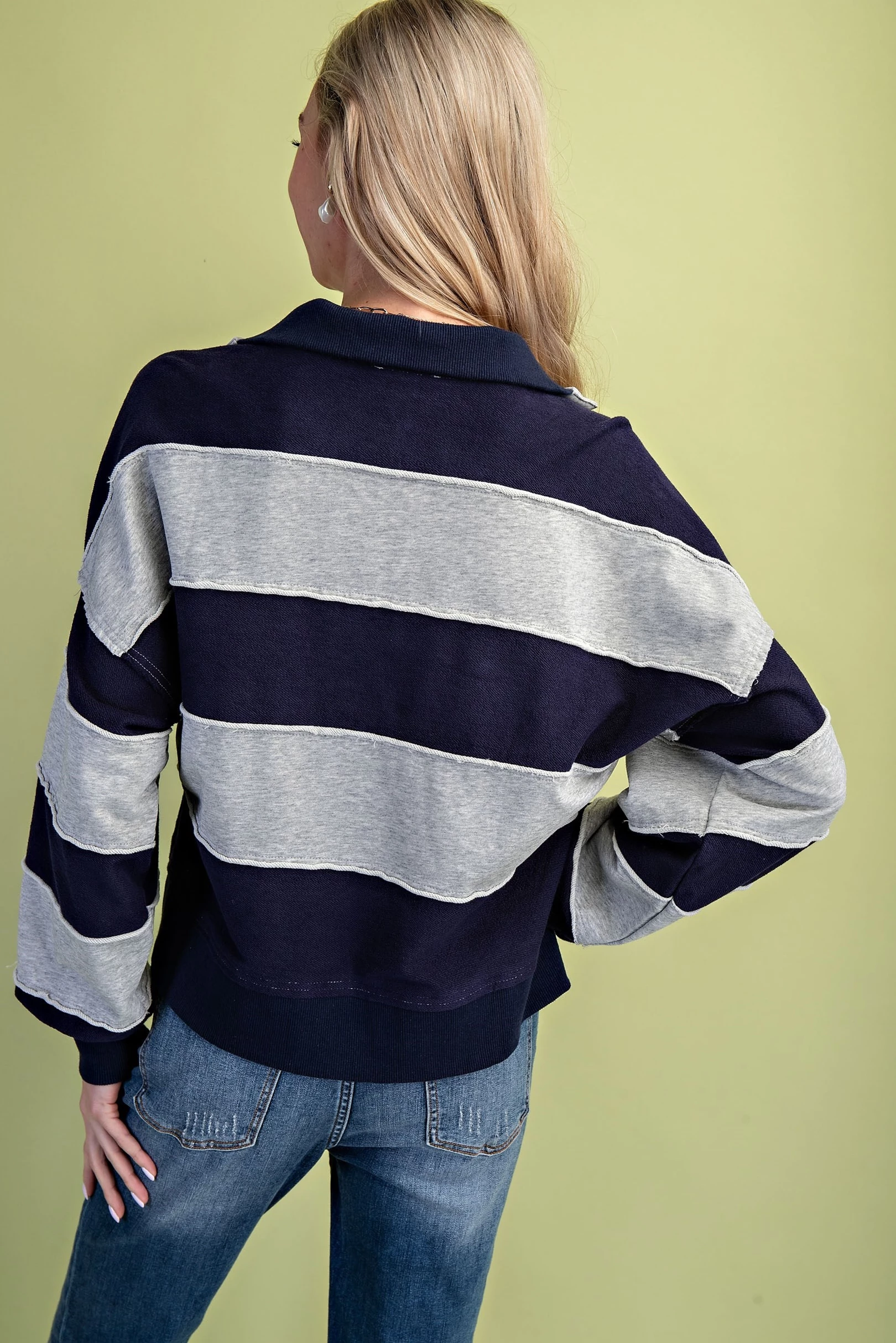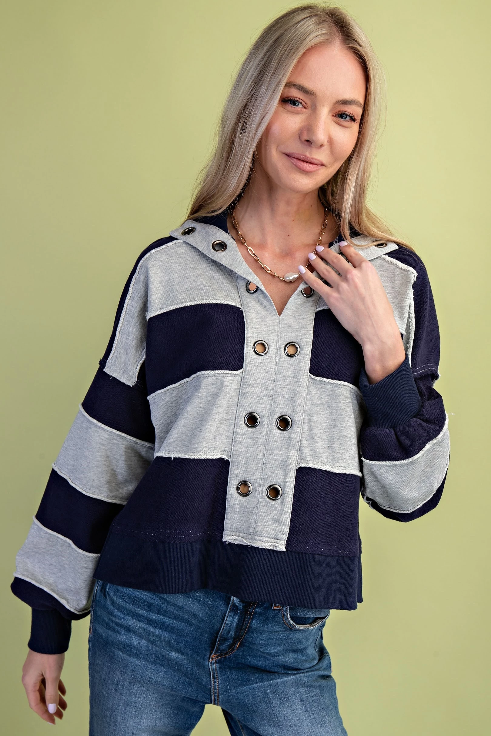 Striped Texture Mixed Rugby Style Sweatshirt with Grommet Details