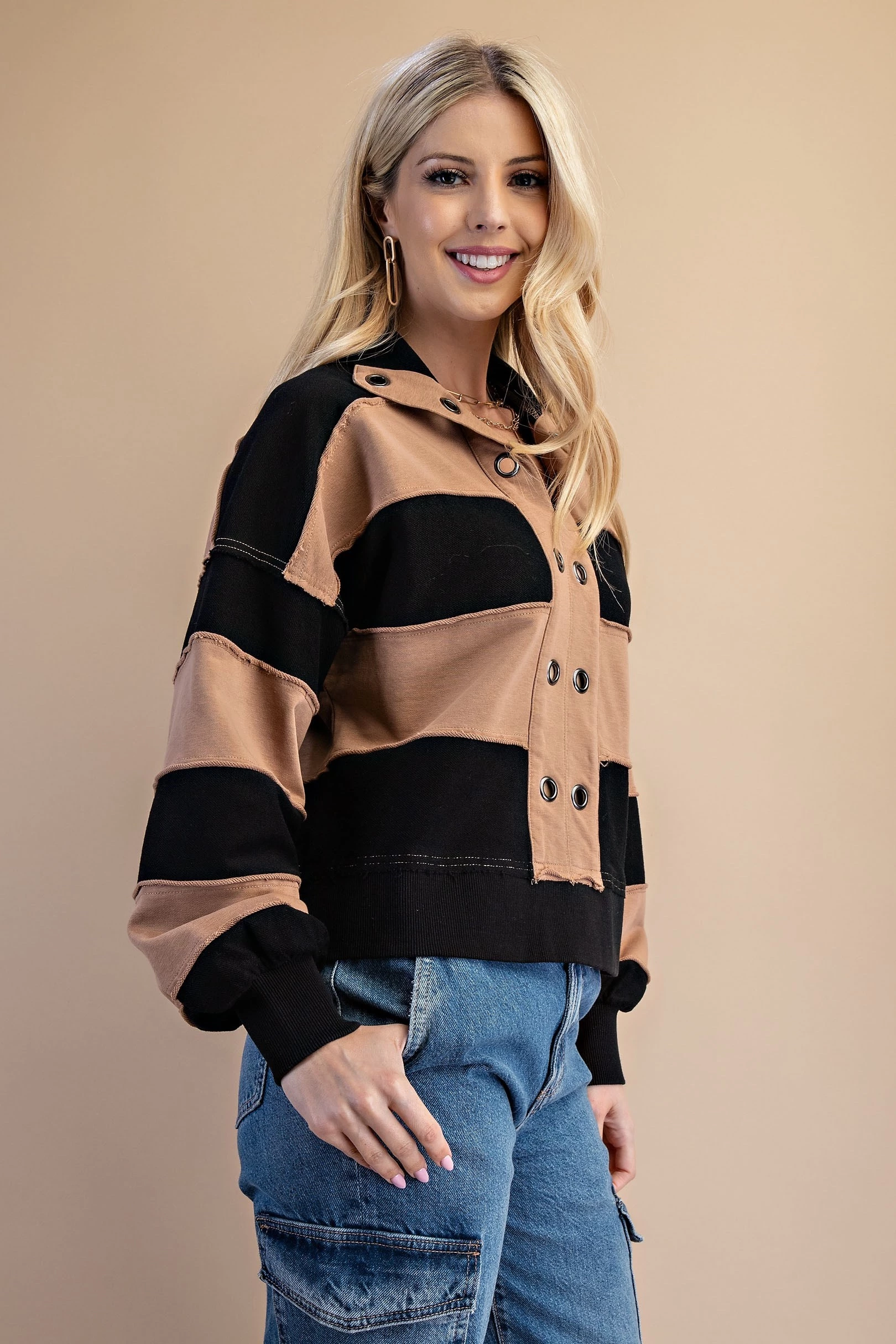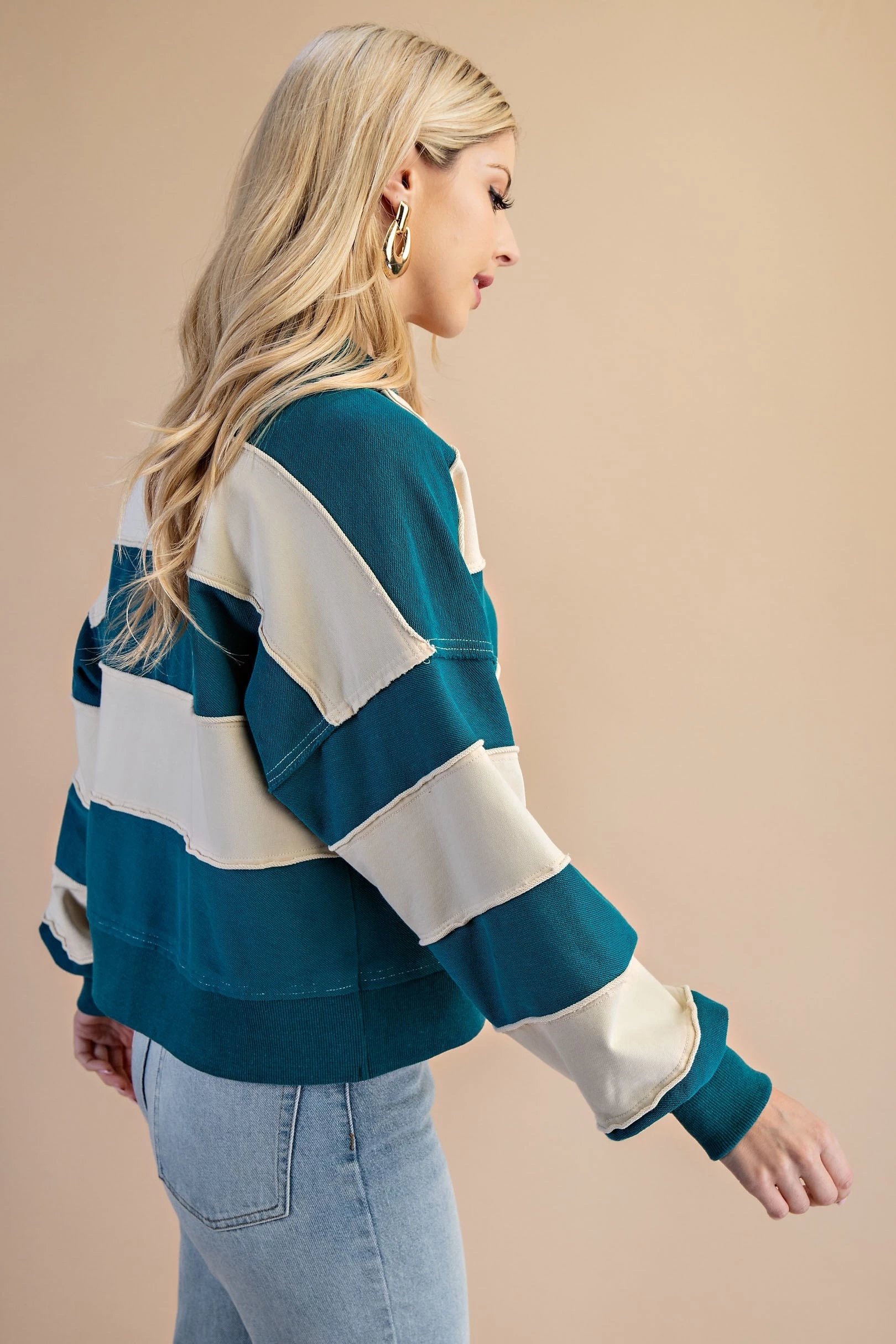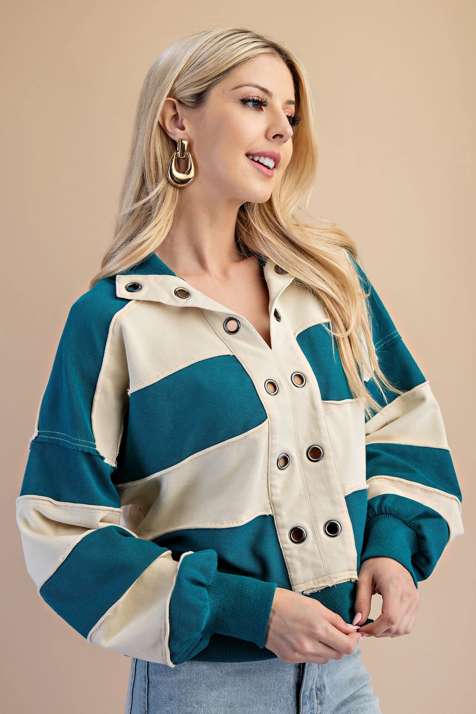 Striped Texture Mixed Rugby Style Sweatshirt with Grommet Details