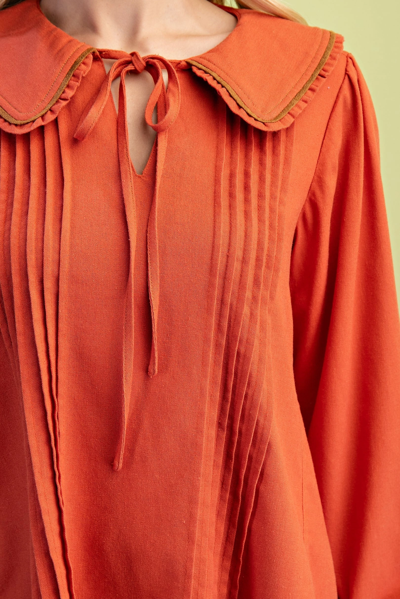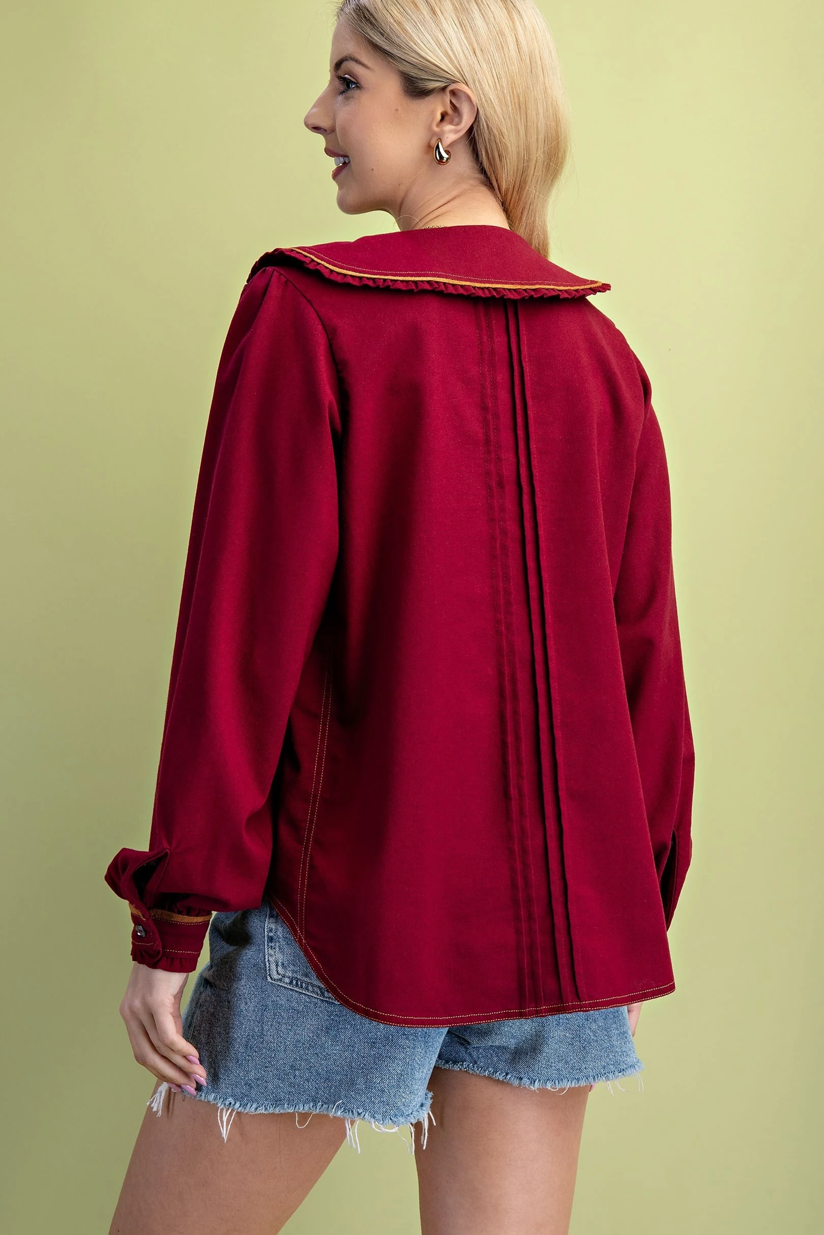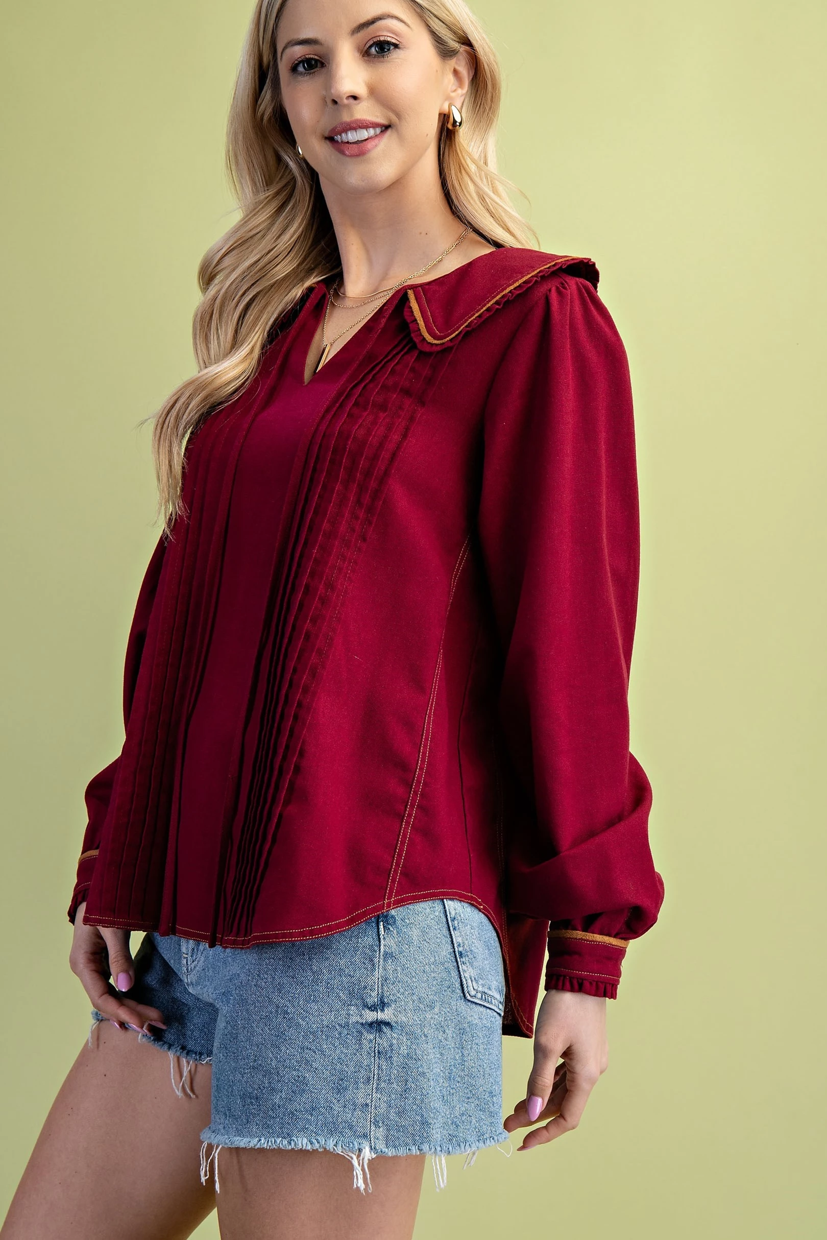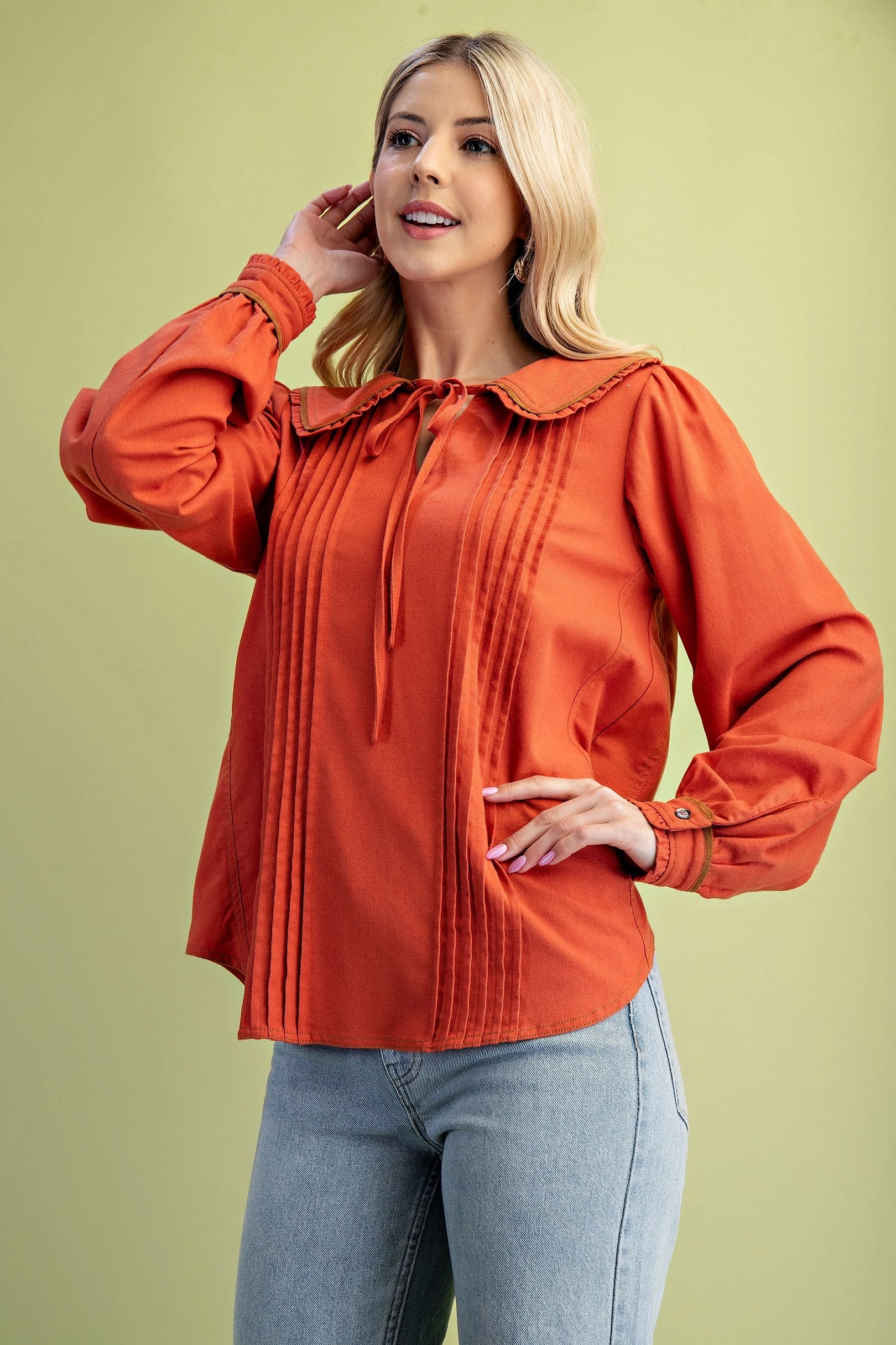 Pleated Linen Long Sleeve Top with Ruffle and Piping Details