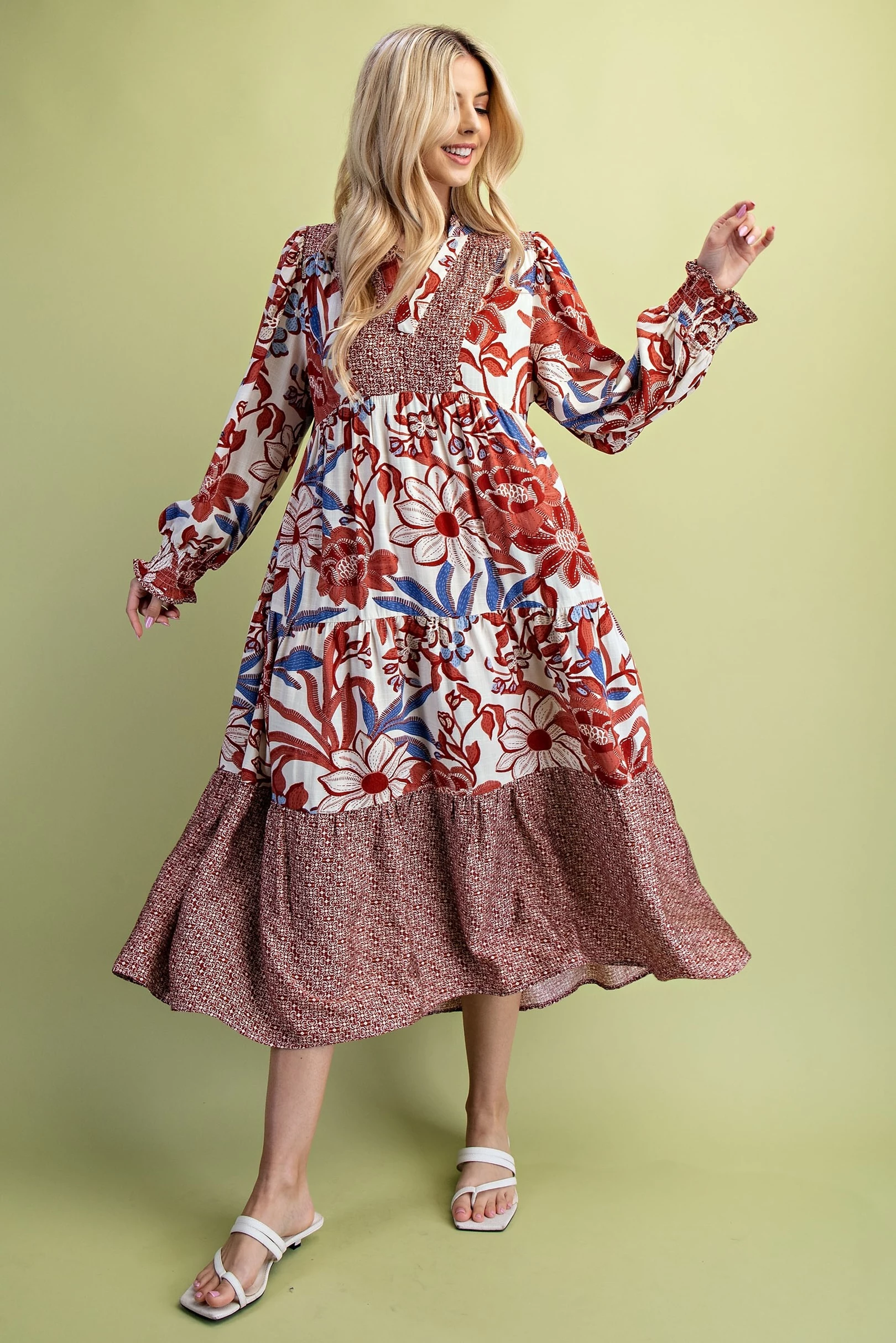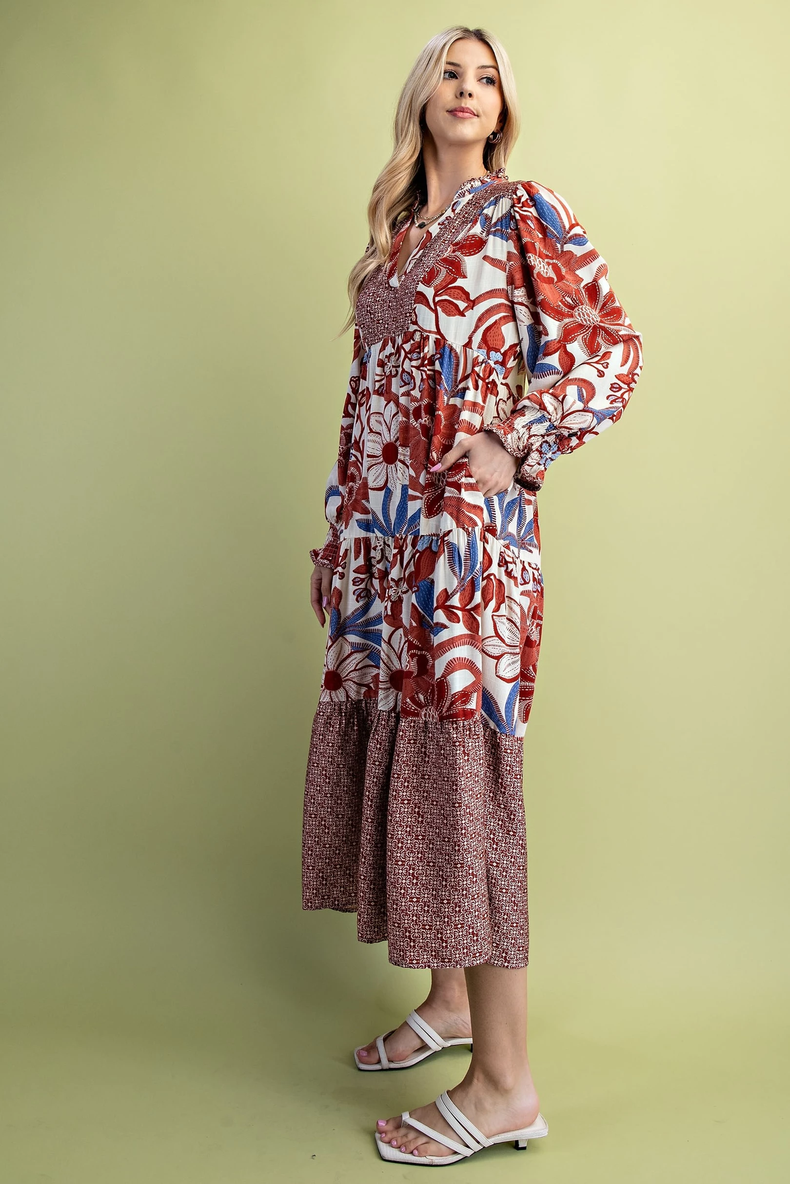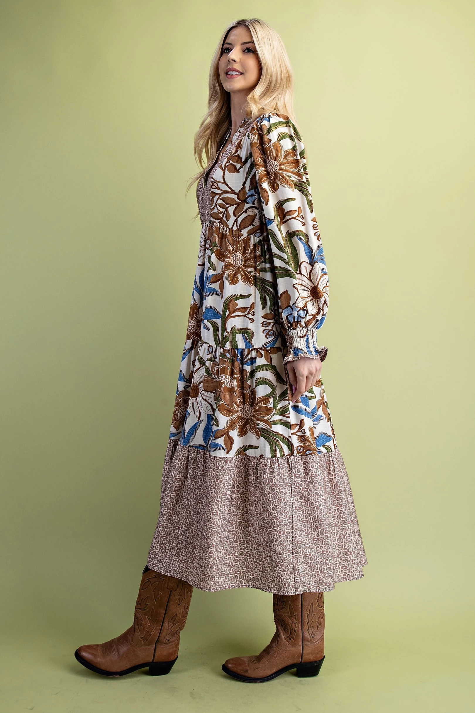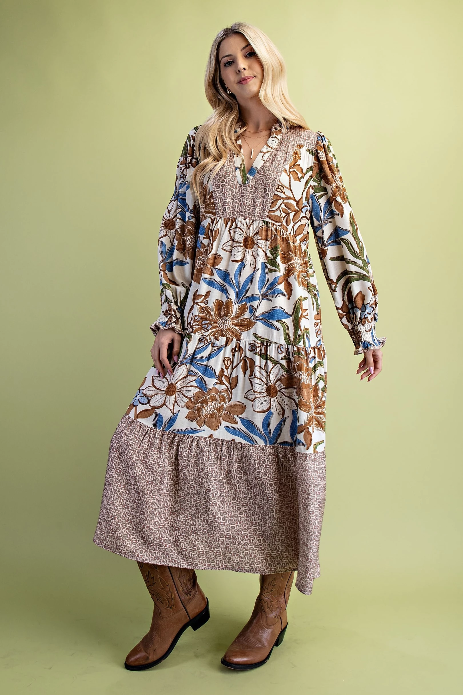 Mixed Print Tiered V-Neck Midi Dress
