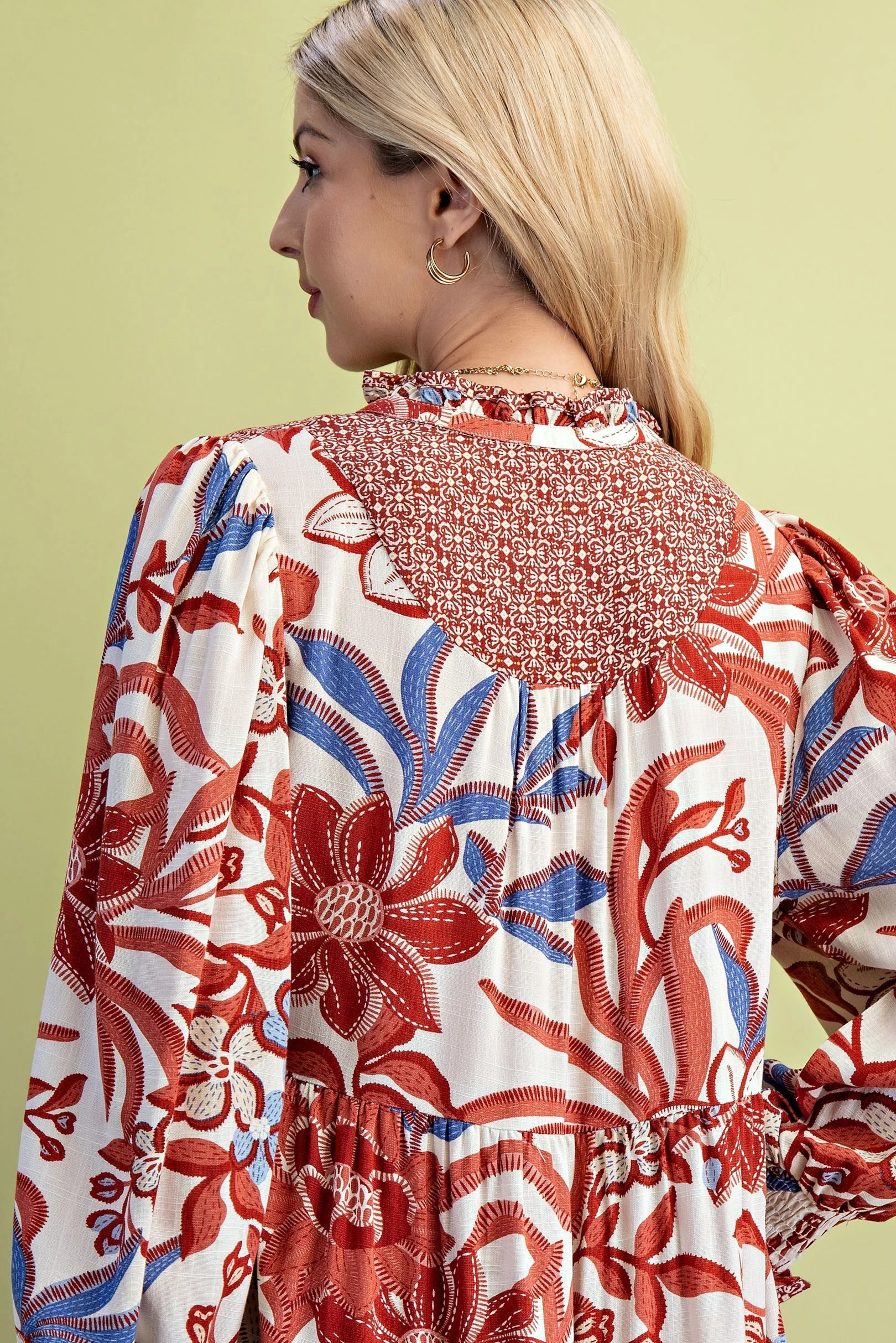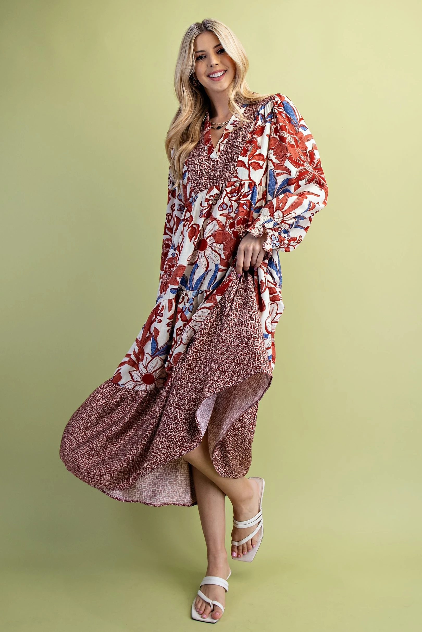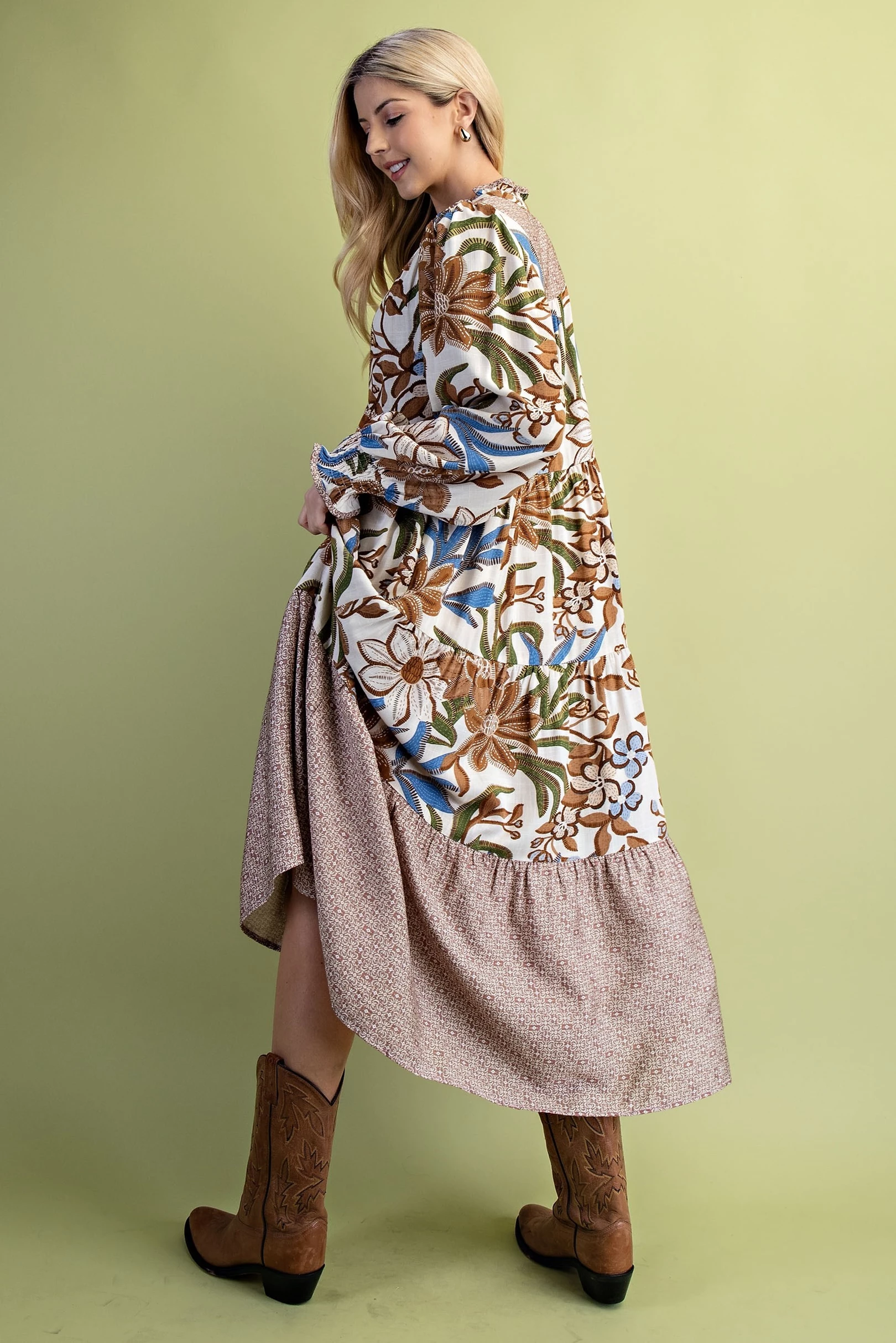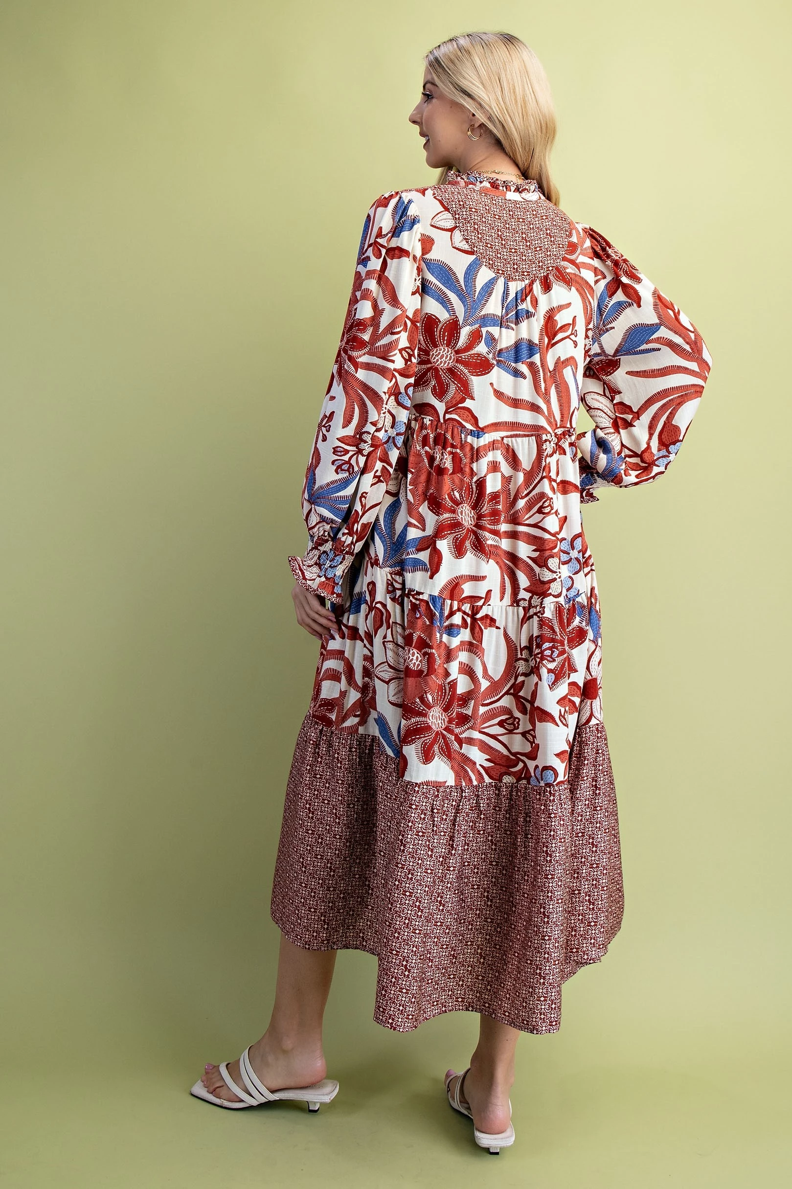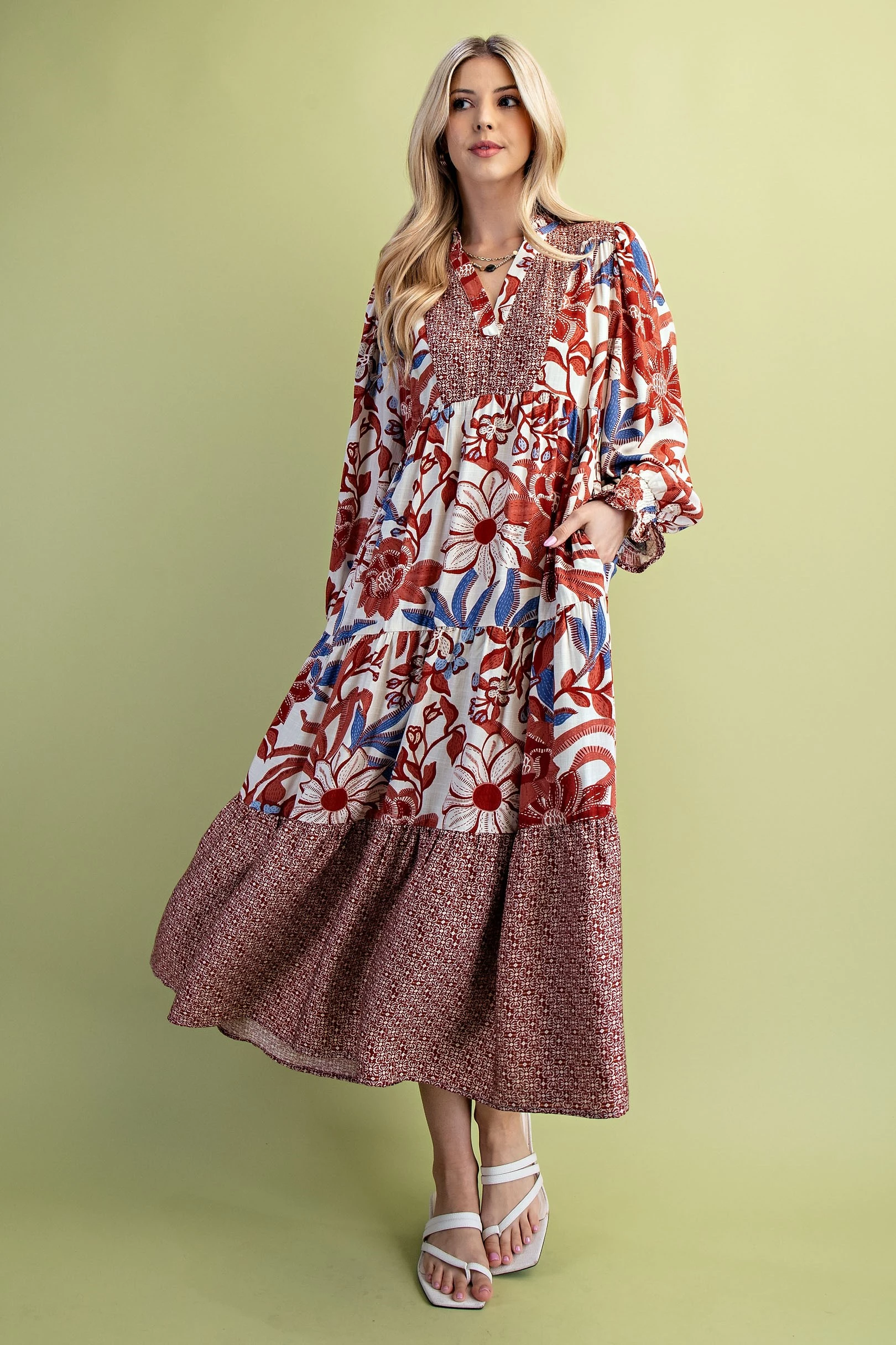 Mixed Print Tiered V-Neck Midi Dress