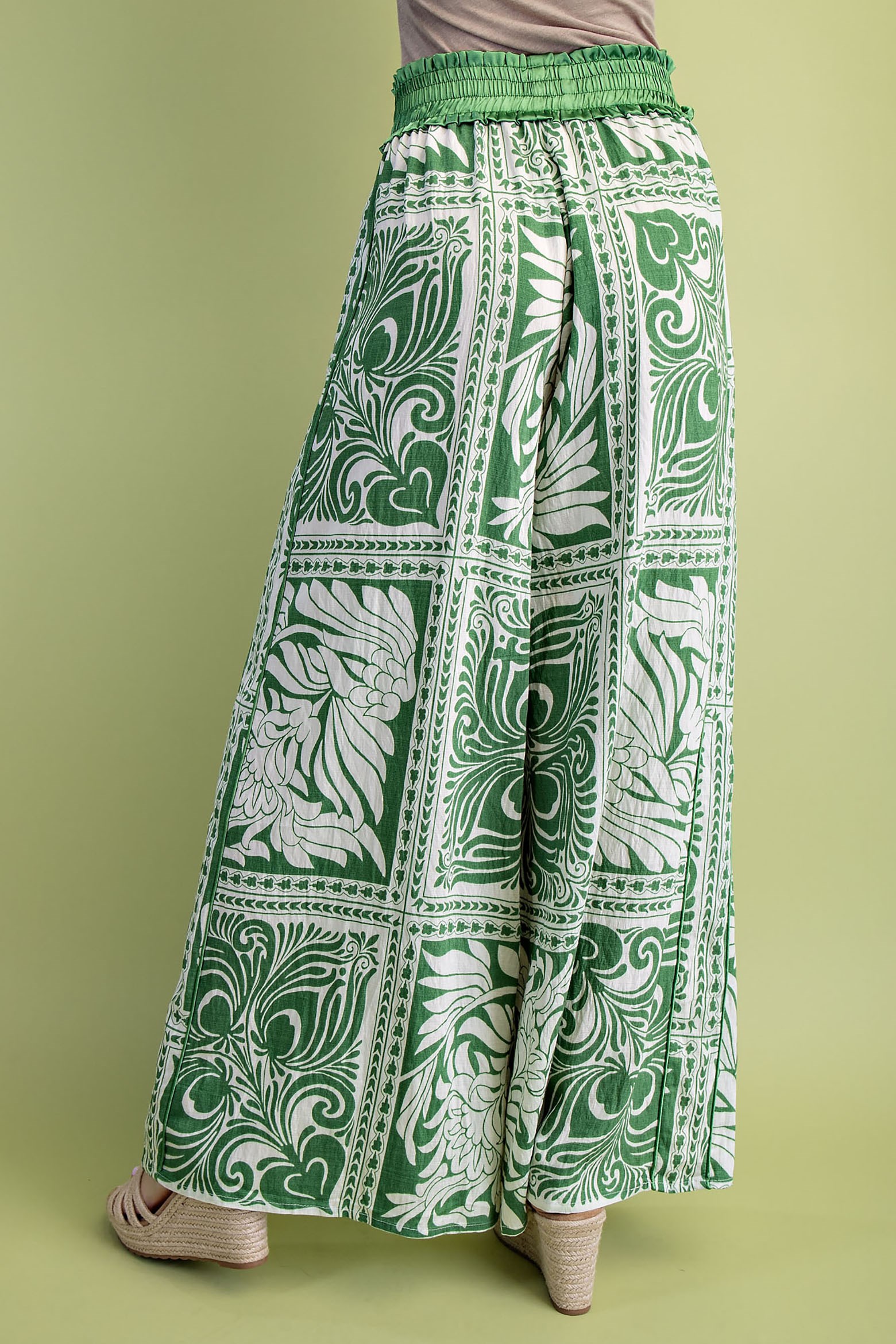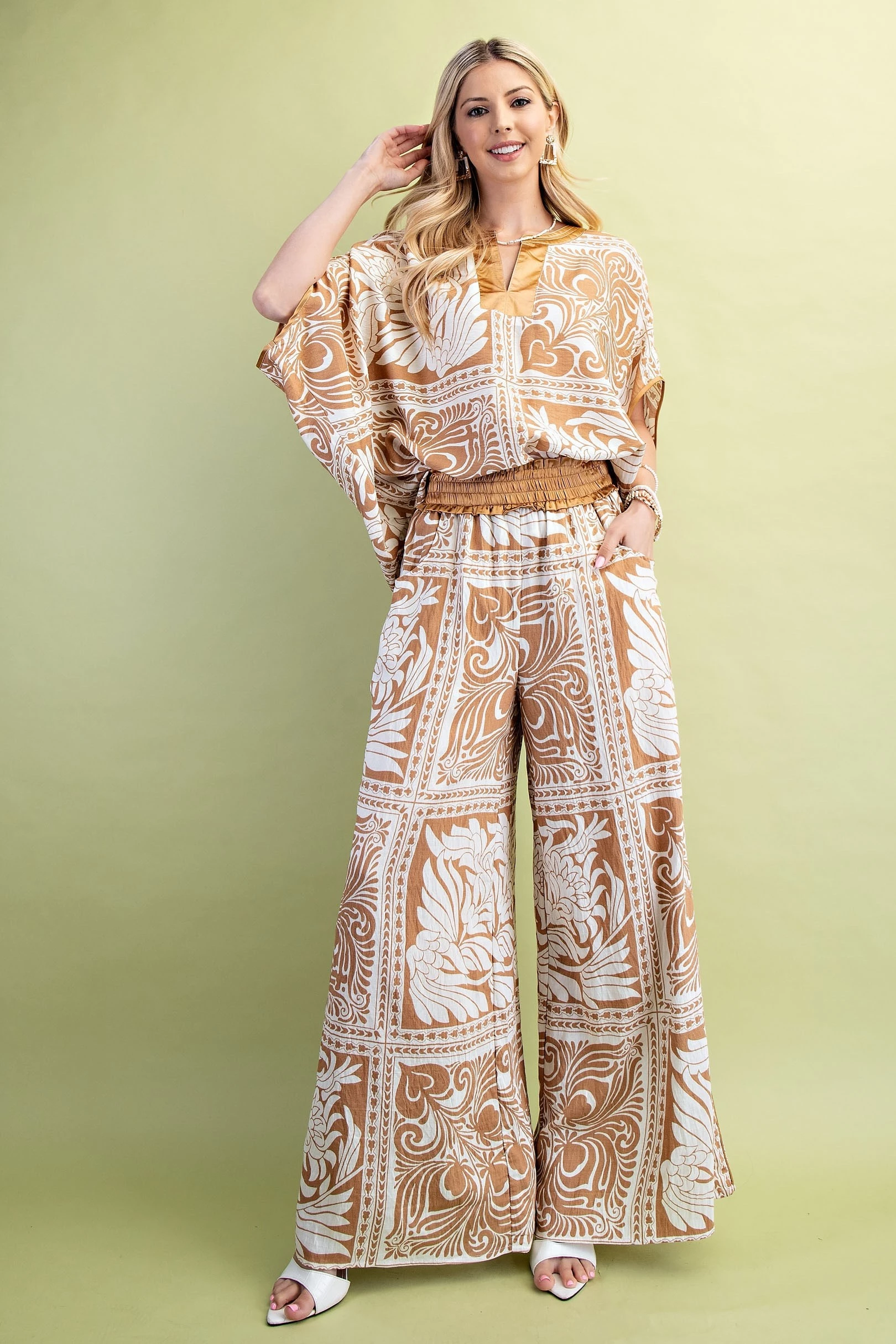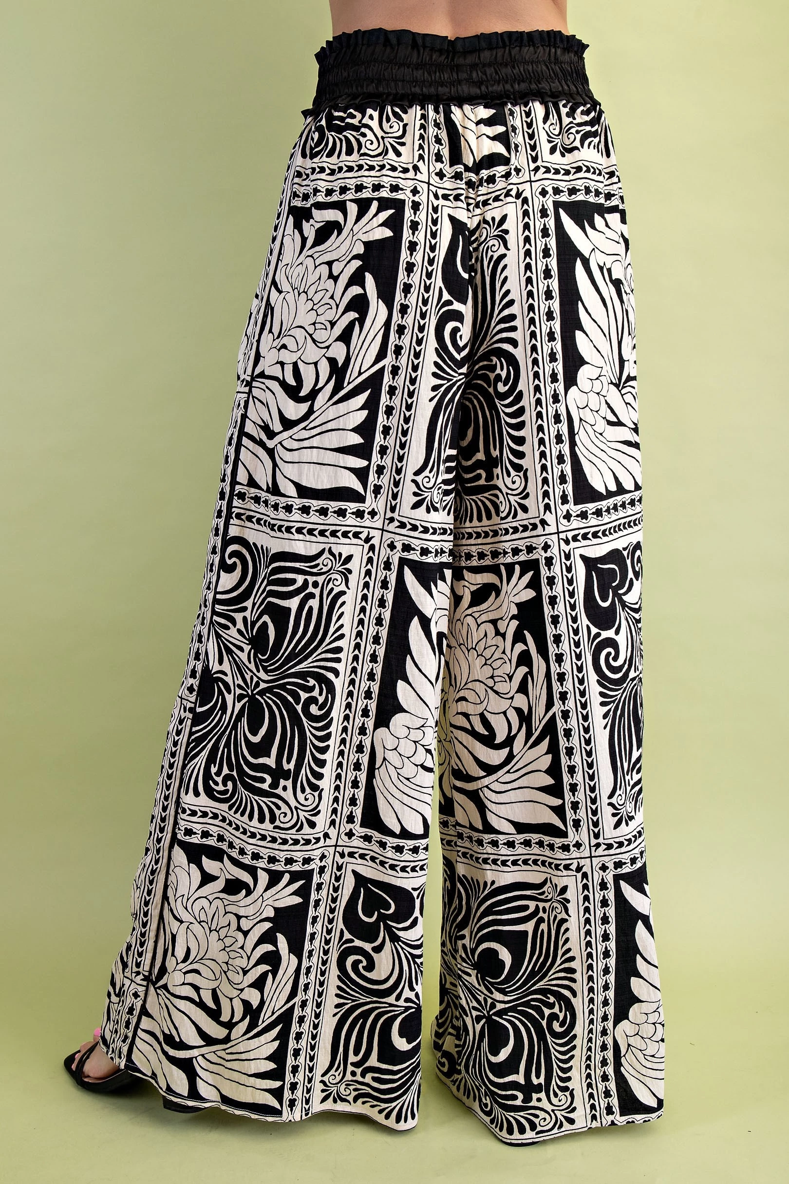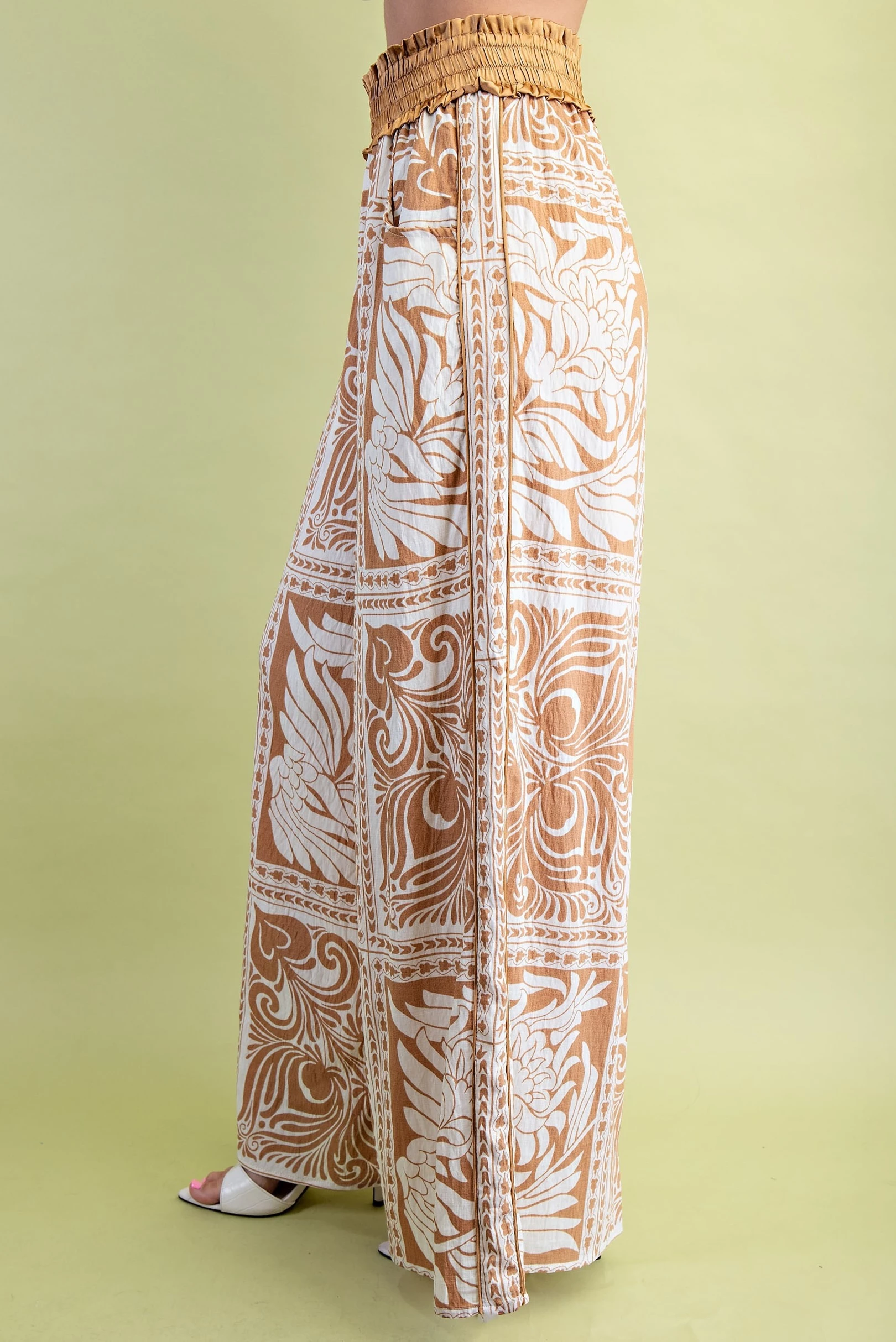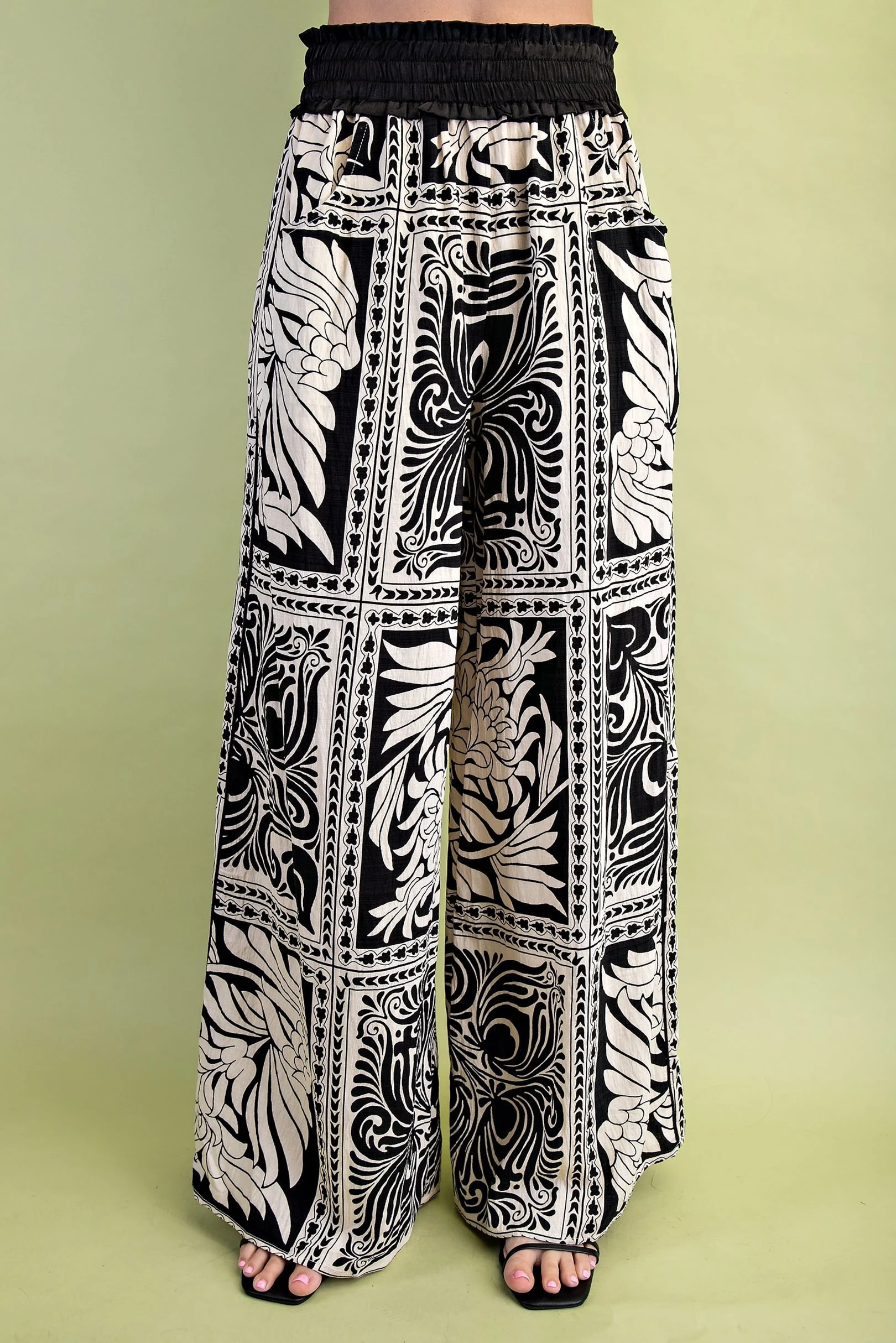 Marbled Bandanna Print Wide Leg Pants with a Satin Smocked Waist