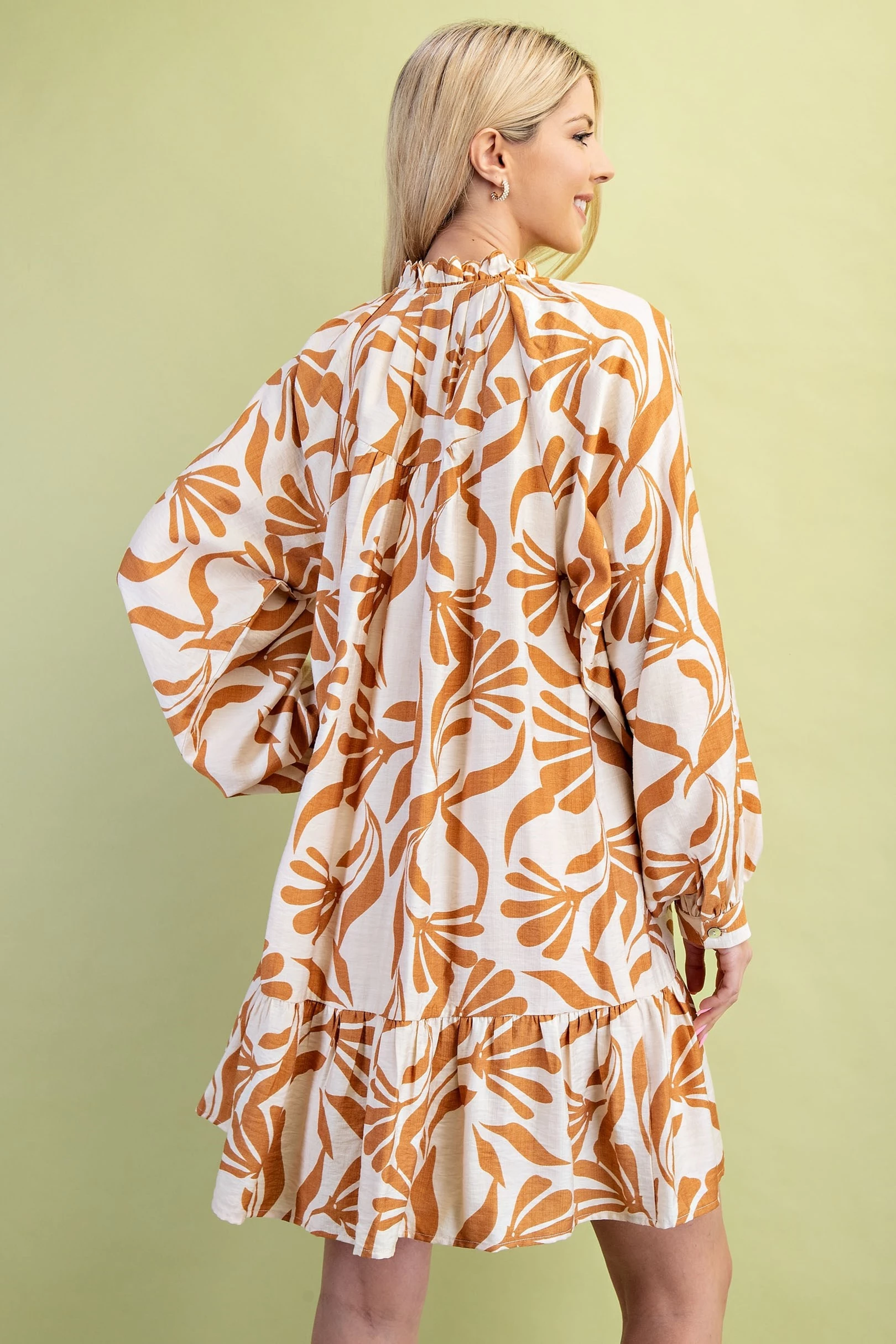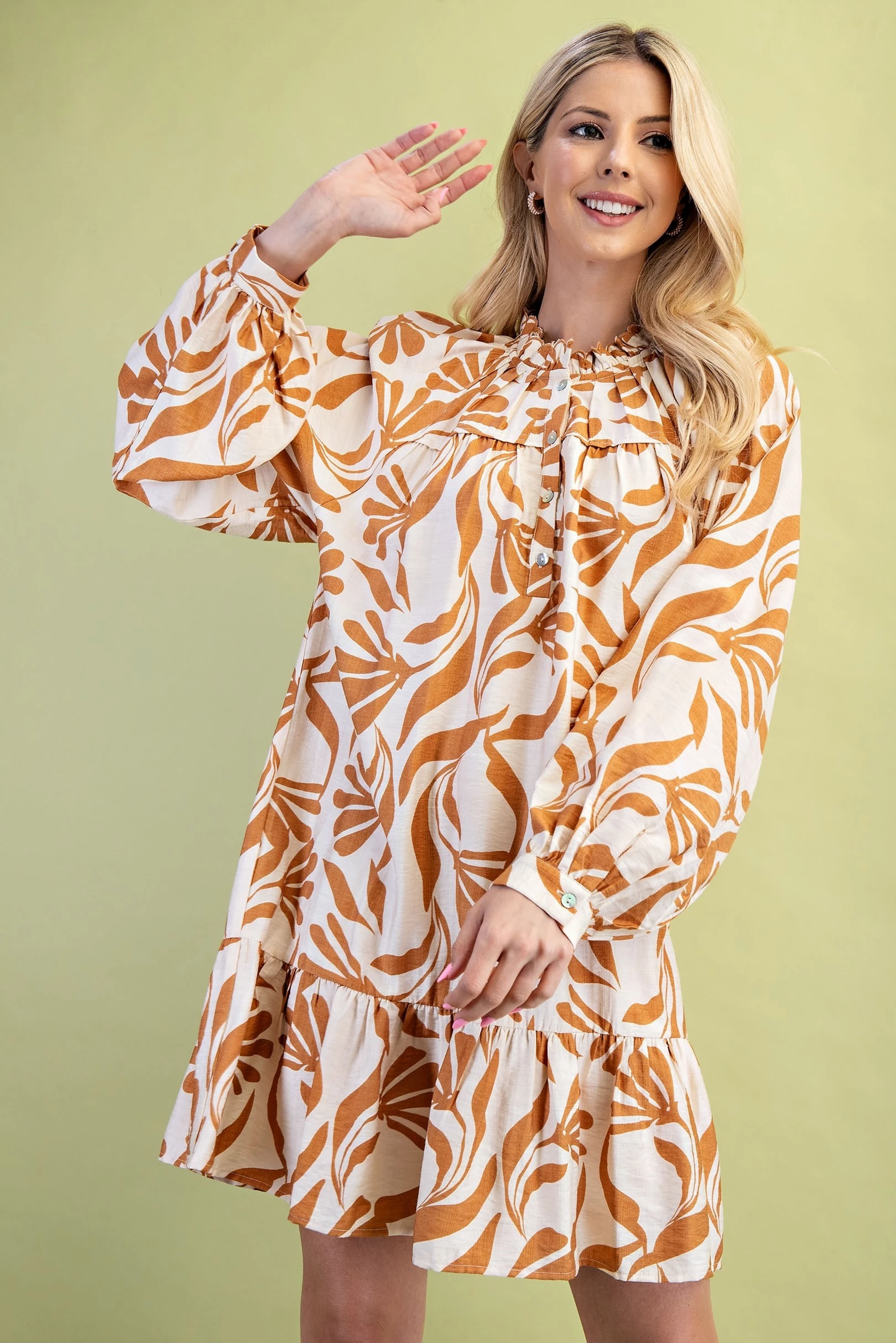 Printed Half Button Dress with Long Sleeves and a Scalloped Collar