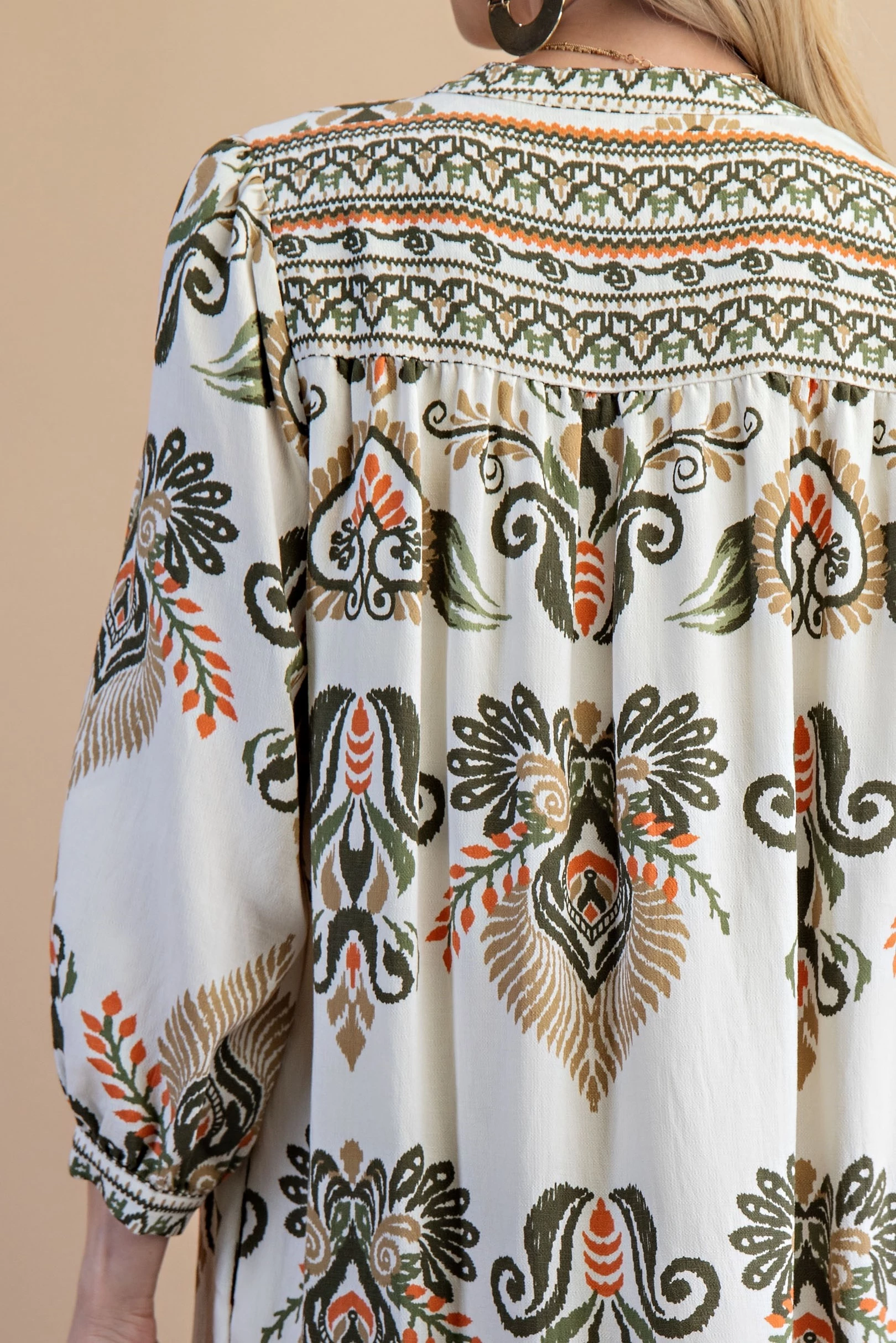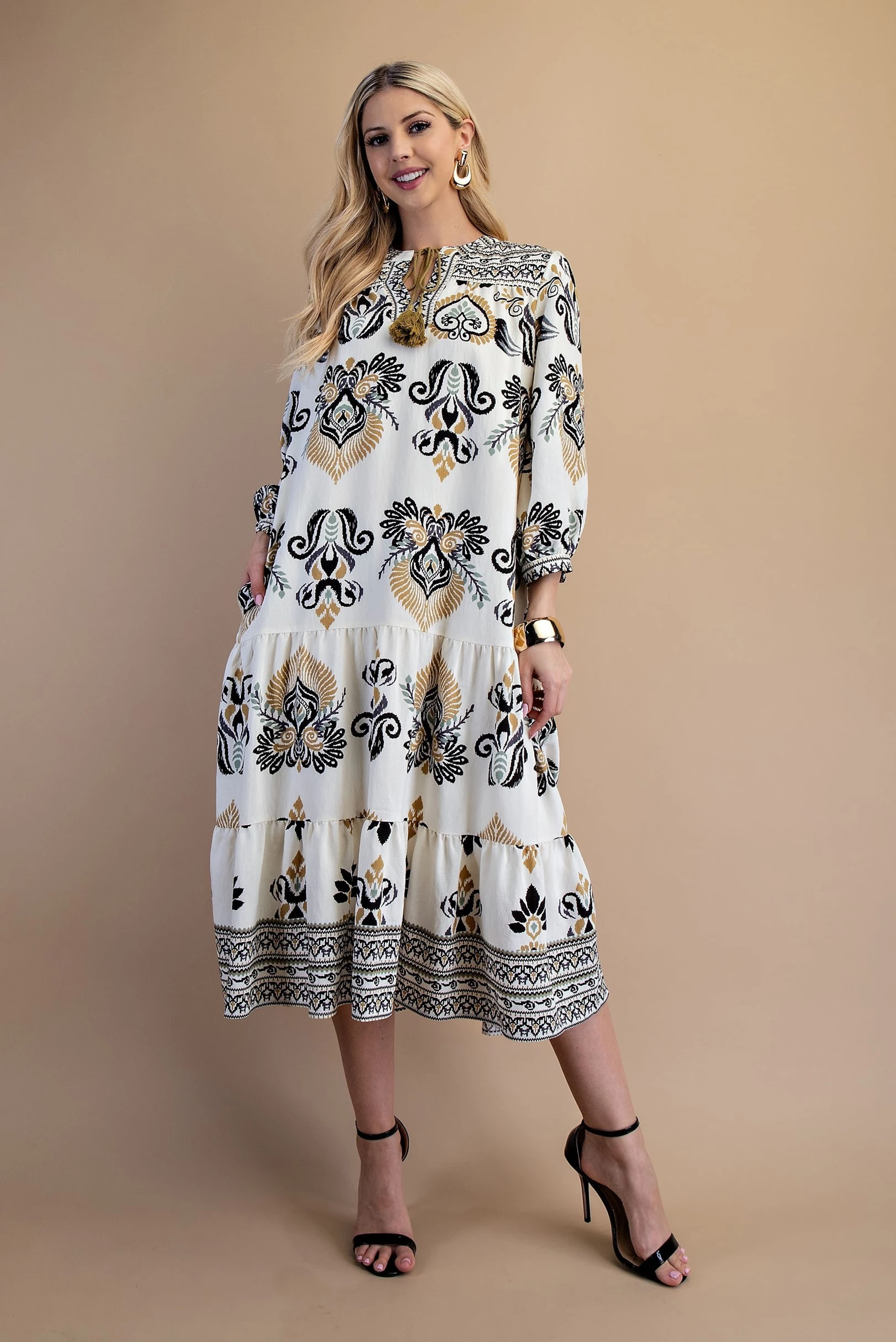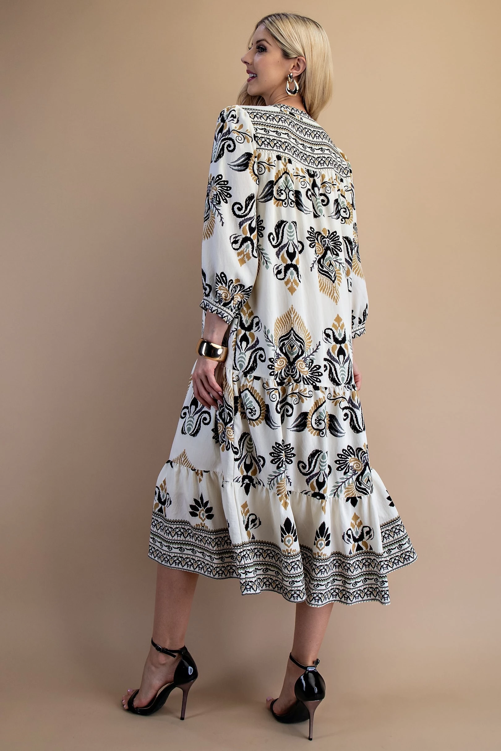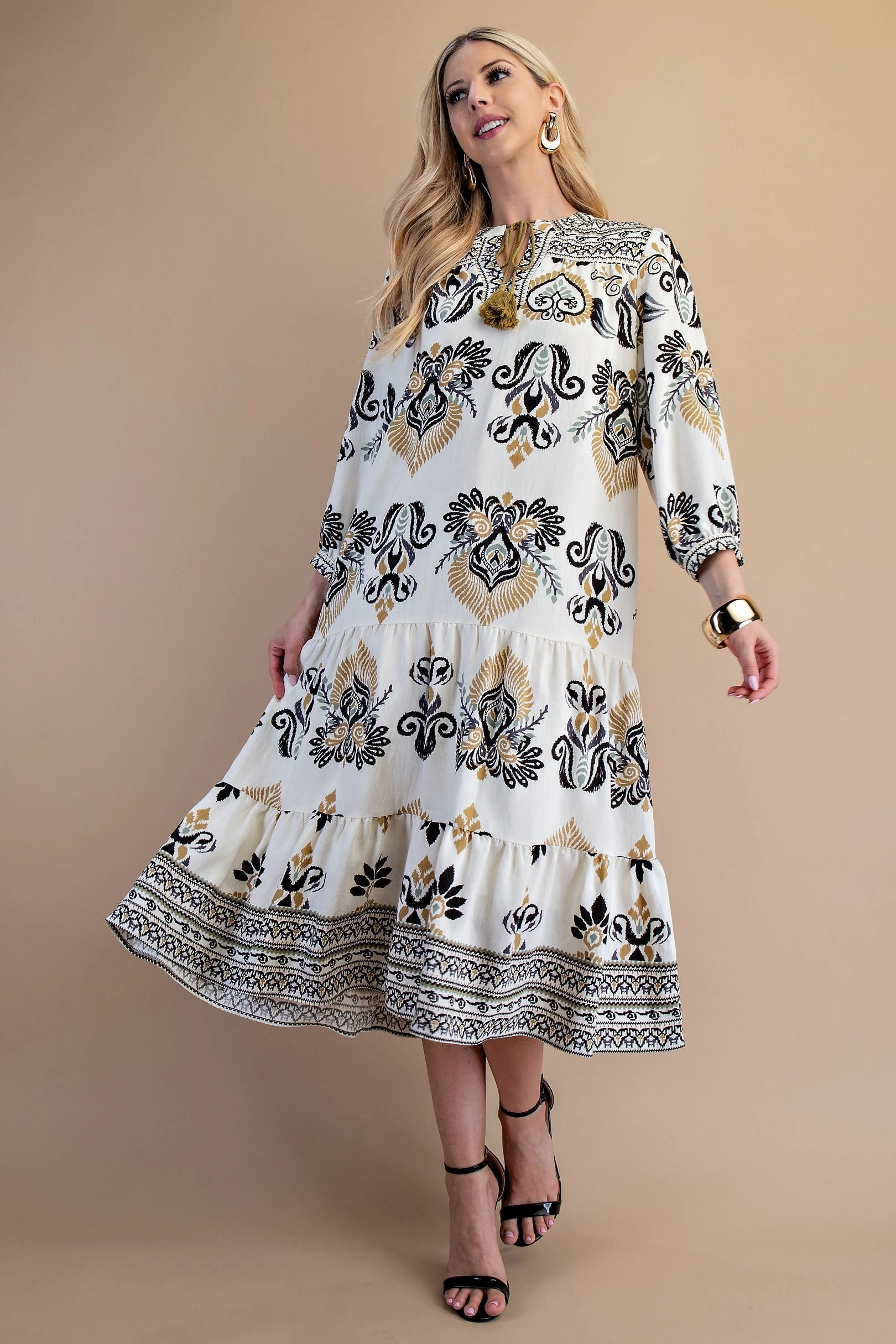 Printed Tiered 3/4 Length Sleeve Midi Dress with a Tassel Neck Tie