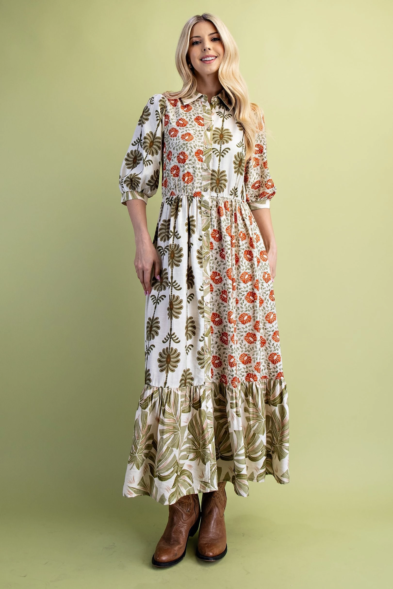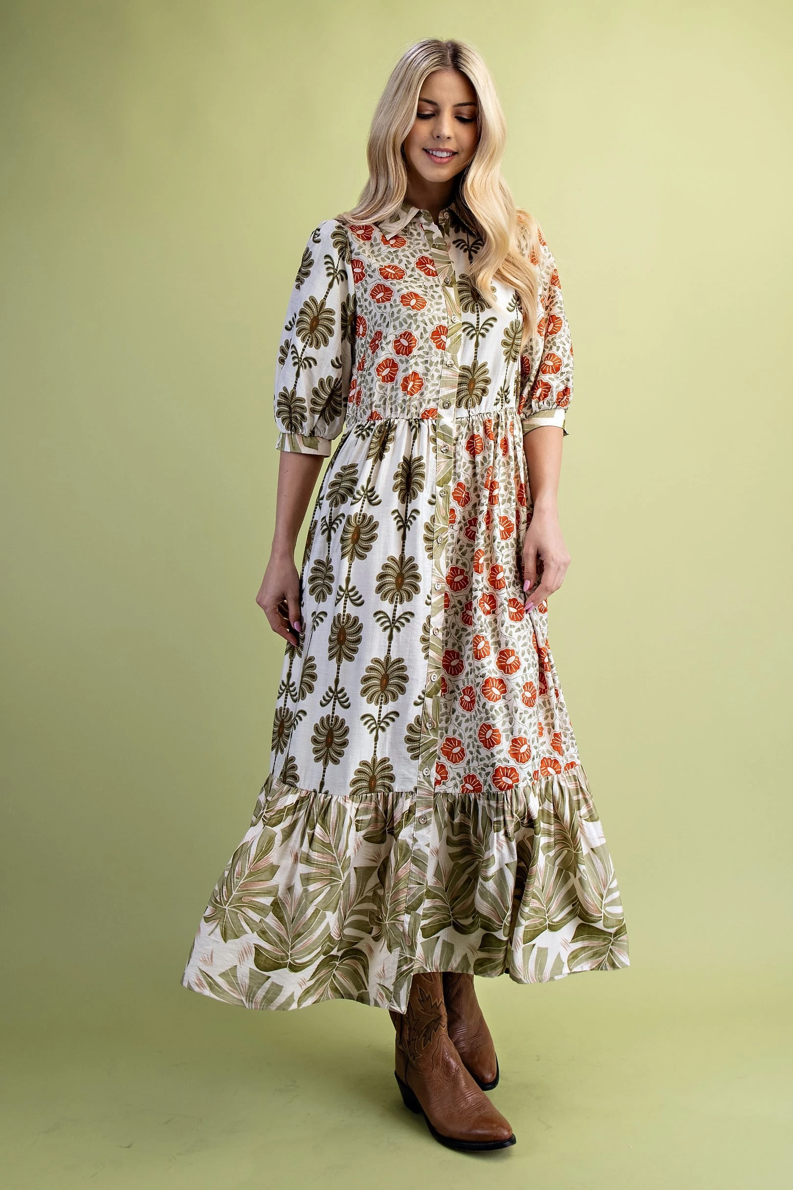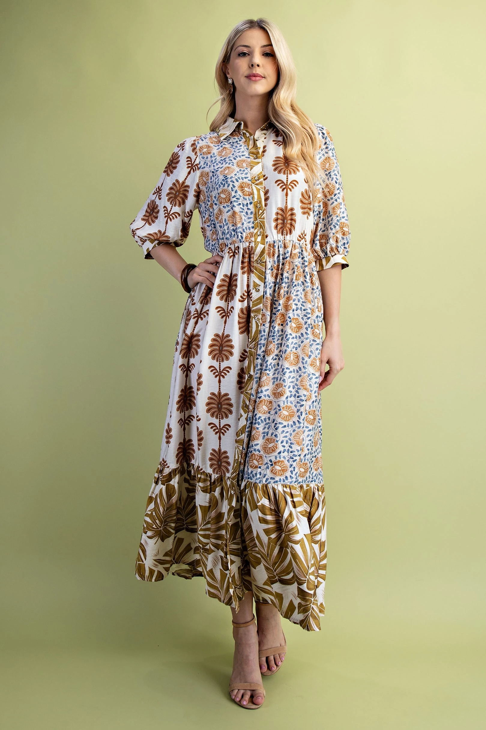 Mixed Print Shirt Dress with 1/2 Sleeves