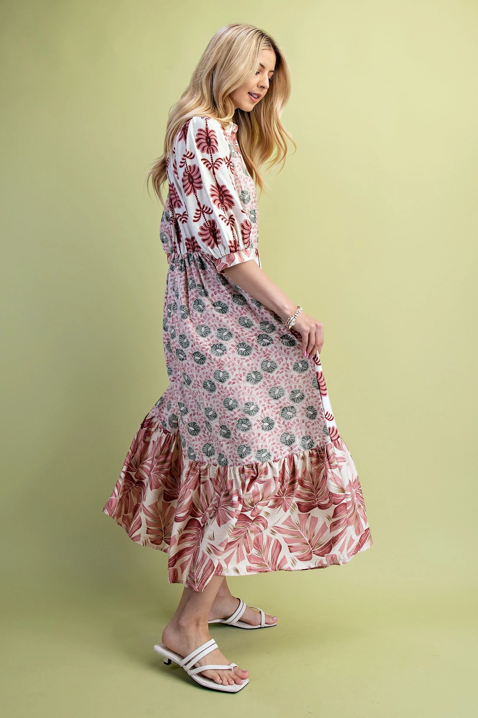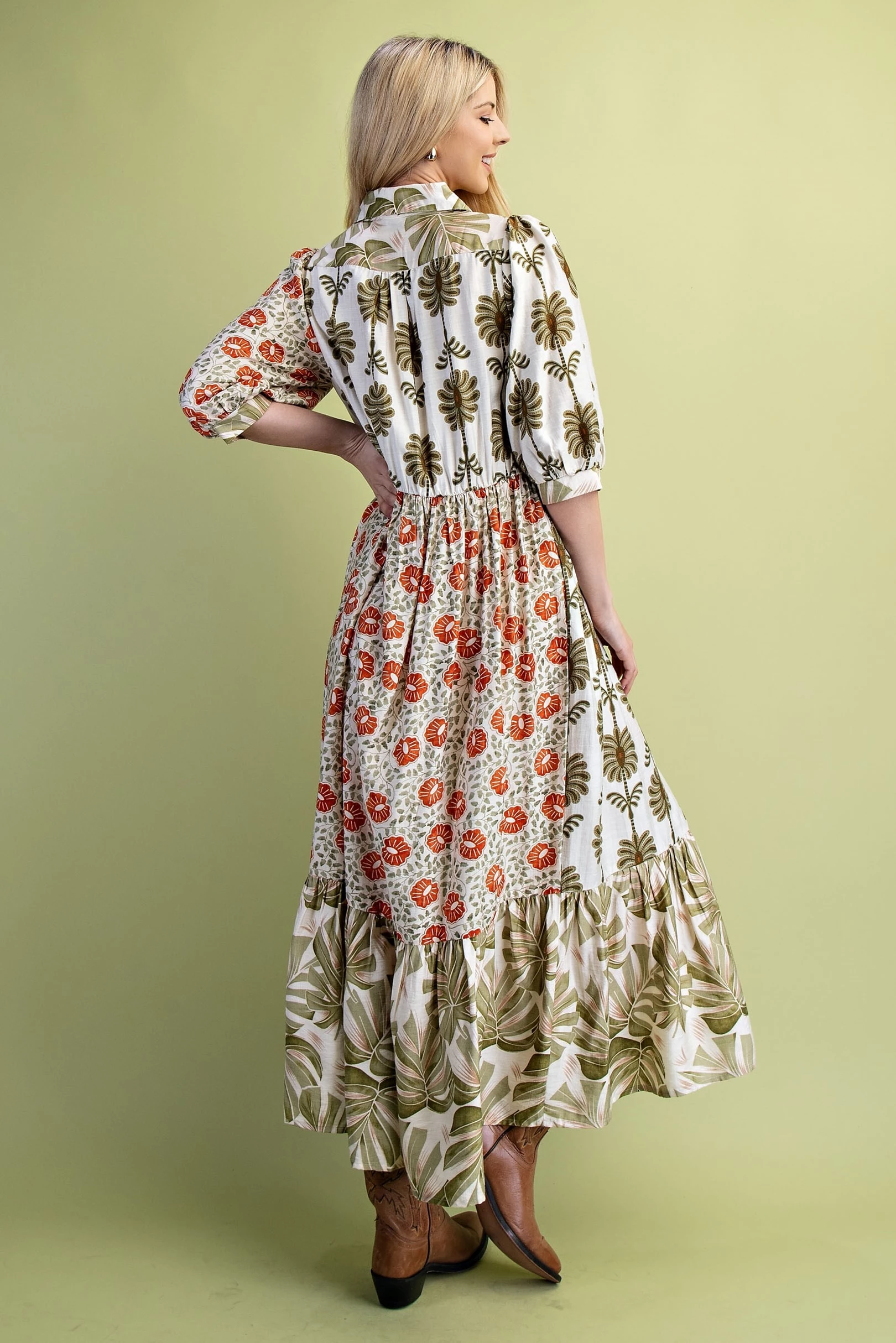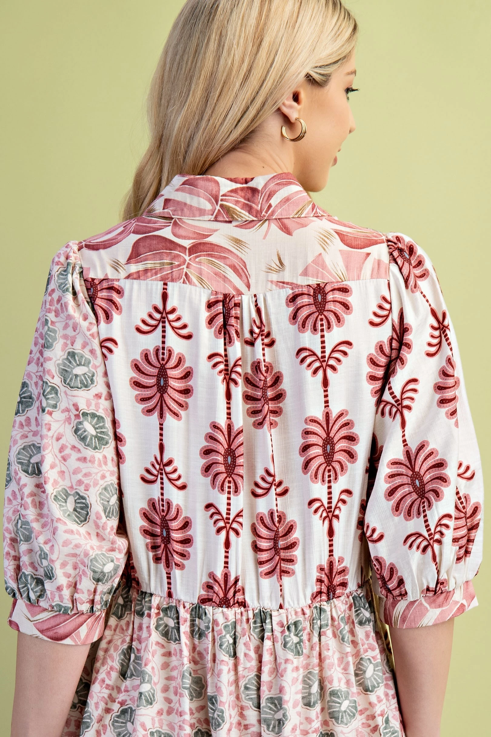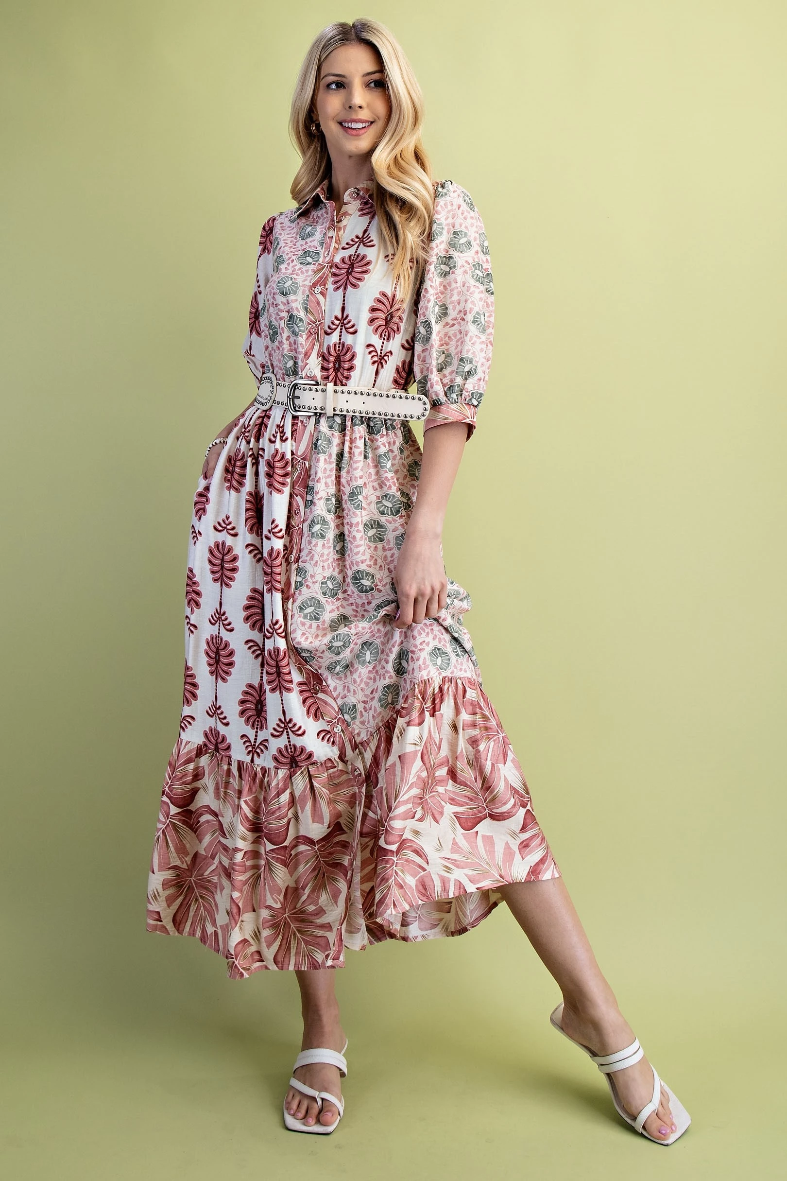 Mixed Print Shirt Dress with 1/2 Sleeves