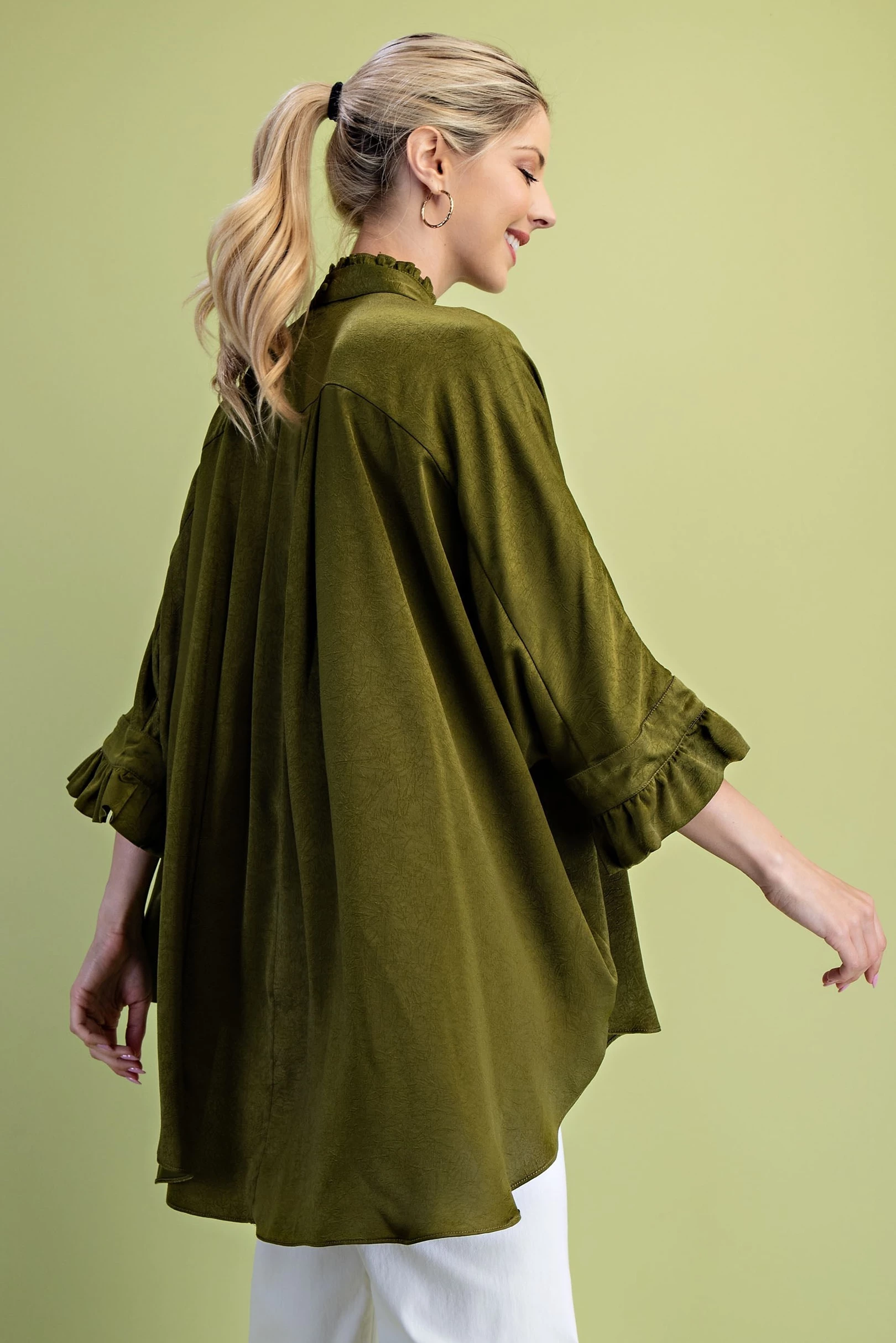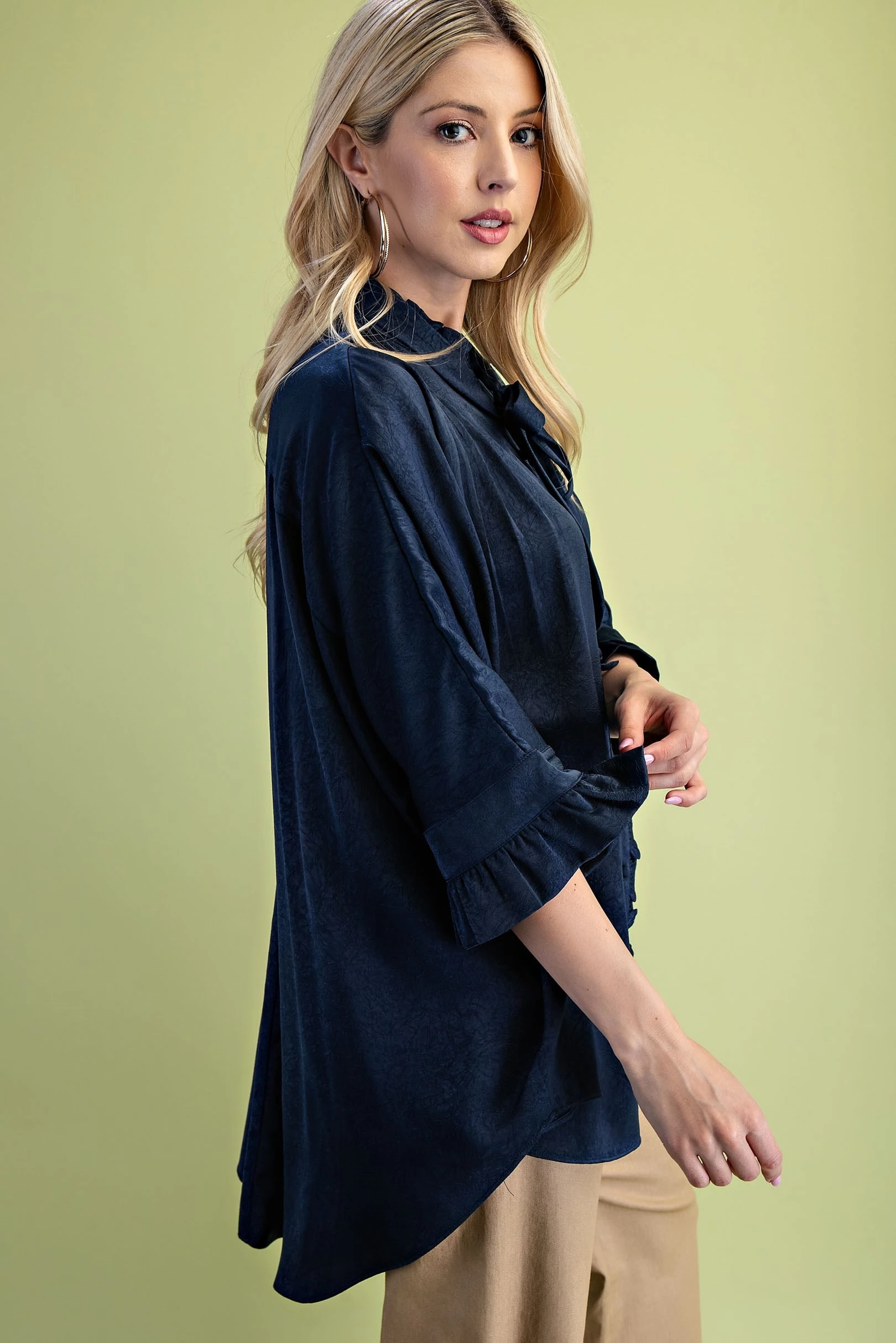 Ruffled Satin Button Down Blouse with a Detachable Neck Tie and Pintuck Details