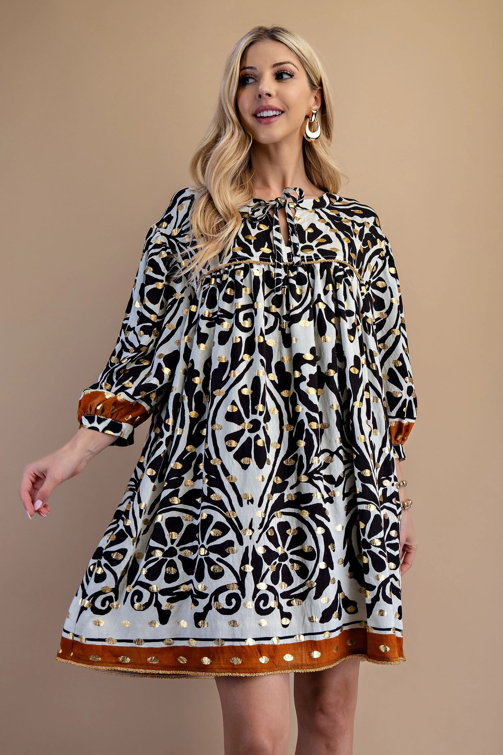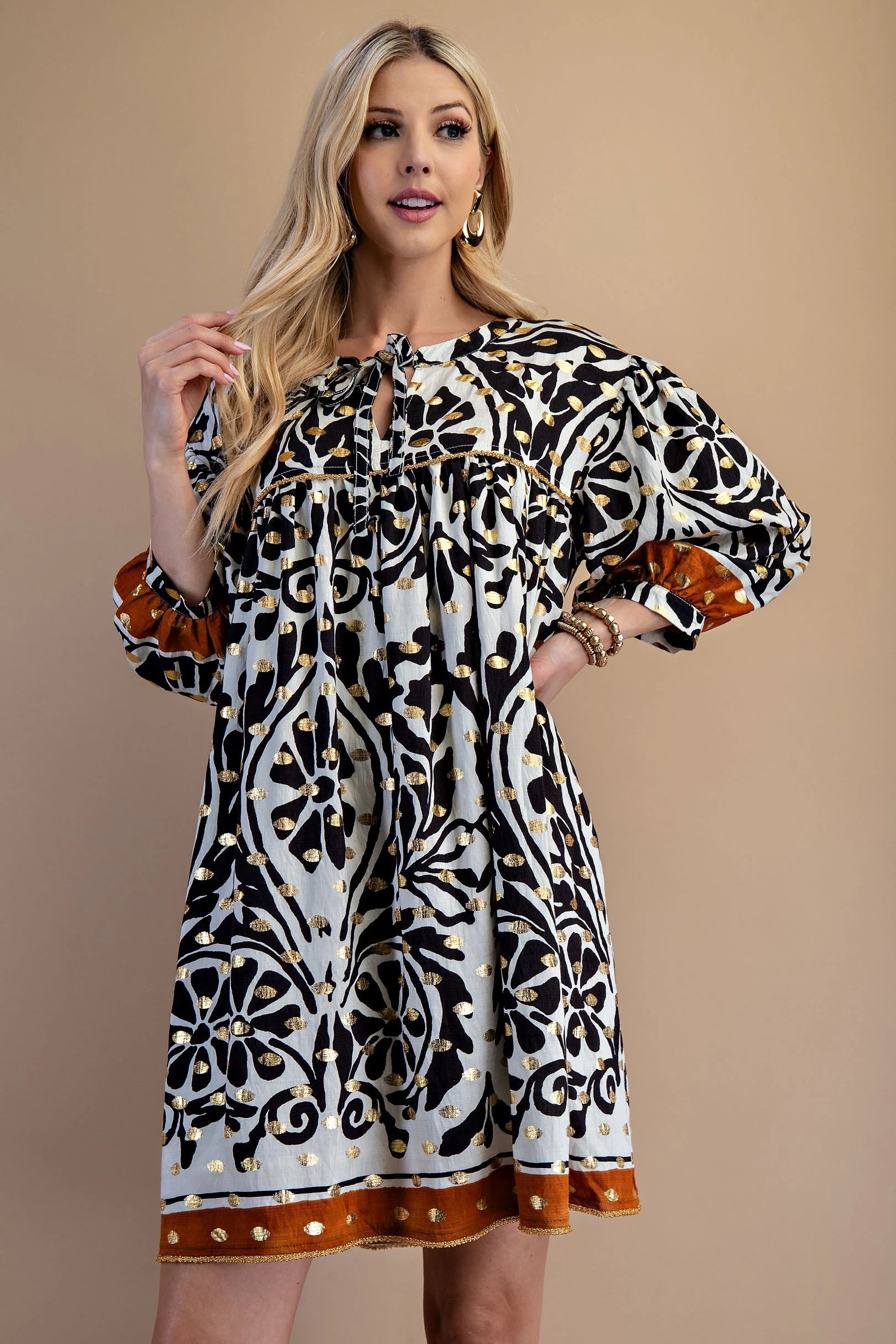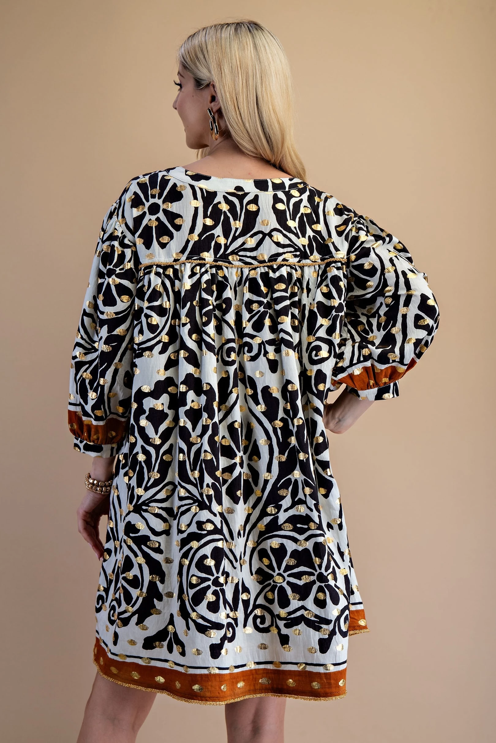 Printed Notch Neck Dress with Gathered Short Balloon Sleeves and Ric-Rac Trim Details.