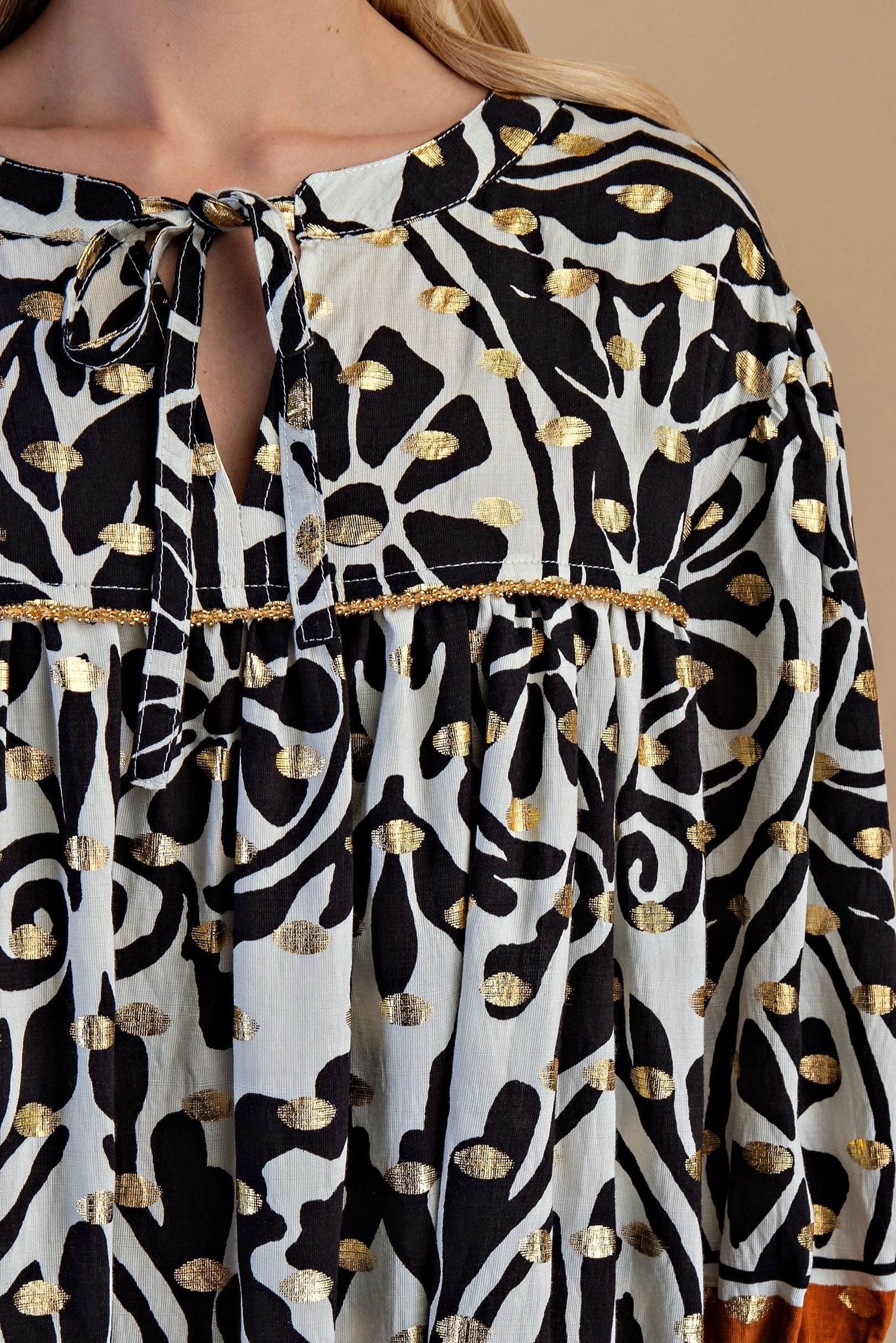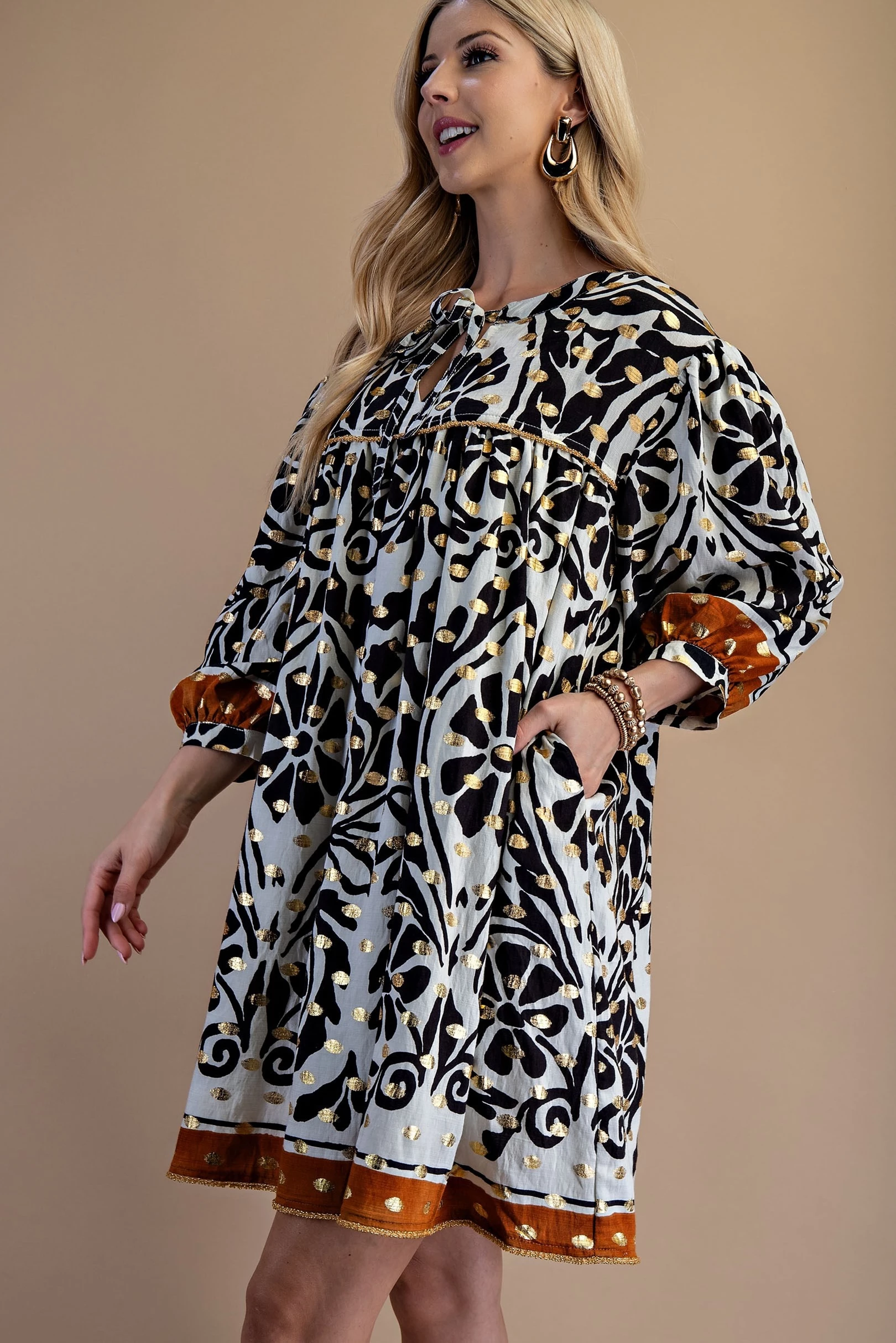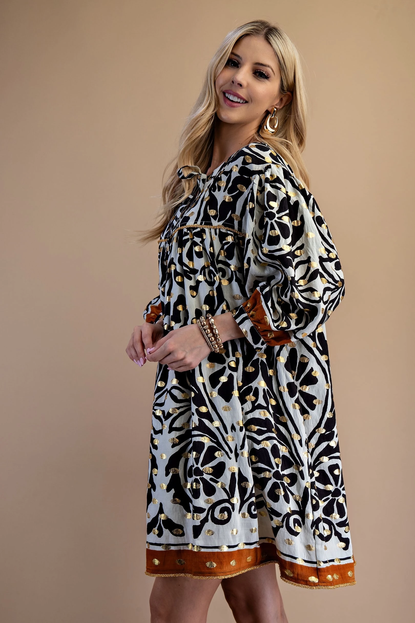 Printed Notch Neck Dress with Gathered Short Balloon Sleeves and Ric-Rac Trim Details.