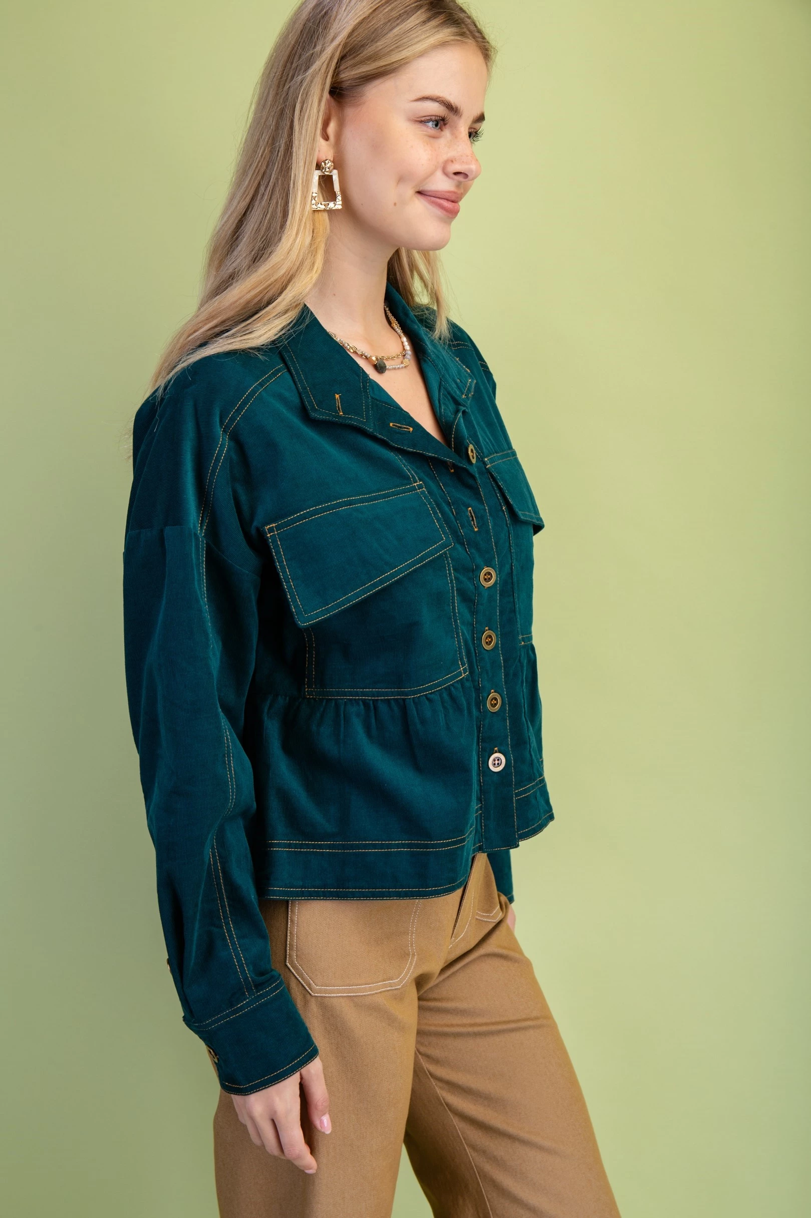 Corduroy Babydoll Style Button Up Jacket with a Mock Neck and Stitching Details
