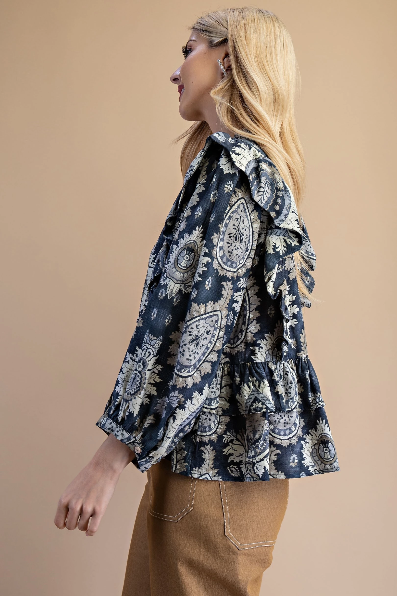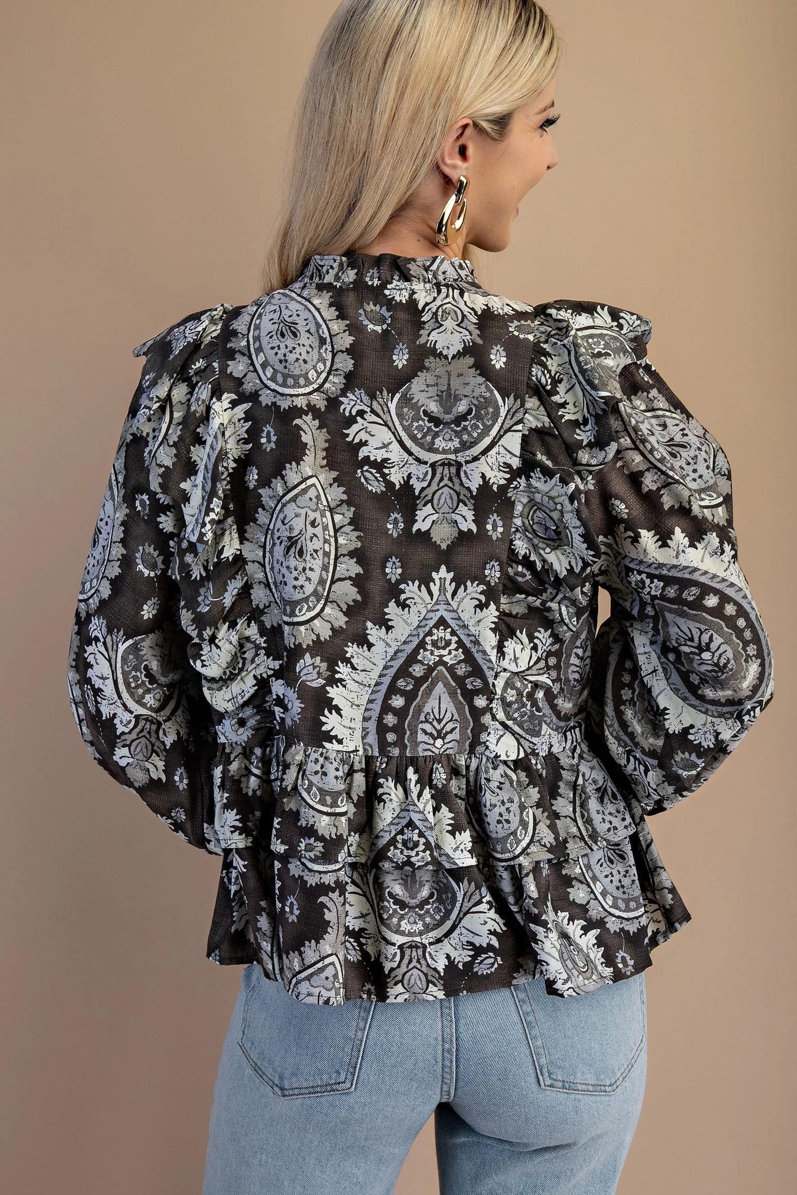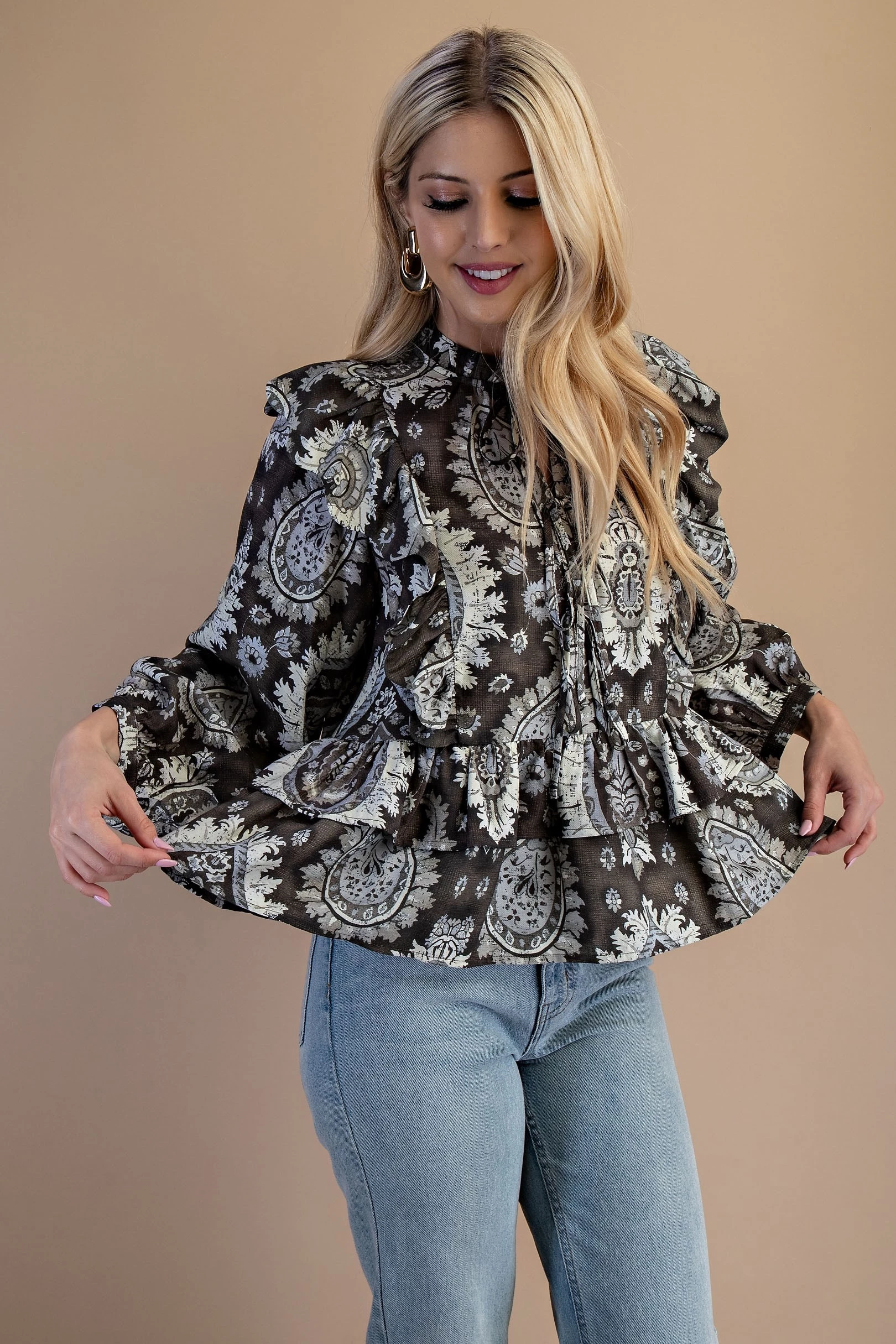 Vintage Paisley Tiered Ruffled Blouse with Ties in Front
